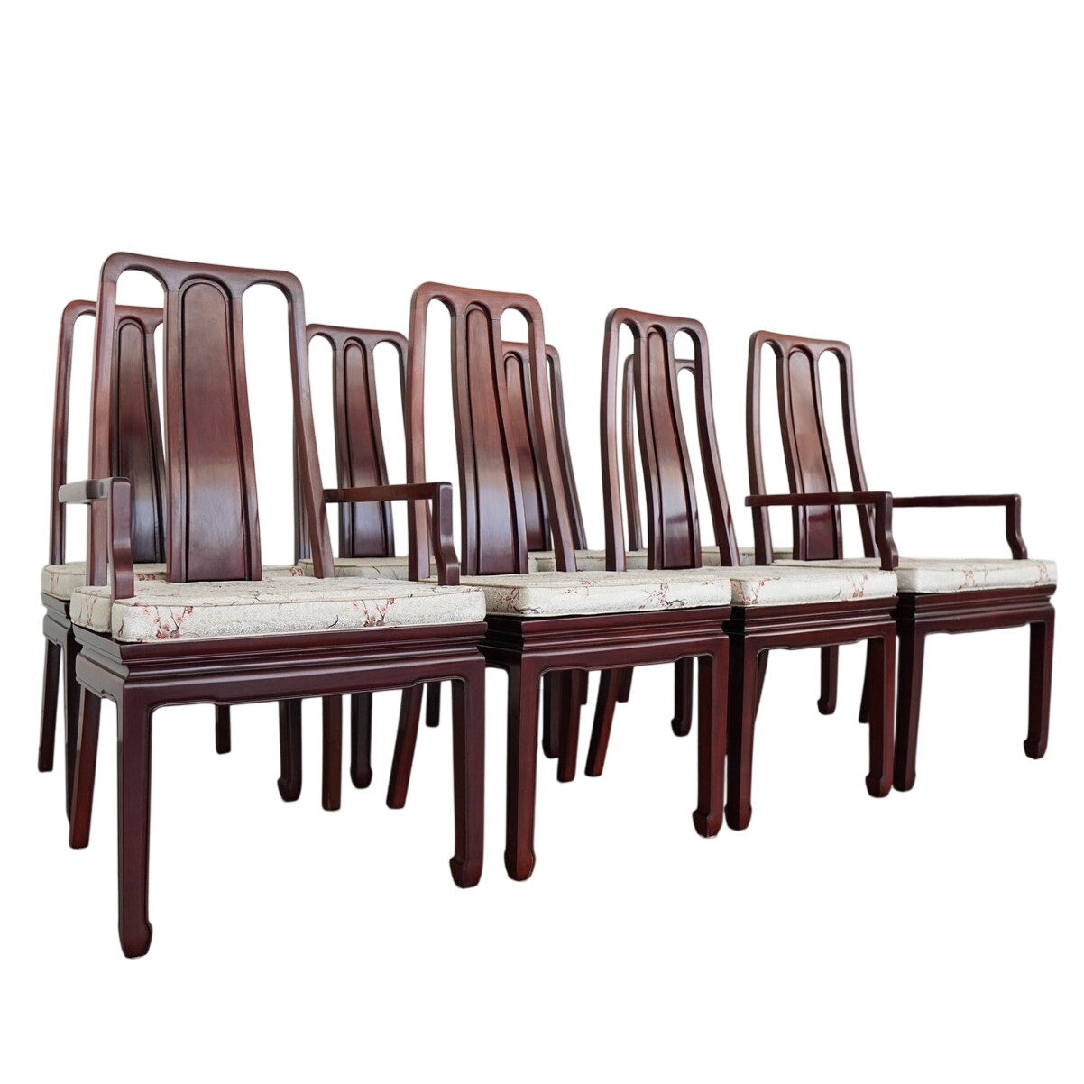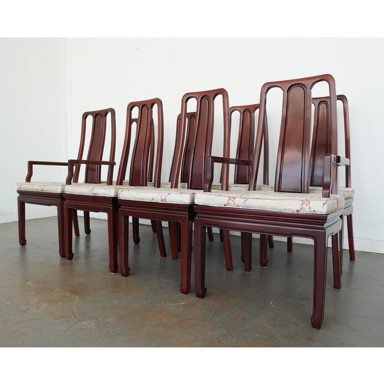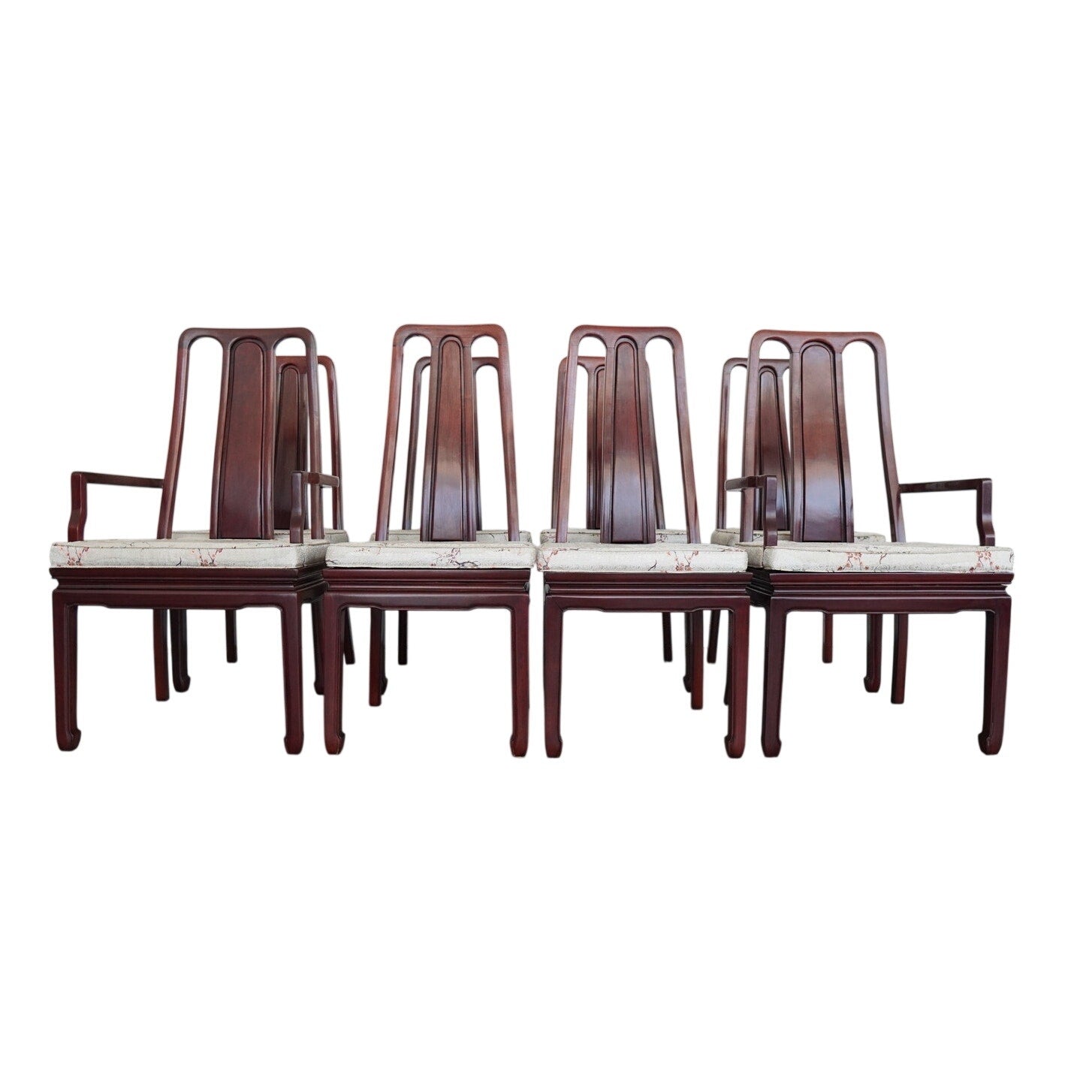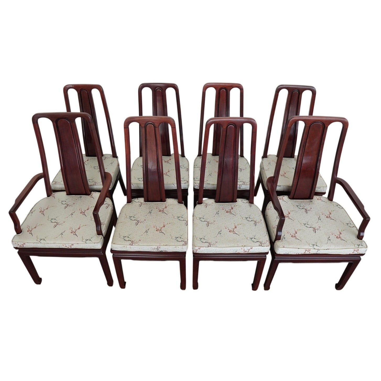 A striking vintage set of eight dining chairs featuring elegant Asian-style design elements, tall sculptural backs, and a beautifully toned reddish-brown wood finish. The set includes two armchairs and six side chairs, all with matching upholstered seats in a cream patterned fabric accented by delicate floral branch designs. The high backs and clean architectural lines give the chairs a refined presence, while the upholstery softens the look and adds subtle decorative detail. The design works especially well in interiors that mix traditional furnishings with chinoiserie, Hollywood Regency, or eclectic influences. A beautiful vintage set for everyday use, entertaining, or a design-forward restoration project.