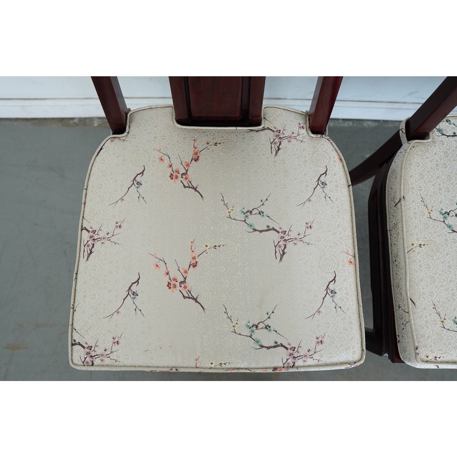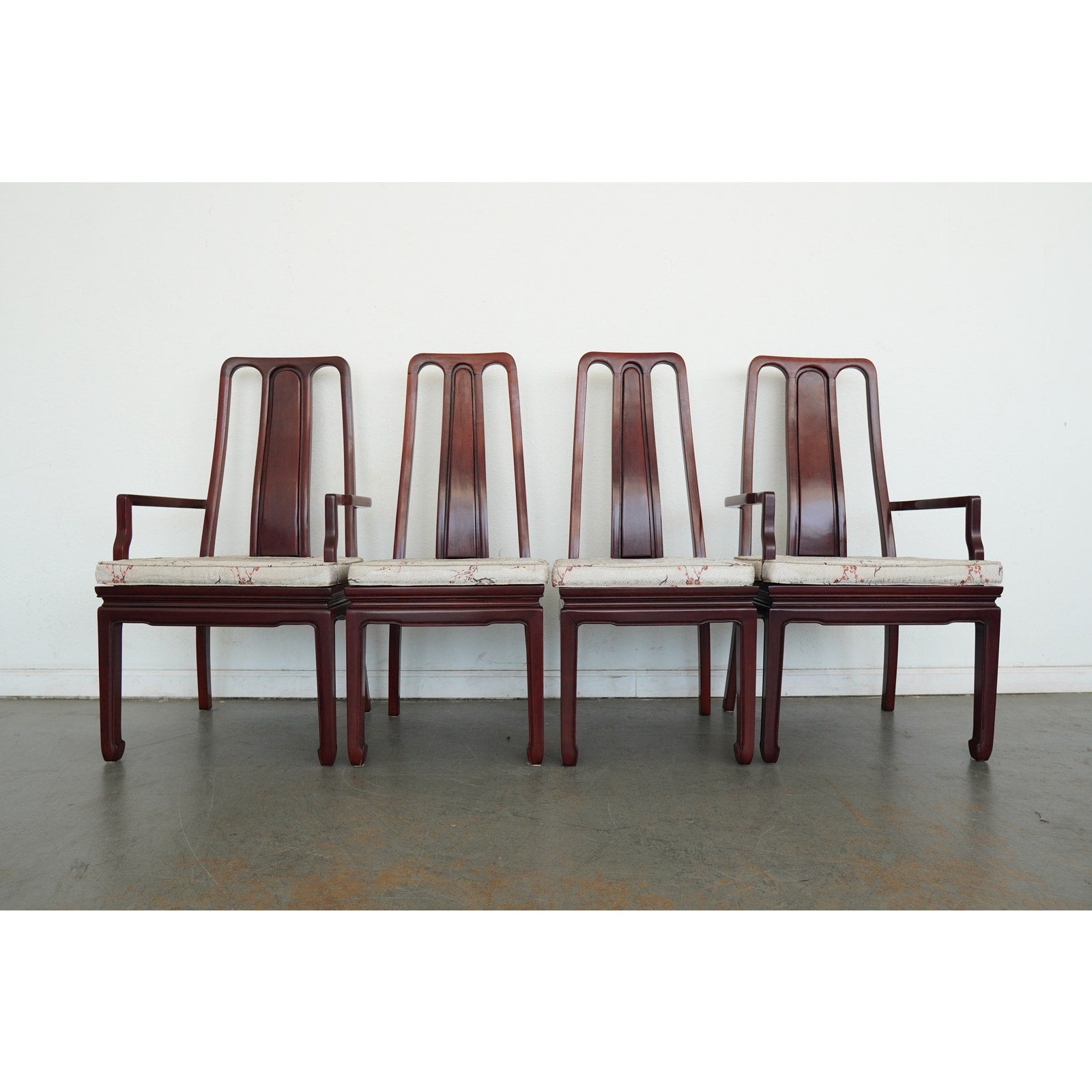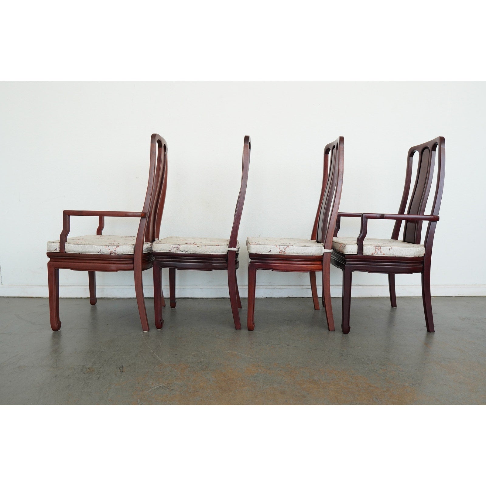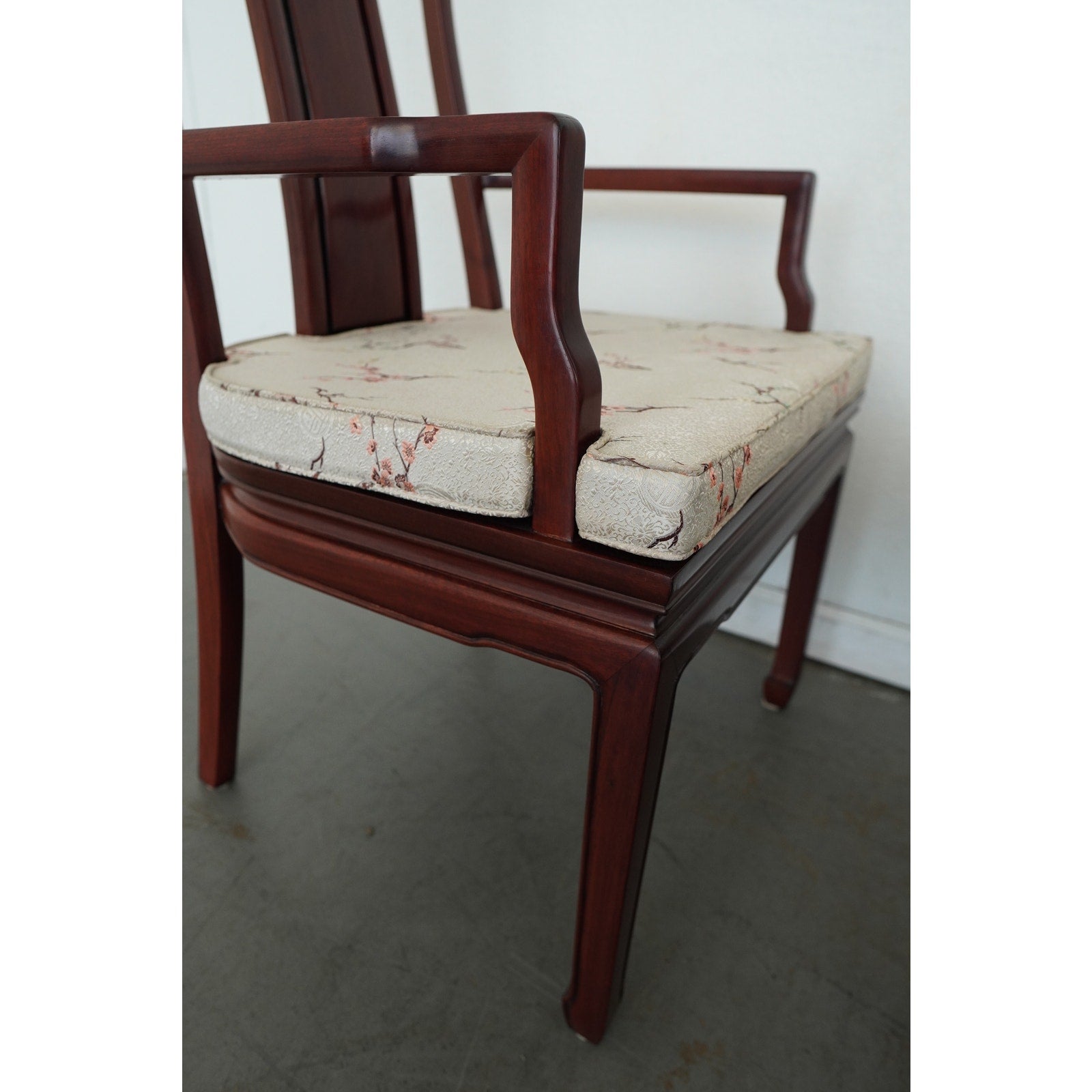 A striking vintage set of eight dining chairs featuring elegant Asian-style design elements, tall sculptural backs, and a beautifully toned reddish-brown wood finish. The set includes two armchairs and six side chairs, all with matching upholstered seats in a cream patterned fabric accented by delicate floral branch designs. The high backs and clean architectural lines give the chairs a refined presence, while the upholstery softens the look and adds subtle decorative detail. The design works especially well in interiors that mix traditional furnishings with chinoiserie, Hollywood Regency, or eclectic influences. A beautiful vintage set for everyday use, entertaining, or a design-forward restoration project.