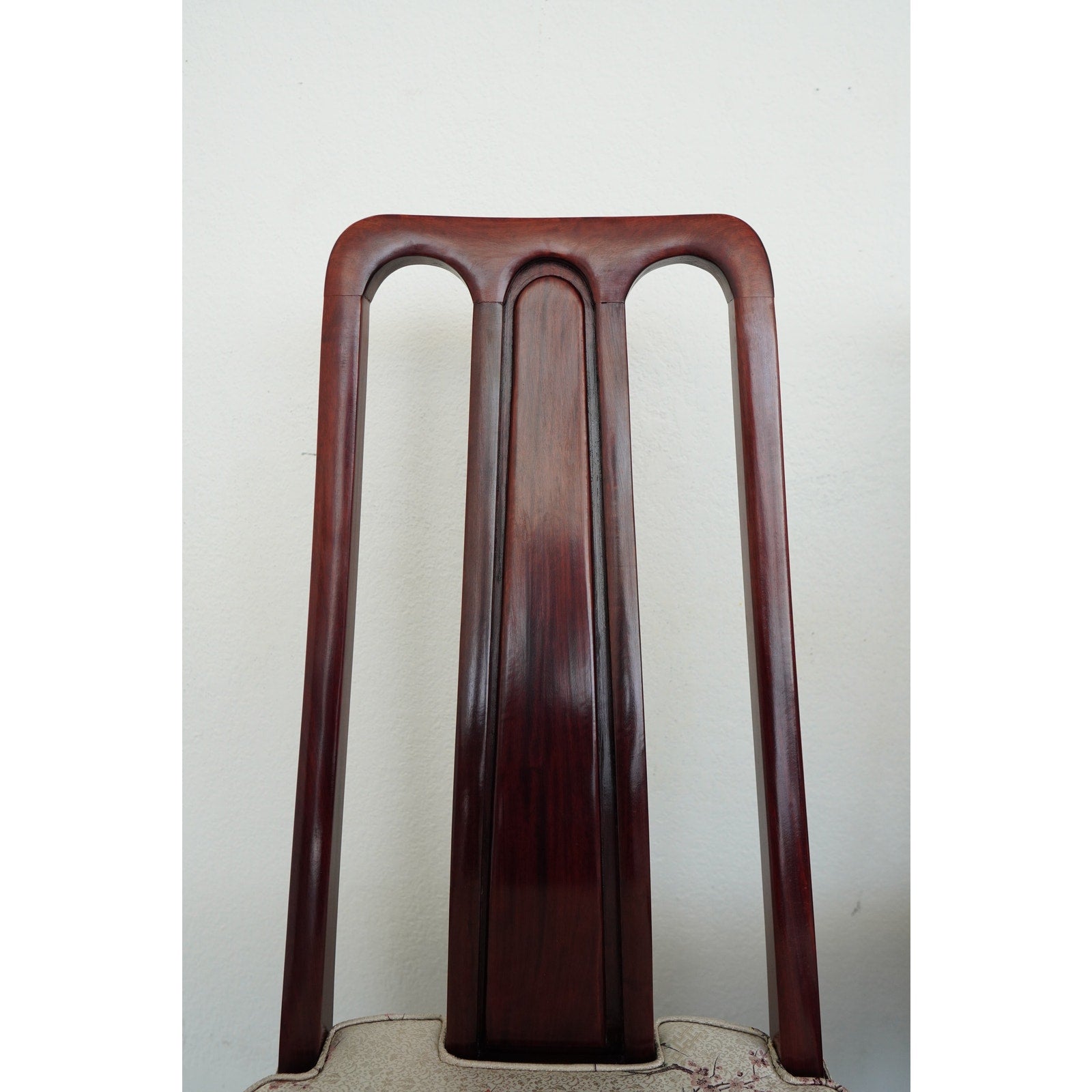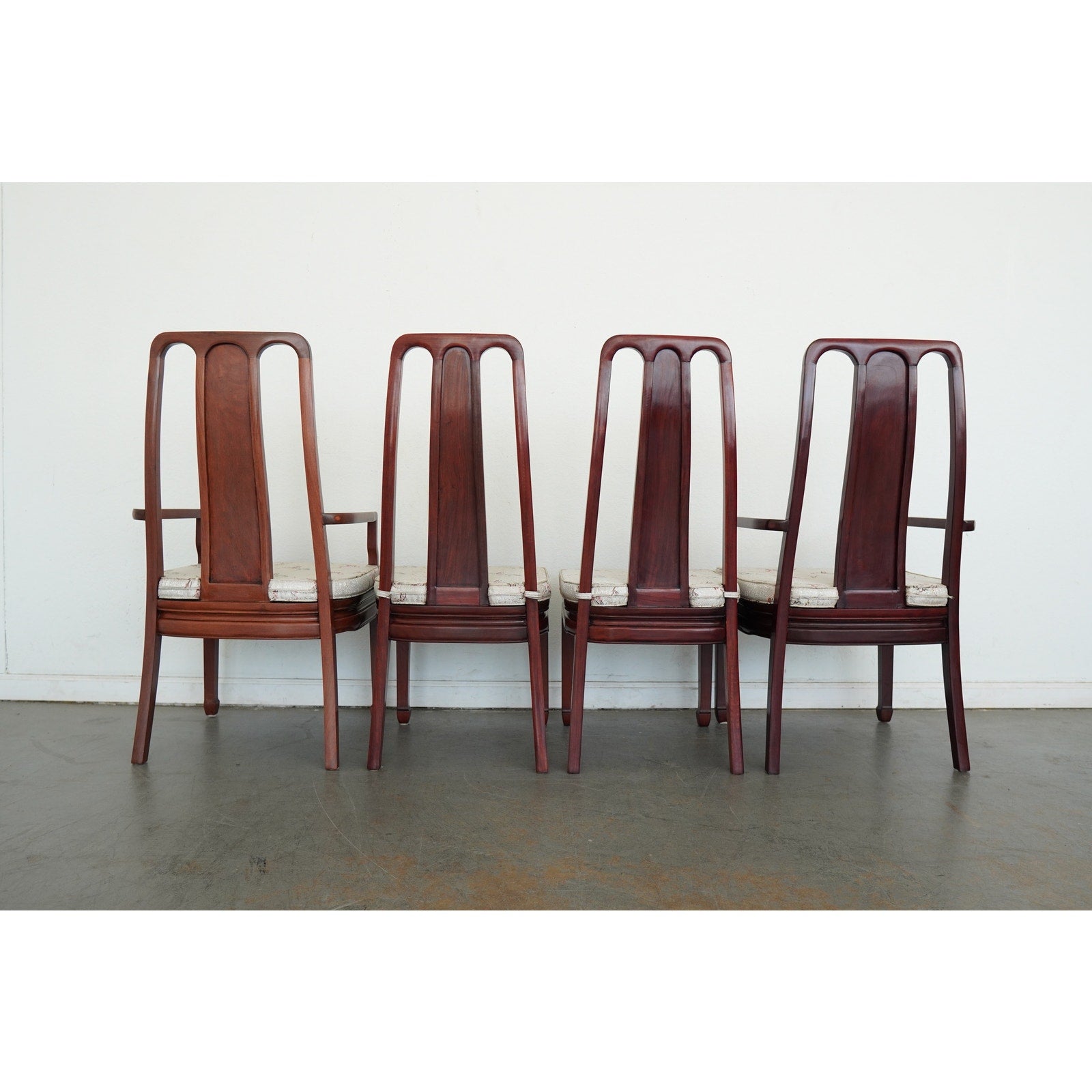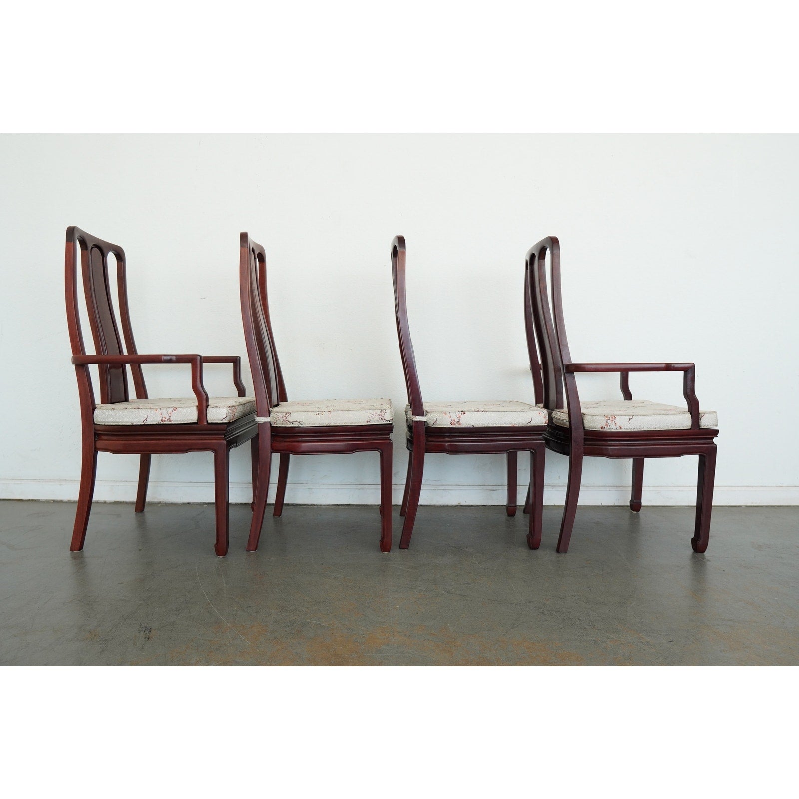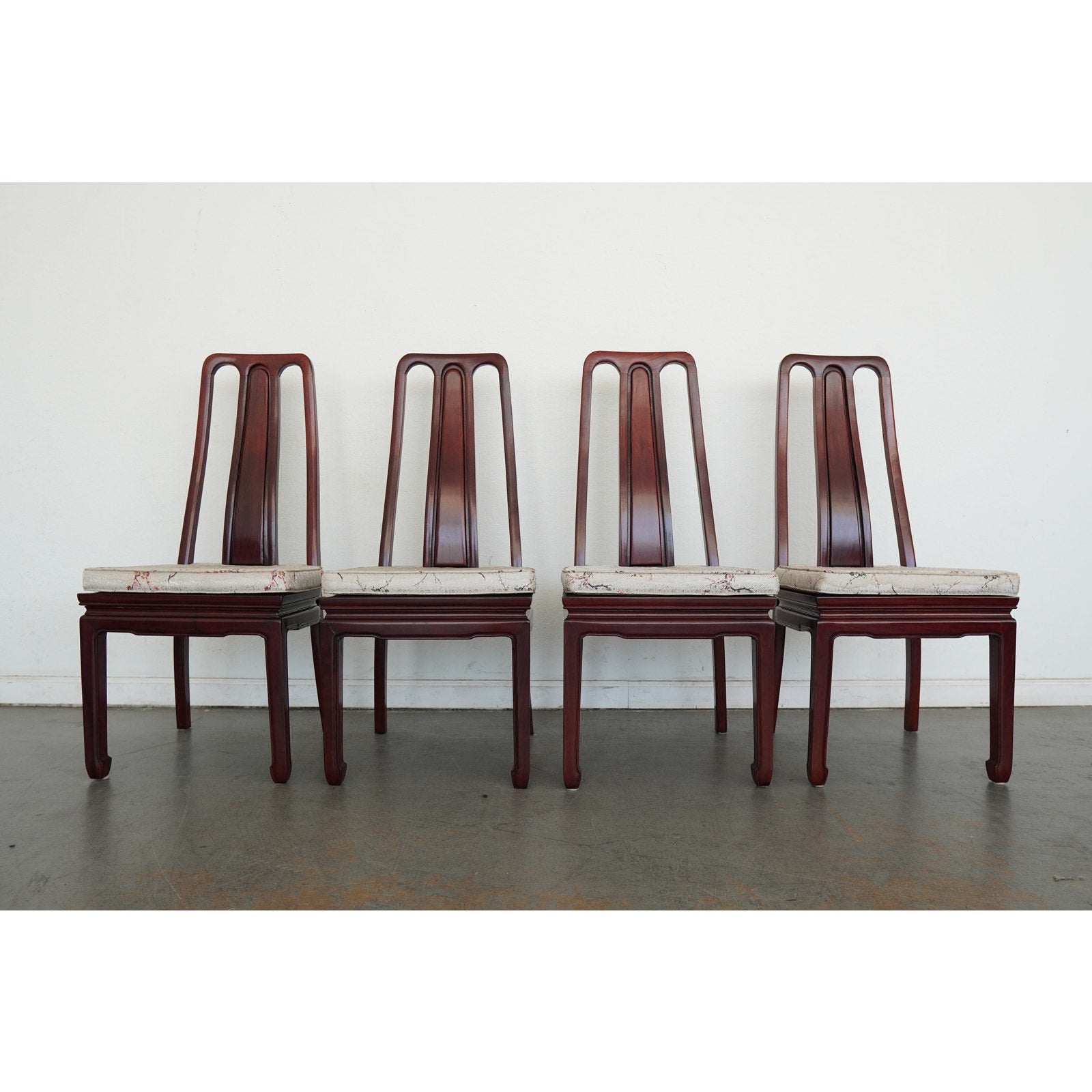 A striking vintage set of eight dining chairs featuring elegant Asian-style design elements, tall sculptural backs, and a beautifully toned reddish-brown wood finish. The set includes two armchairs and six side chairs, all with matching upholstered seats in a cream patterned fabric accented by delicate floral branch designs. The high backs and clean architectural lines give the chairs a refined presence, while the upholstery softens the look and adds subtle decorative detail. The design works especially well in interiors that mix traditional furnishings with chinoiserie, Hollywood Regency, or eclectic influences. A beautiful vintage set for everyday use, entertaining, or a design-forward restoration project.