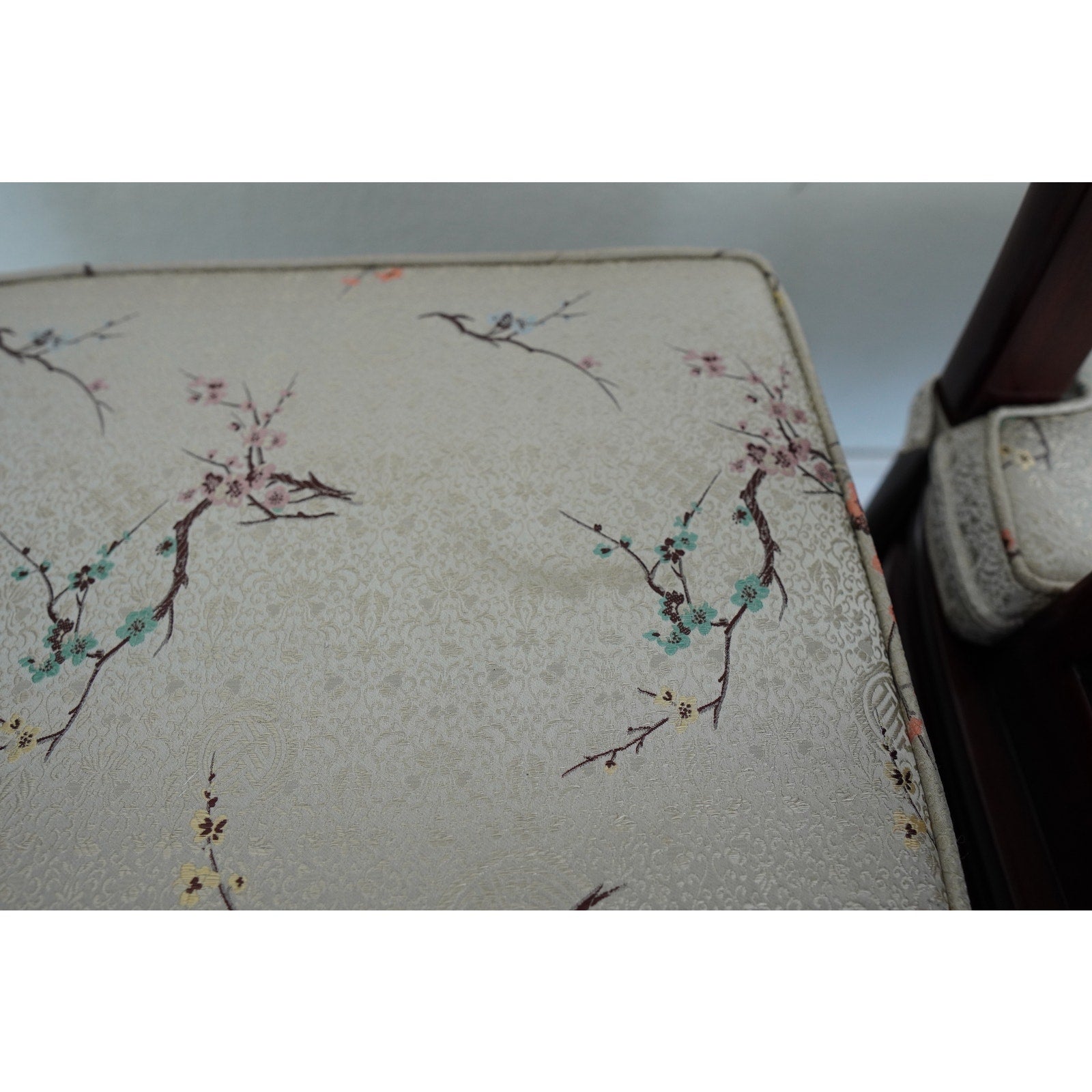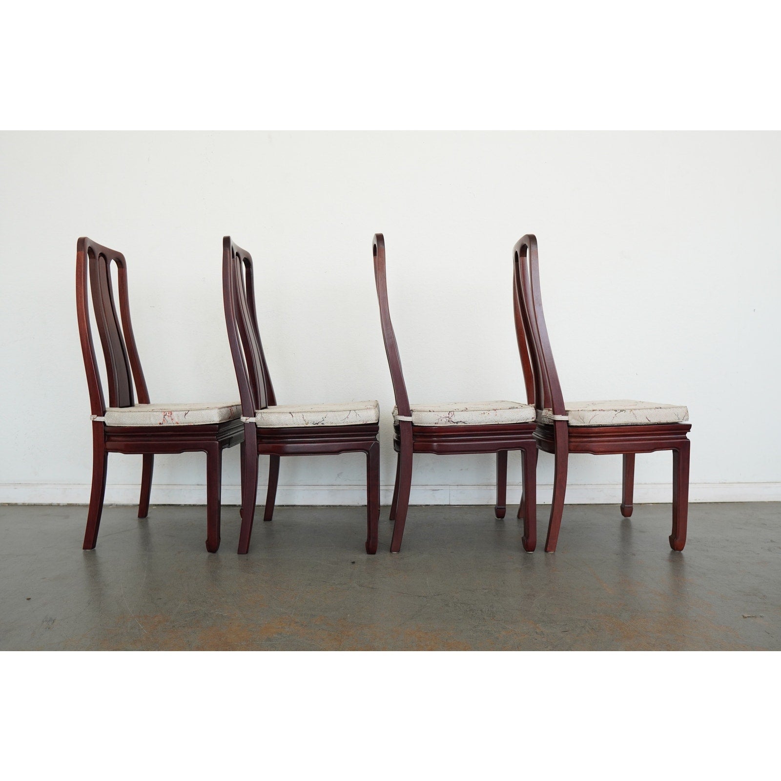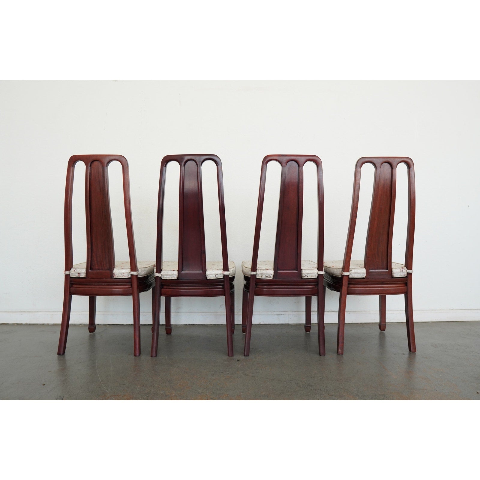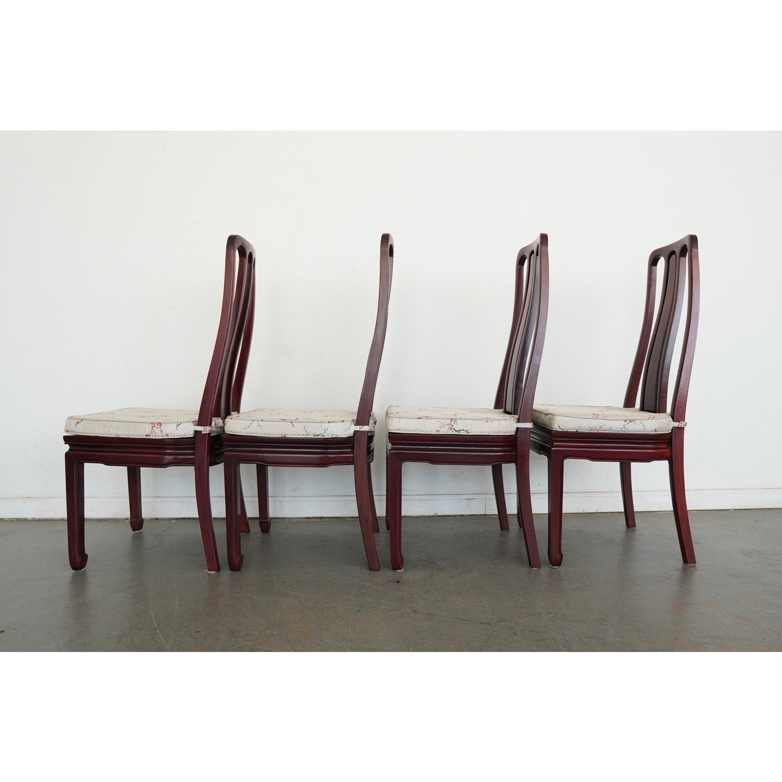 A striking vintage set of eight dining chairs featuring elegant Asian-style design elements, tall sculptural backs, and a beautifully toned reddish-brown wood finish. The set includes two armchairs and six side chairs, all with matching upholstered seats in a cream patterned fabric accented by delicate floral branch designs. The high backs and clean architectural lines give the chairs a refined presence, while the upholstery softens the look and adds subtle decorative detail. The design works especially well in interiors that mix traditional furnishings with chinoiserie, Hollywood Regency, or eclectic influences. A beautiful vintage set for everyday use, entertaining, or a design-forward restoration project.