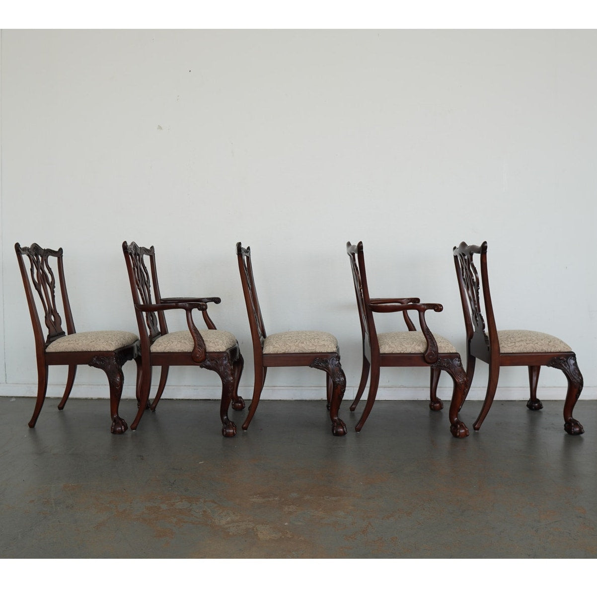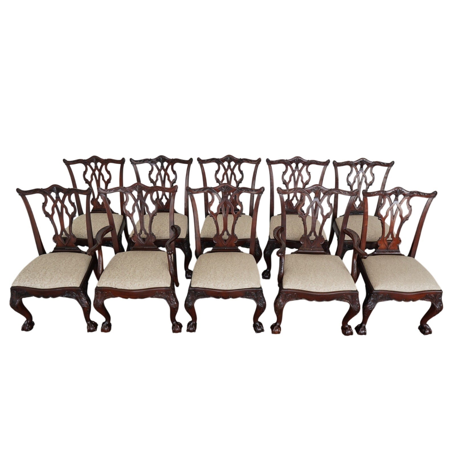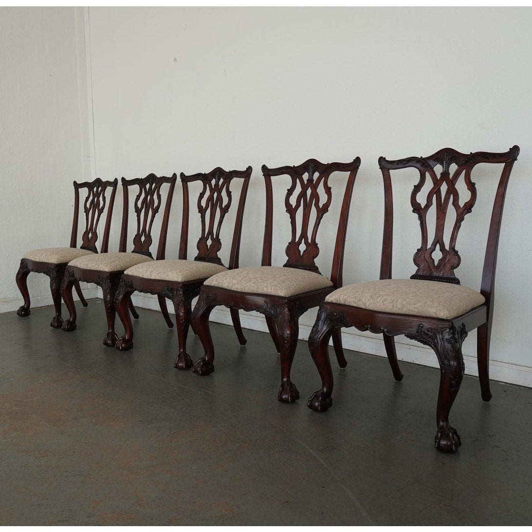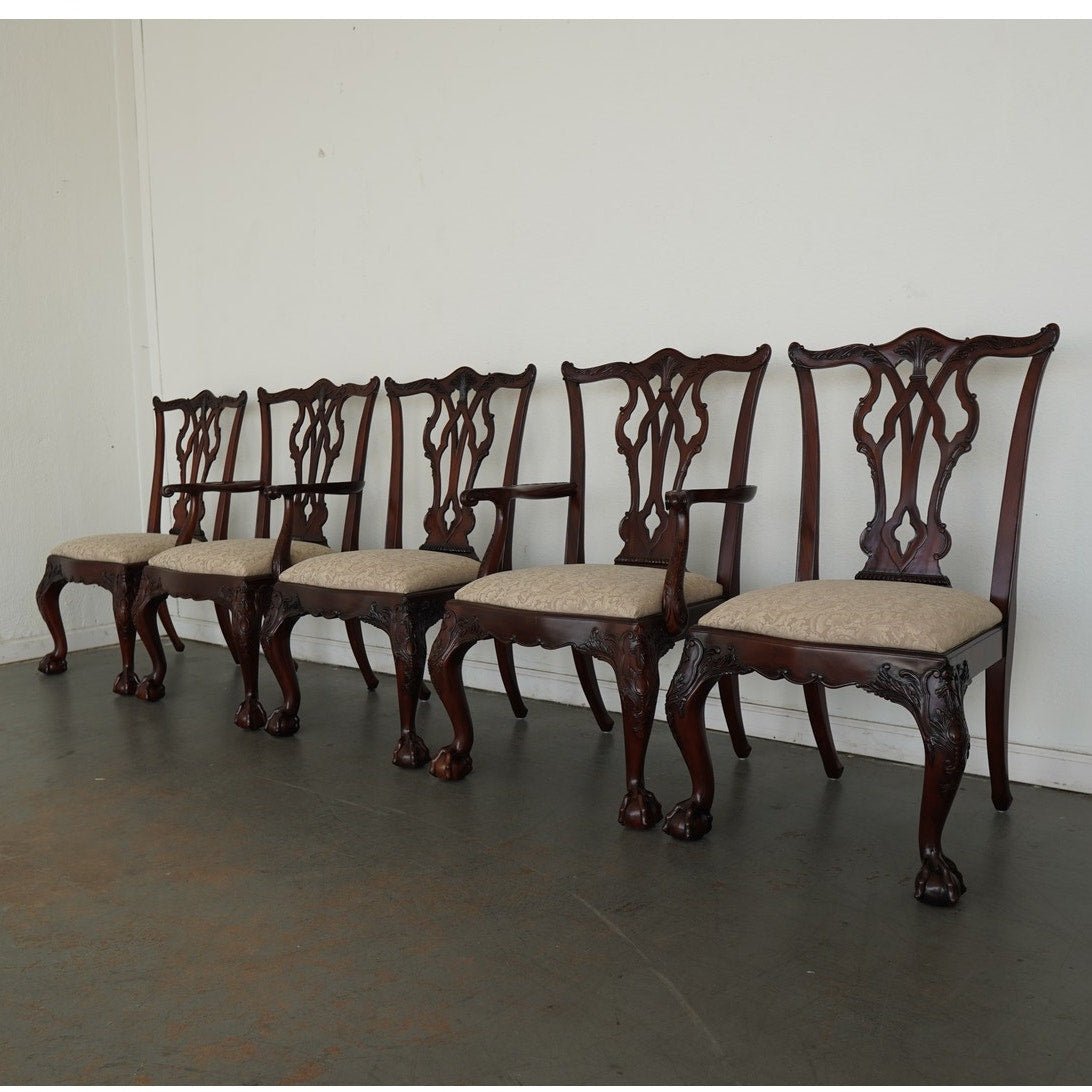 This vintage set of ten dining chairs reflects the kind of craftsmanship and detail associated with high-end American furniture production of the late 20th century. The set includes two armchairs and eight side chairs, all crafted in richly finished mahogany with deeply carved frames, elegant pierced splat backs, and beautifully shaped cabriole legs terminating in claw-and-ball feet. The seats are upholstered in a neutral patterned fabric that complements the warm tones of the wood and allows the carved detailing to remain the focal point. Both Henredon and Maitland-Smith labels are present on the undersides, which is not uncommon in vintage furniture and often indicates a collaborative production, shared design line, or manufacturing partnership during that period—combining Henredon’s reputation for quality construction with Maitland-Smith’s decorative and design-forward influence. The result is a refined, substantial dining set that balances classic formality with visual interest, making it well suited for traditional interiors or as a statement contrast in more eclectic spaces.