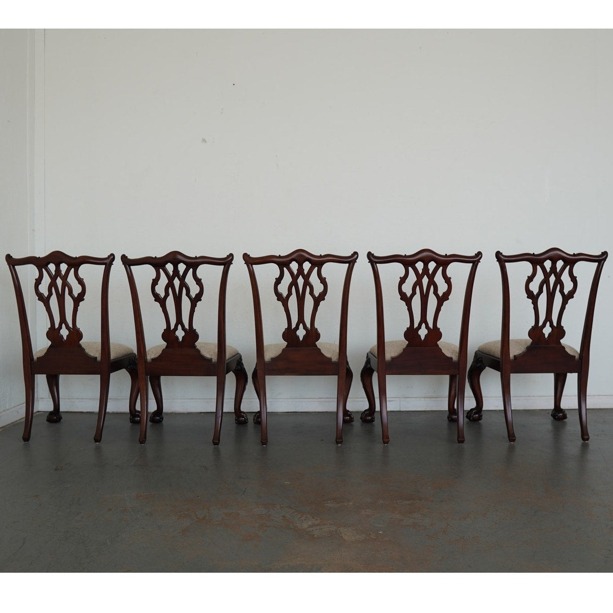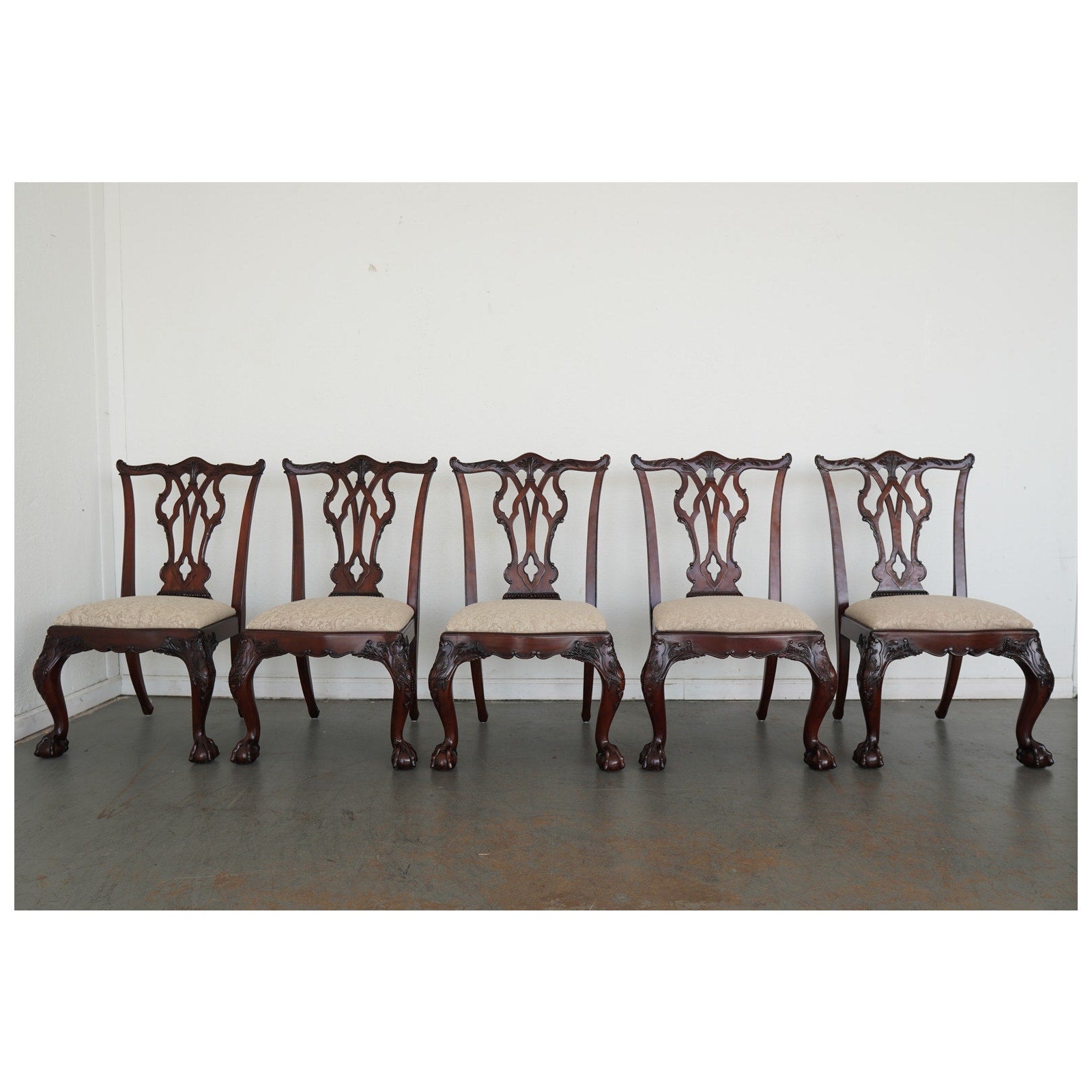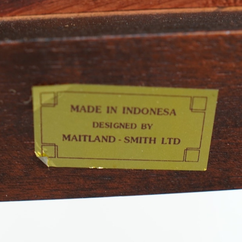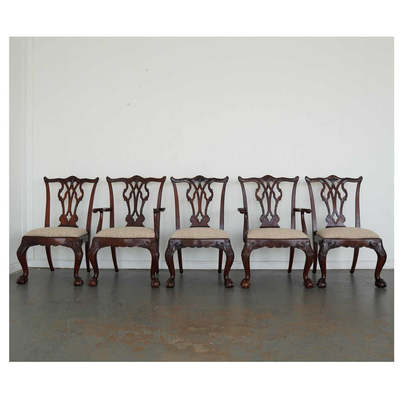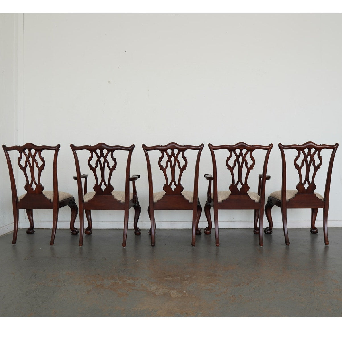 This vintage set of ten dining chairs reflects the kind of craftsmanship and detail associated with high-end American furniture production of the late 20th century. The set includes two armchairs and eight side chairs, all crafted in richly finished mahogany with deeply carved frames, elegant pierced splat backs, and beautifully shaped cabriole legs terminating in claw-and-ball feet. The seats are upholstered in a neutral patterned fabric that complements the warm tones of the wood and allows the carved detailing to remain the focal point. Both Henredon and Maitland-Smith labels are present on the undersides, which is not uncommon in vintage furniture and often indicates a collaborative production, shared design line, or manufacturing partnership during that period—combining Henredon’s reputation for quality construction with Maitland-Smith’s decorative and design-forward influence. The result is a refined, substantial dining set that balances classic formality with visual interest, making it well suited for traditional interiors or as a statement contrast in more eclectic spaces.