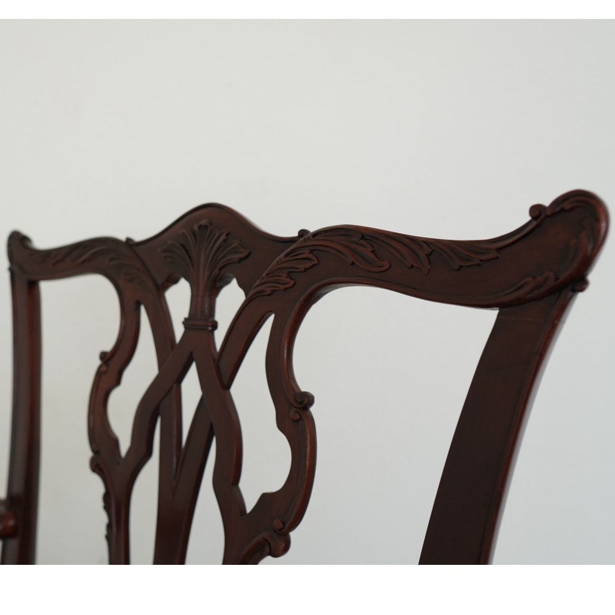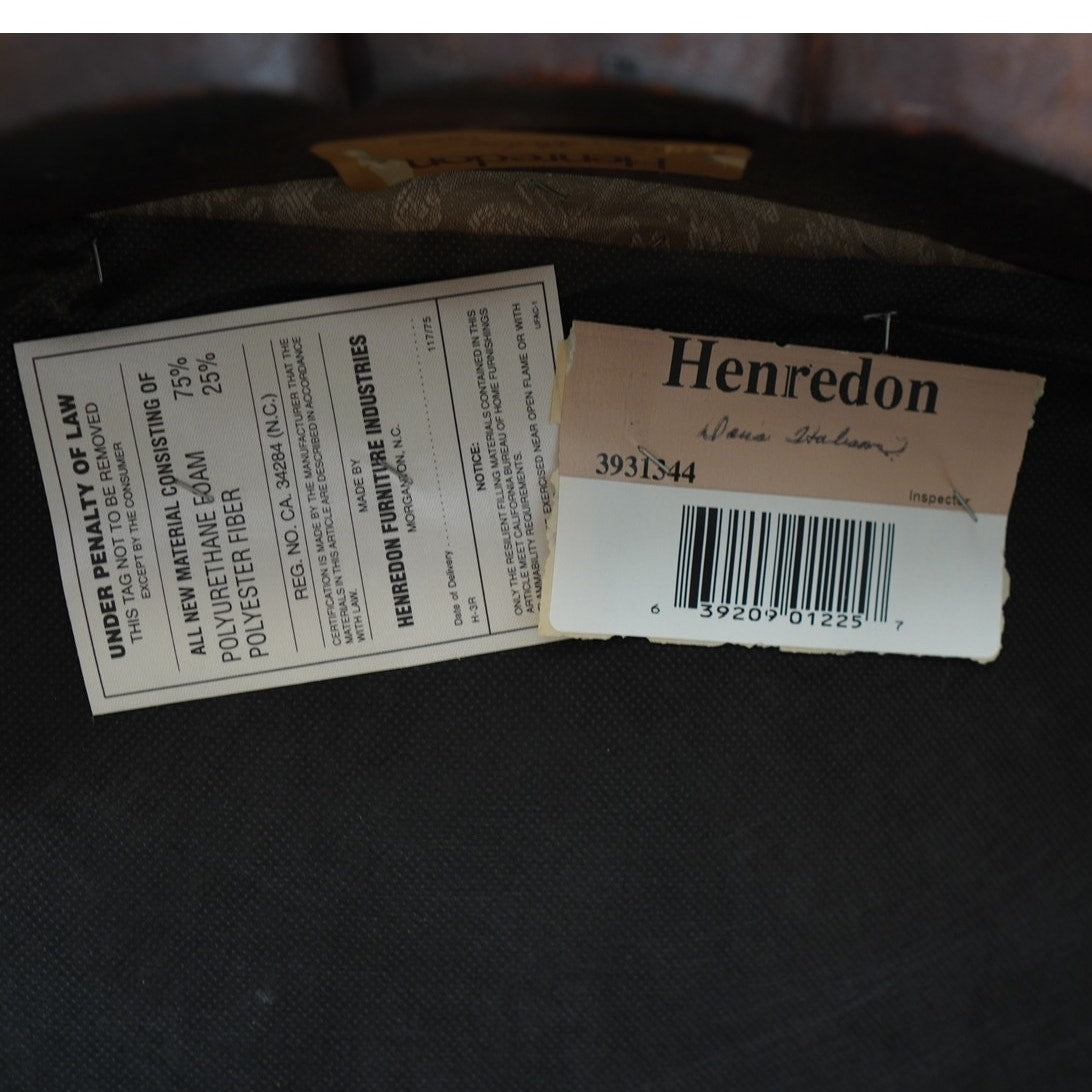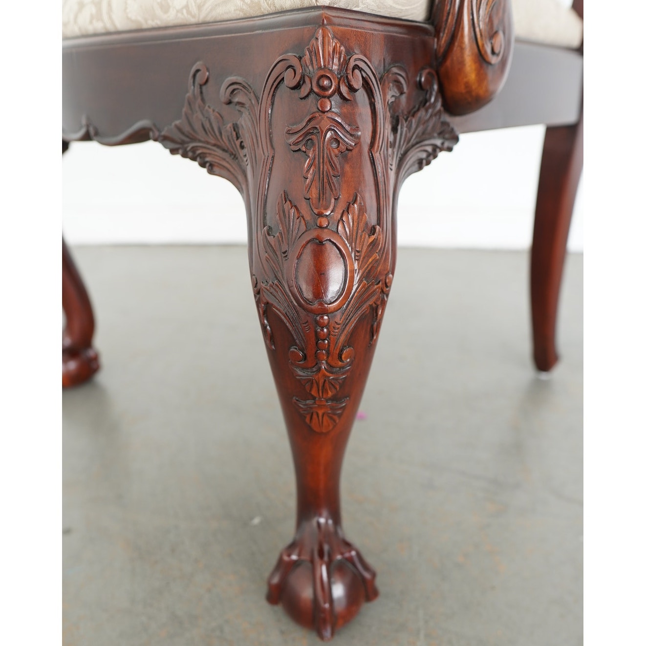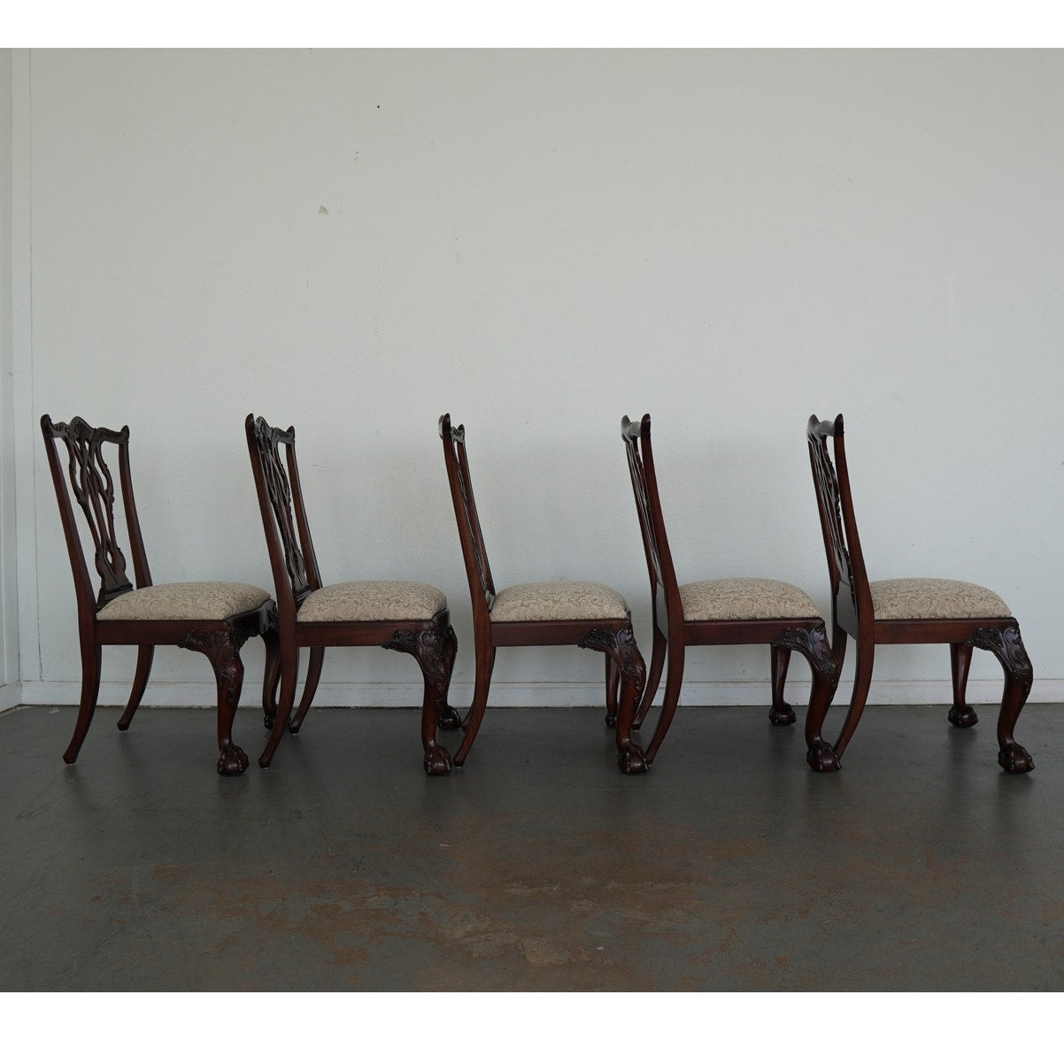 This vintage set of ten dining chairs reflects the kind of craftsmanship and detail associated with high-end American furniture production of the late 20th century. The set includes two armchairs and eight side chairs, all crafted in richly finished mahogany with deeply carved frames, elegant pierced splat backs, and beautifully shaped cabriole legs terminating in claw-and-ball feet. The seats are upholstered in a neutral patterned fabric that complements the warm tones of the wood and allows the carved detailing to remain the focal point. Both Henredon and Maitland-Smith labels are present on the undersides, which is not uncommon in vintage furniture and often indicates a collaborative production, shared design line, or manufacturing partnership during that period—combining Henredon’s reputation for quality construction with Maitland-Smith’s decorative and design-forward influence. The result is a refined, substantial dining set that balances classic formality with visual interest, making it well suited for traditional interiors or as a statement contrast in more eclectic spaces.