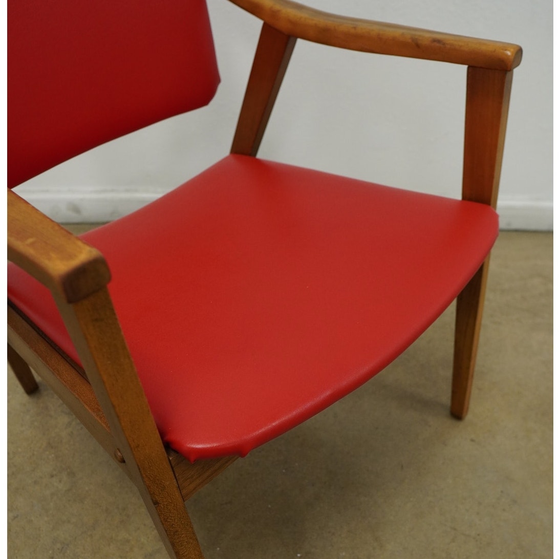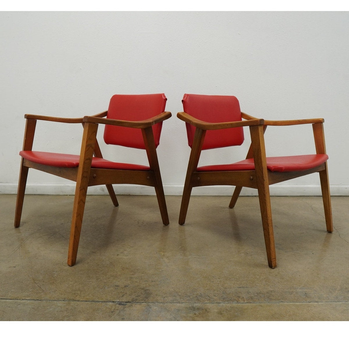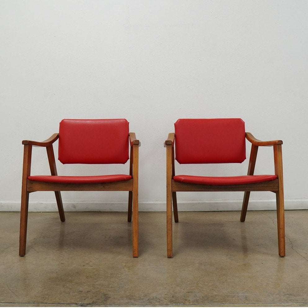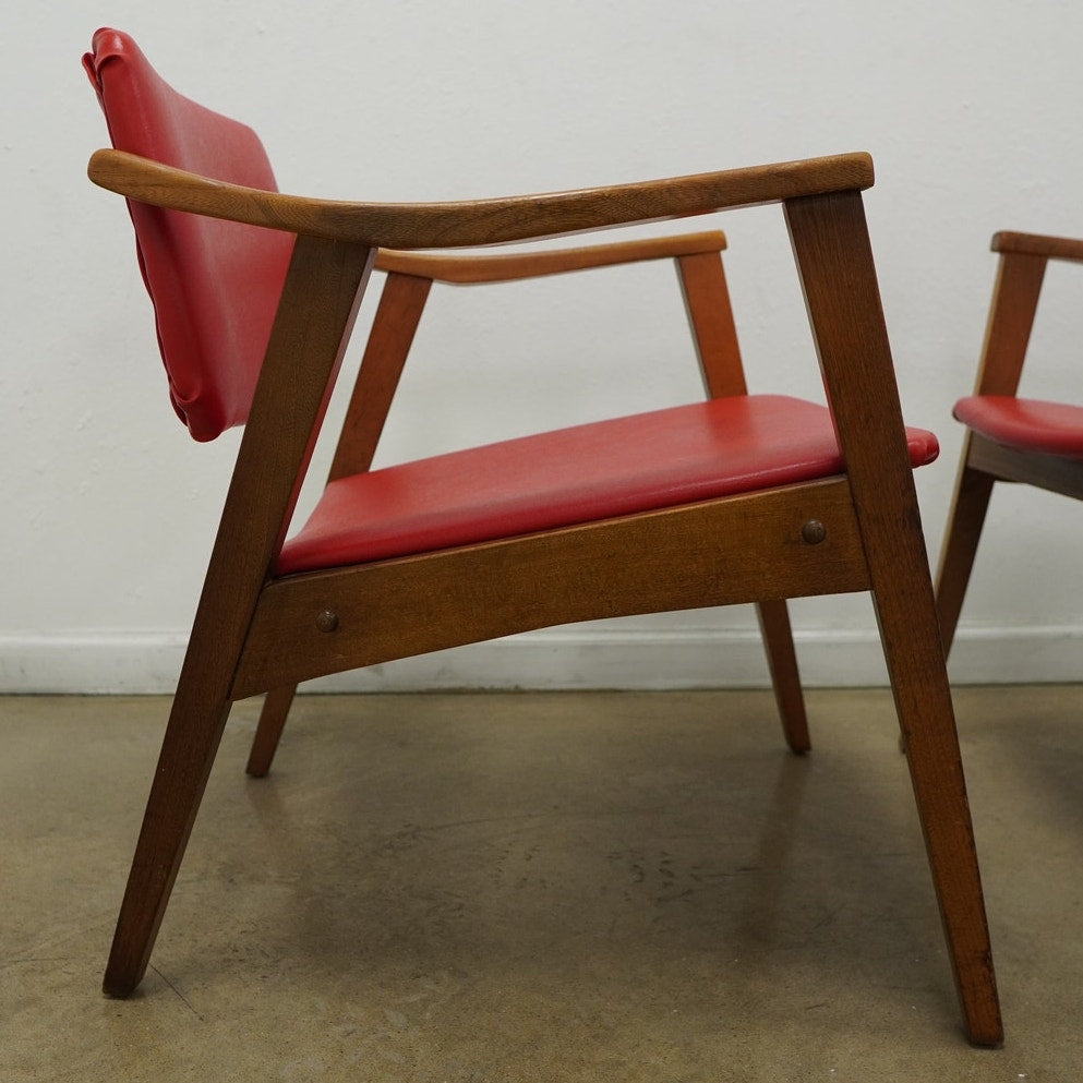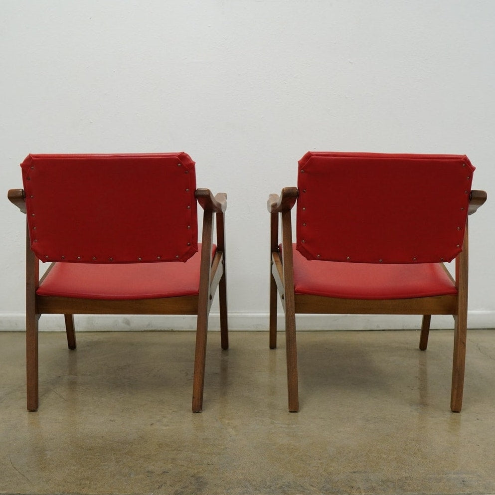 This pair of vintage mid century modern armchairs showcases a refined maple frame with sculptural lines and vibrant red upholstery, embodying the clean, architectural sensibility of 1960s American design. The chairs feature gently angled arms, tapered legs, and a subtly reclined profile, offering both visual lightness and comfortable support. A distinctive functional detail, the backrests are designed to tilt slightly, allowing for a more adaptive and comfortable seating experience—an uncommon feature that reflects thoughtful mid century craftsmanship. These chairs are attributed to Sibley, Lindsay & Curr Co., the Rochester, New York department store known for offering well-crafted mid century furnishings during the 1960s. Their design closely matches documented examples, including identical proportions, arm structure, tilting backrests, and upholstered panels with nailhead detailing. While these examples do not retain a maker’s mark, the construction and design strongly align with pieces from this line. The bold red upholstery provides a striking contrast to the warmth of the maple frame, giving the chairs a distinctive presence that feels both period-authentic and visually impactful. A well-balanced and increasingly hard-to-find pair, ideal for adding a confident mid century statement to a space.