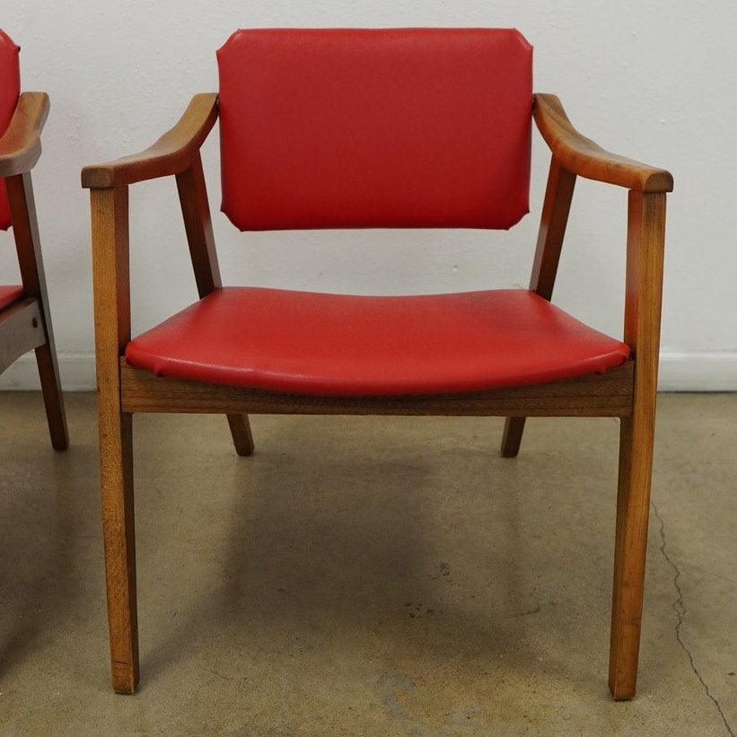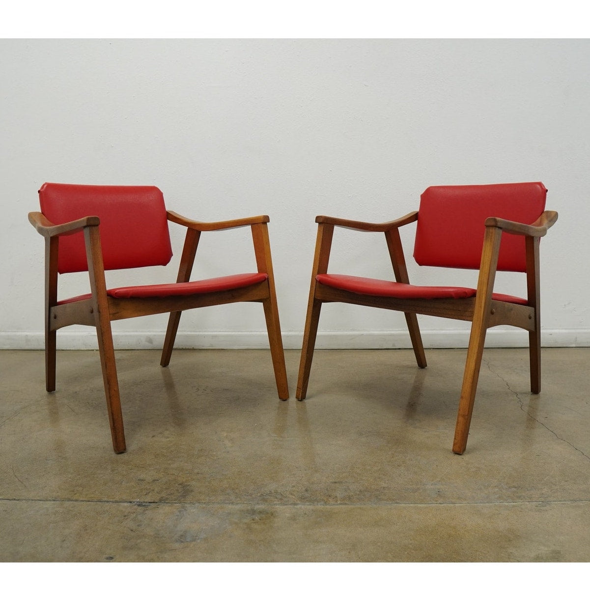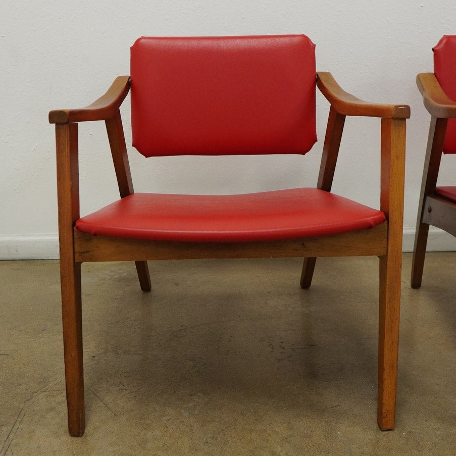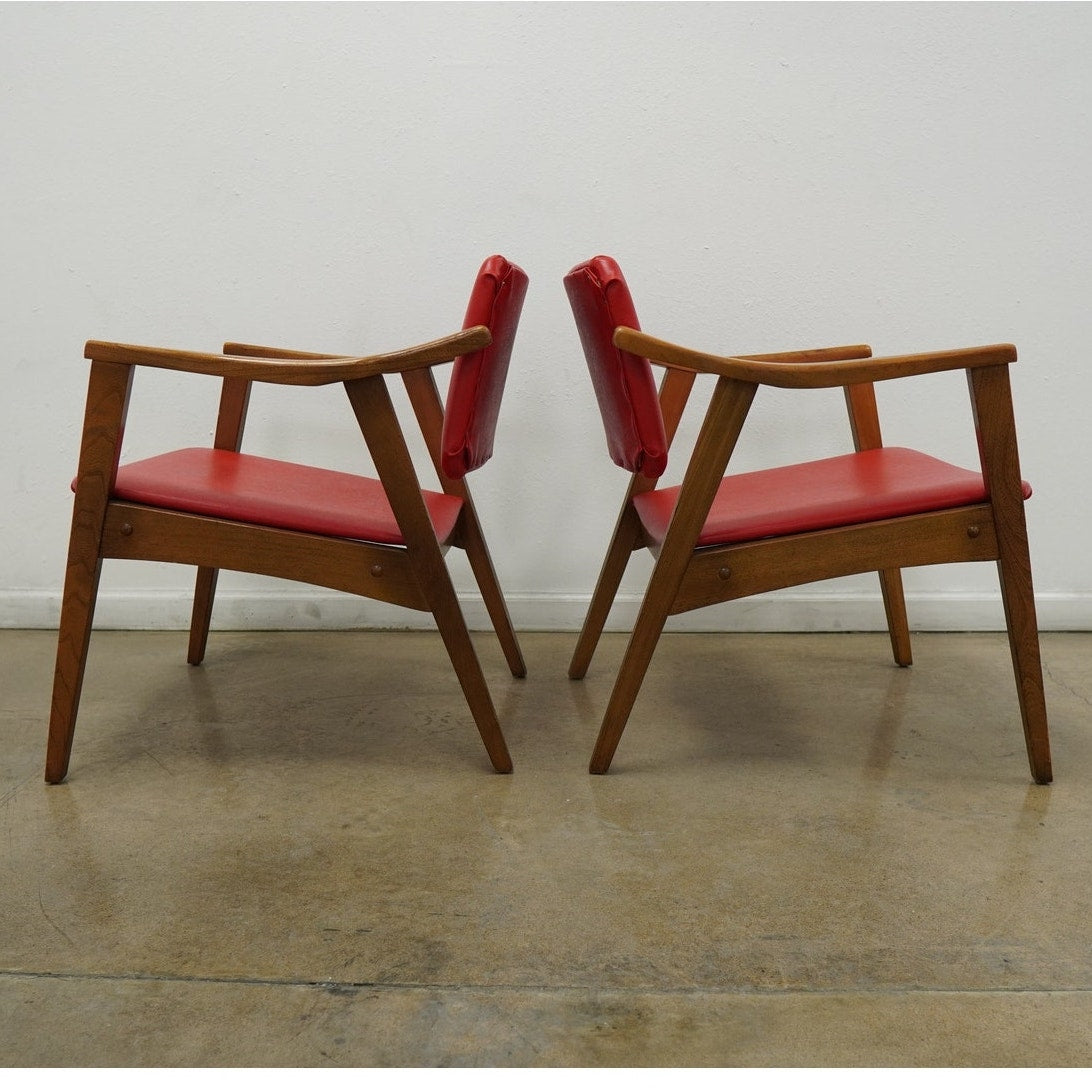 This pair of vintage mid century modern armchairs showcases a refined maple frame with sculptural lines and vibrant red upholstery, embodying the clean, architectural sensibility of 1960s American design. The chairs feature gently angled arms, tapered legs, and a subtly reclined profile, offering both visual lightness and comfortable support. A distinctive functional detail, the backrests are designed to tilt slightly, allowing for a more adaptive and comfortable seating experience—an uncommon feature that reflects thoughtful mid century craftsmanship. These chairs are attributed to Sibley, Lindsay & Curr Co., the Rochester, New York department store known for offering well-crafted mid century furnishings during the 1960s. Their design closely matches documented examples, including identical proportions, arm structure, tilting backrests, and upholstered panels with nailhead detailing. While these examples do not retain a maker’s mark, the construction and design strongly align with pieces from this line. The bold red upholstery provides a striking contrast to the warmth of the maple frame, giving the chairs a distinctive presence that feels both period-authentic and visually impactful. A well-balanced and increasingly hard-to-find pair, ideal for adding a confident mid century statement to a space.