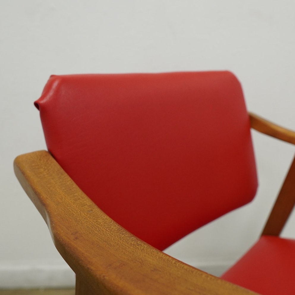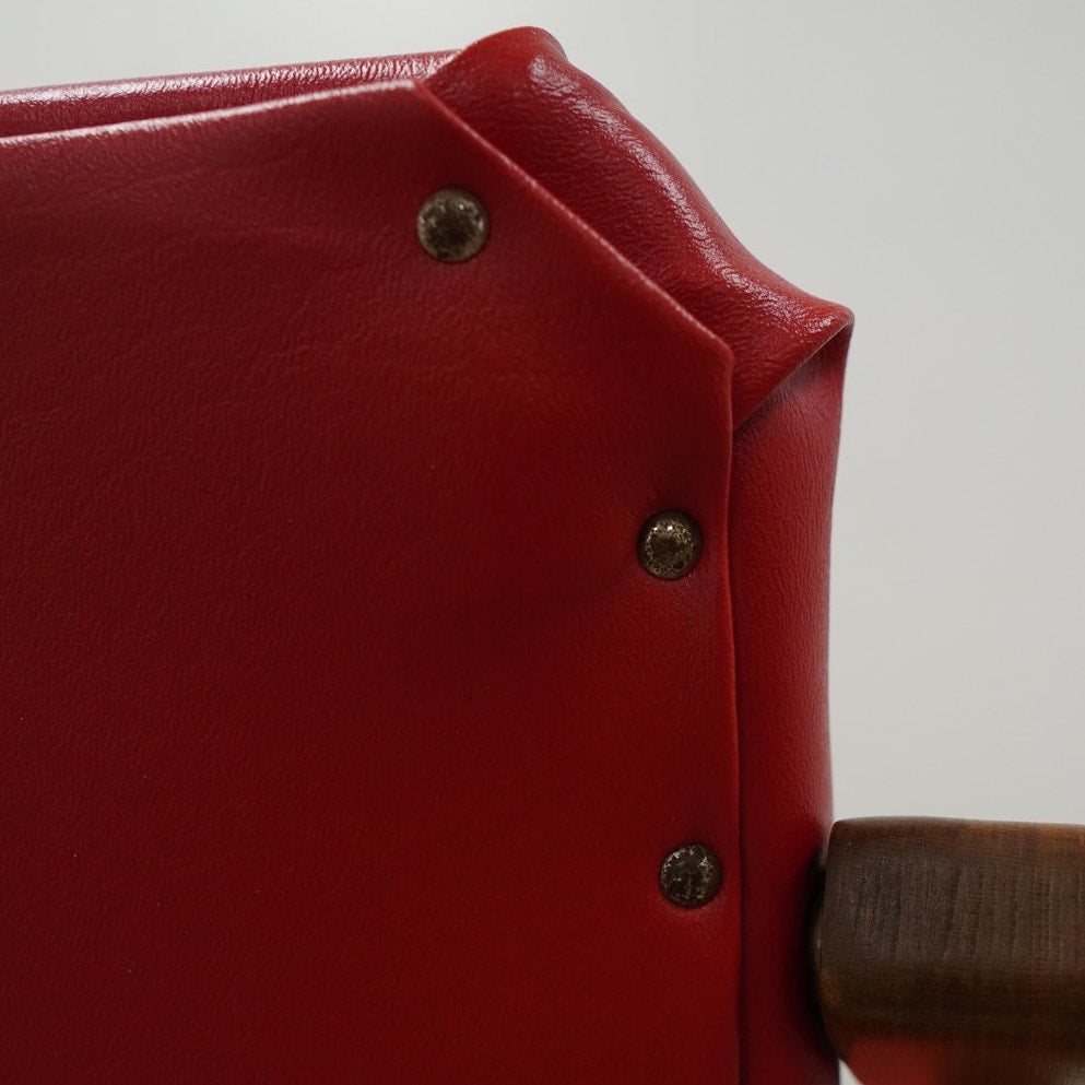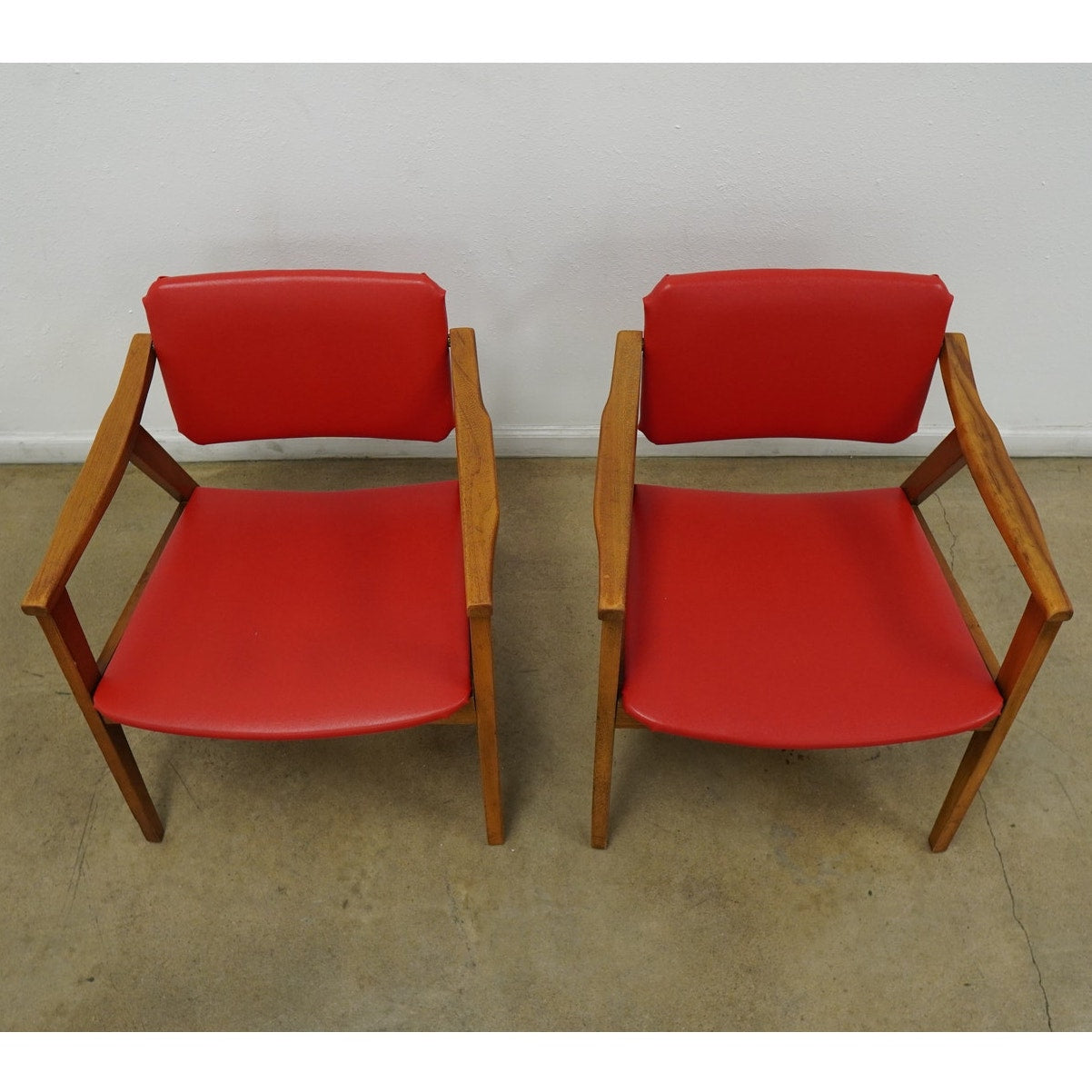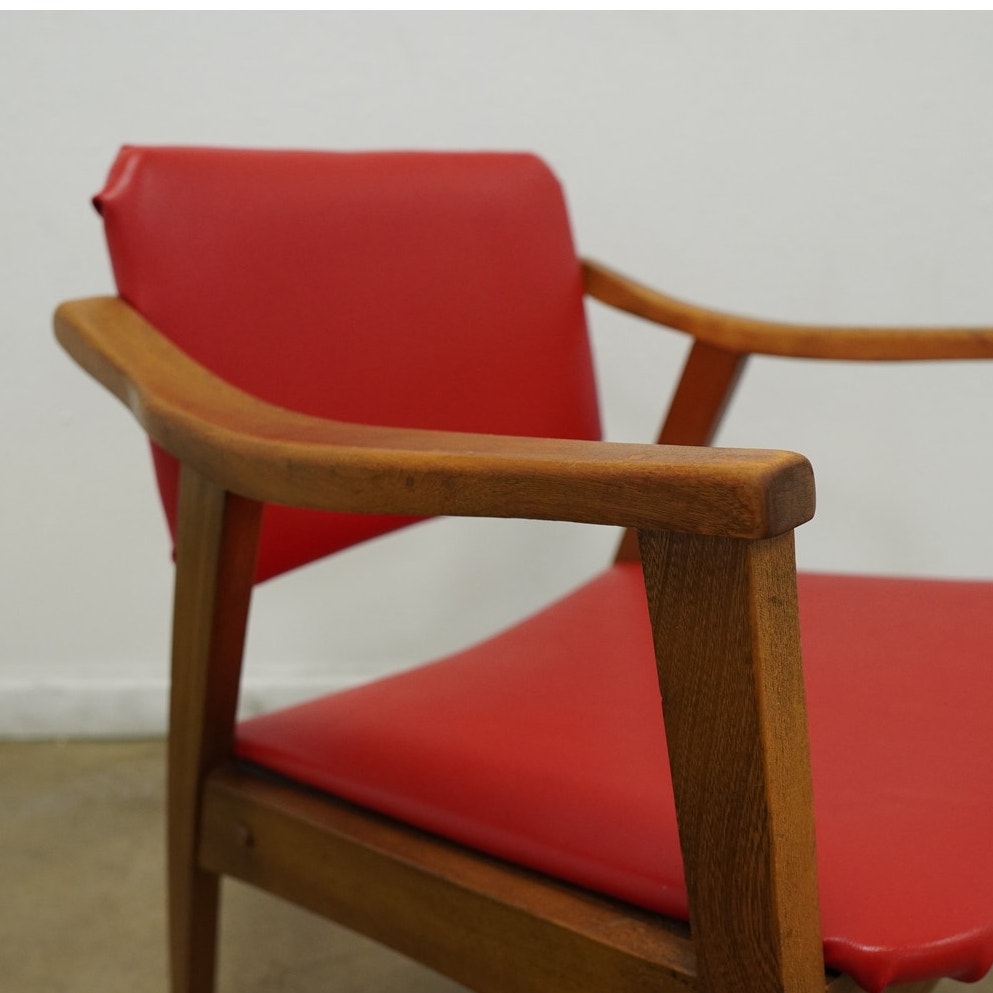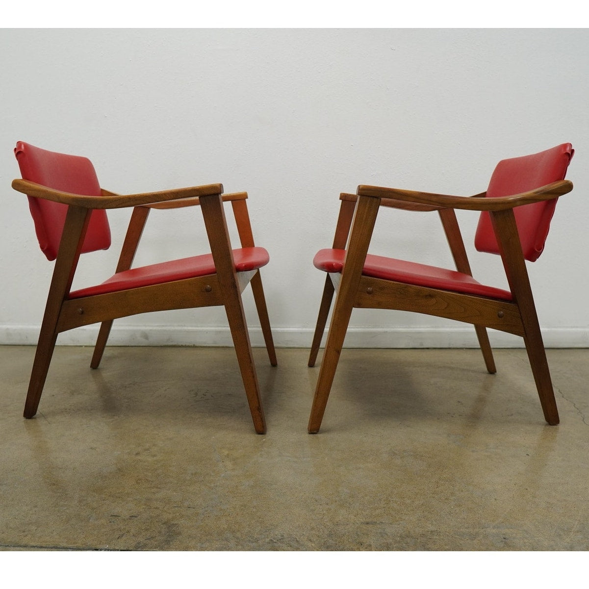 This pair of vintage mid century modern armchairs showcases a refined maple frame with sculptural lines and vibrant red upholstery, embodying the clean, architectural sensibility of 1960s American design. The chairs feature gently angled arms, tapered legs, and a subtly reclined profile, offering both visual lightness and comfortable support. A distinctive functional detail, the backrests are designed to tilt slightly, allowing for a more adaptive and comfortable seating experience—an uncommon feature that reflects thoughtful mid century craftsmanship. These chairs are attributed to Sibley, Lindsay & Curr Co., the Rochester, New York department store known for offering well-crafted mid century furnishings during the 1960s. Their design closely matches documented examples, including identical proportions, arm structure, tilting backrests, and upholstered panels with nailhead detailing. While these examples do not retain a maker’s mark, the construction and design strongly align with pieces from this line. The bold red upholstery provides a striking contrast to the warmth of the maple frame, giving the chairs a distinctive presence that feels both period-authentic and visually impactful. A well-balanced and increasingly hard-to-find pair, ideal for adding a confident mid century statement to a space.