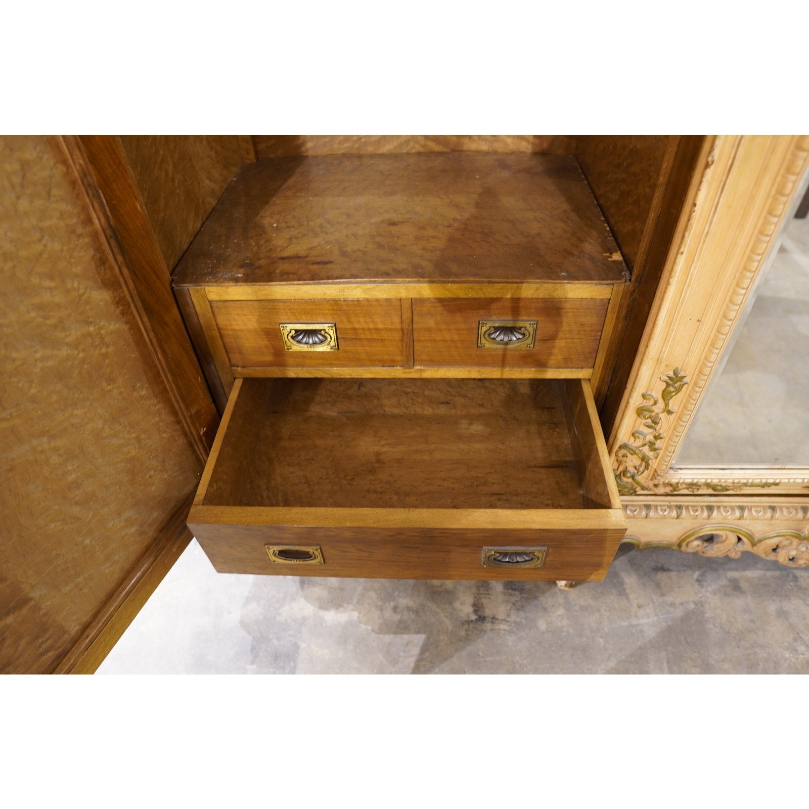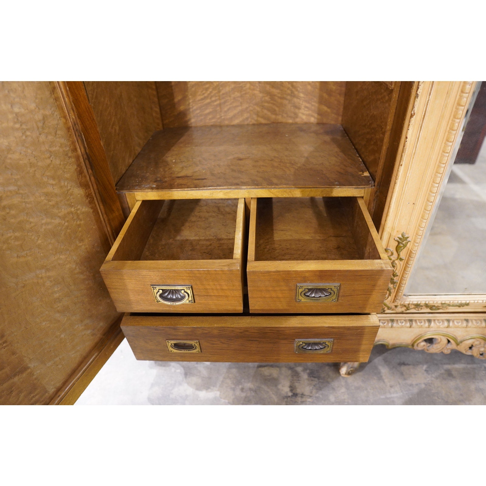 - Solid brass shell-style pulls on all interior drawers, echoing the Rococo shell motif.