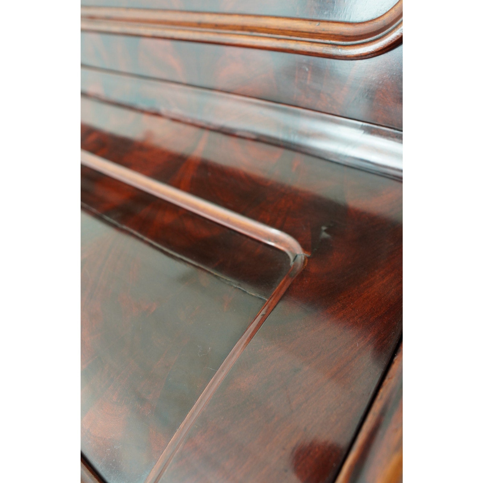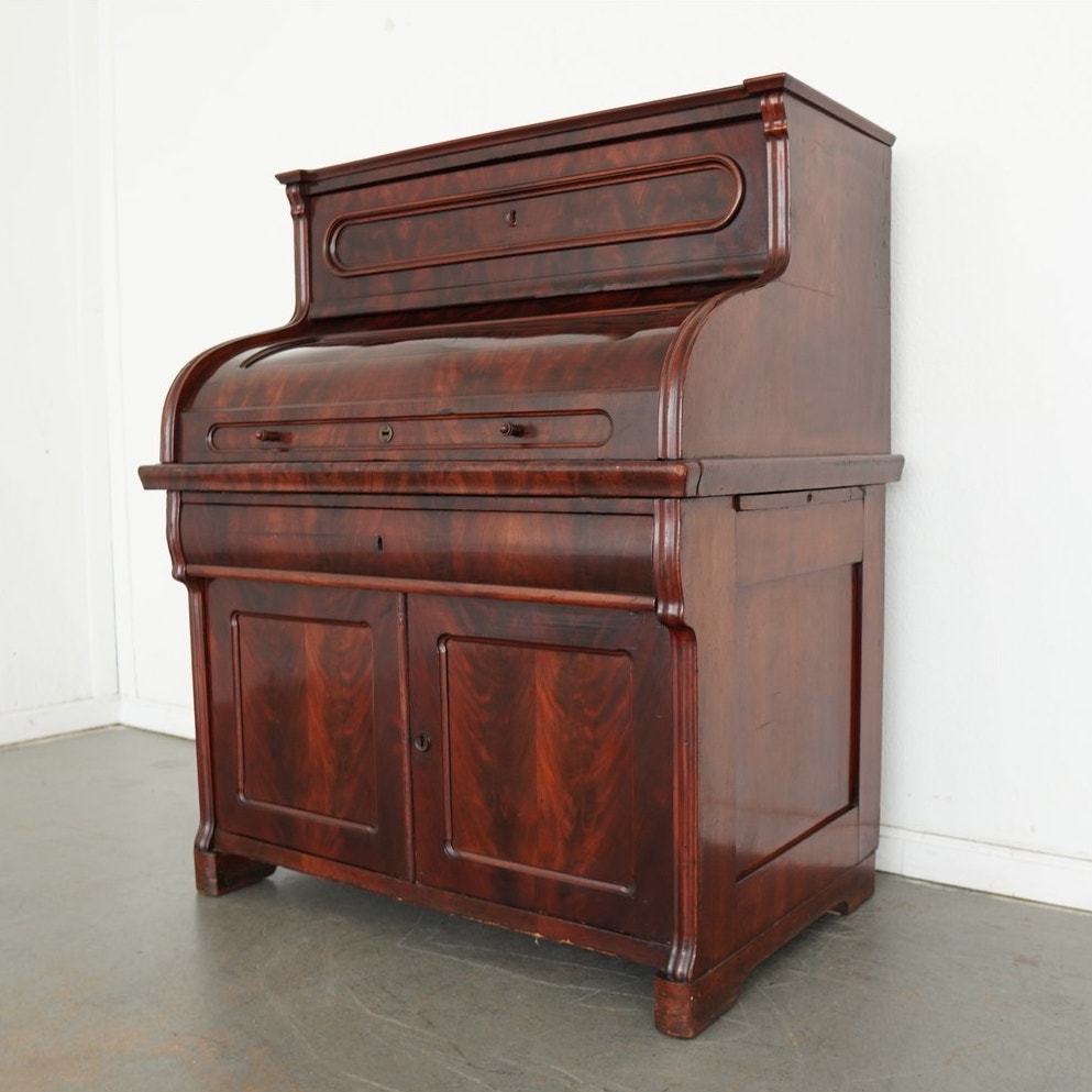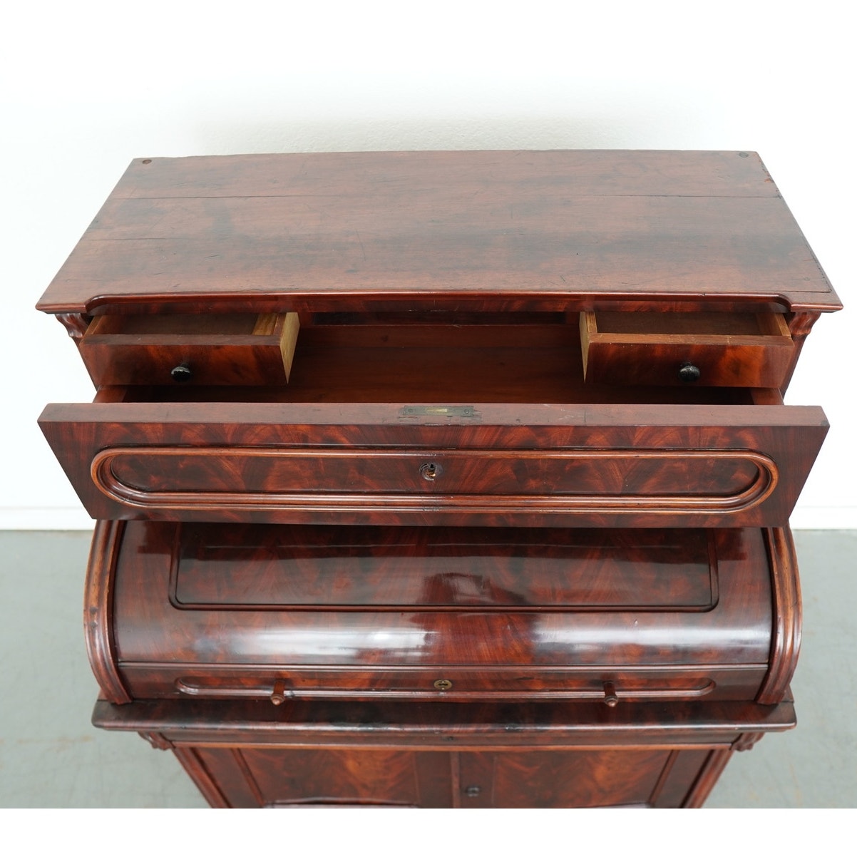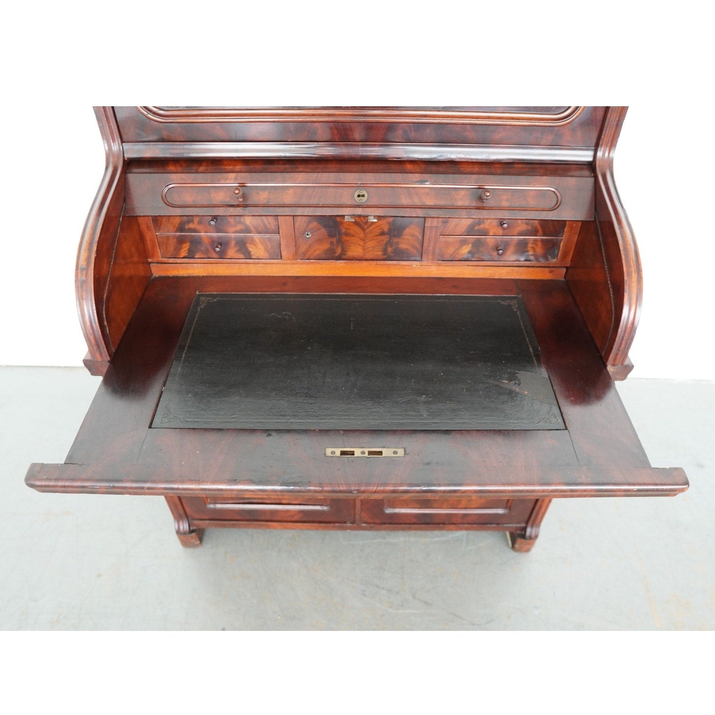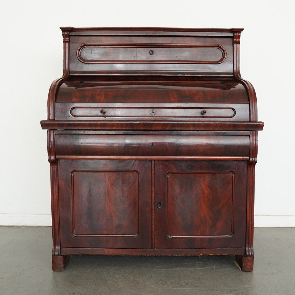 This antique Victorian cylinder roll-top secretary desk showcases the rich character and craftsmanship of late 19th-century design. Crafted in beautifully figured flame mahogany, the dramatic grain patterns create depth and movement across the curved cylinder front and paneled cabinet doors below. The elegant scroll sides, molded trim, and classic proportions reflect the refined detailing typical of the Victorian era. The upper cylinder opens to reveal a thoughtfully arranged interior with small drawers and compartments, offering both charm and practical organization. Below, double cabinet doors open to generous storage with interior shelving, making the piece as functional as it is visually striking. The warm patina, original key escutcheons, and time-softened finish further enhance its authentic antique presence. With its sculptural silhouette and rich wood tones, this secretary desk makes a distinguished statement in an office, library, or traditional interior, embodying the enduring elegance of true Victorian craftsmanship.