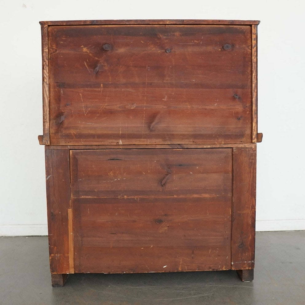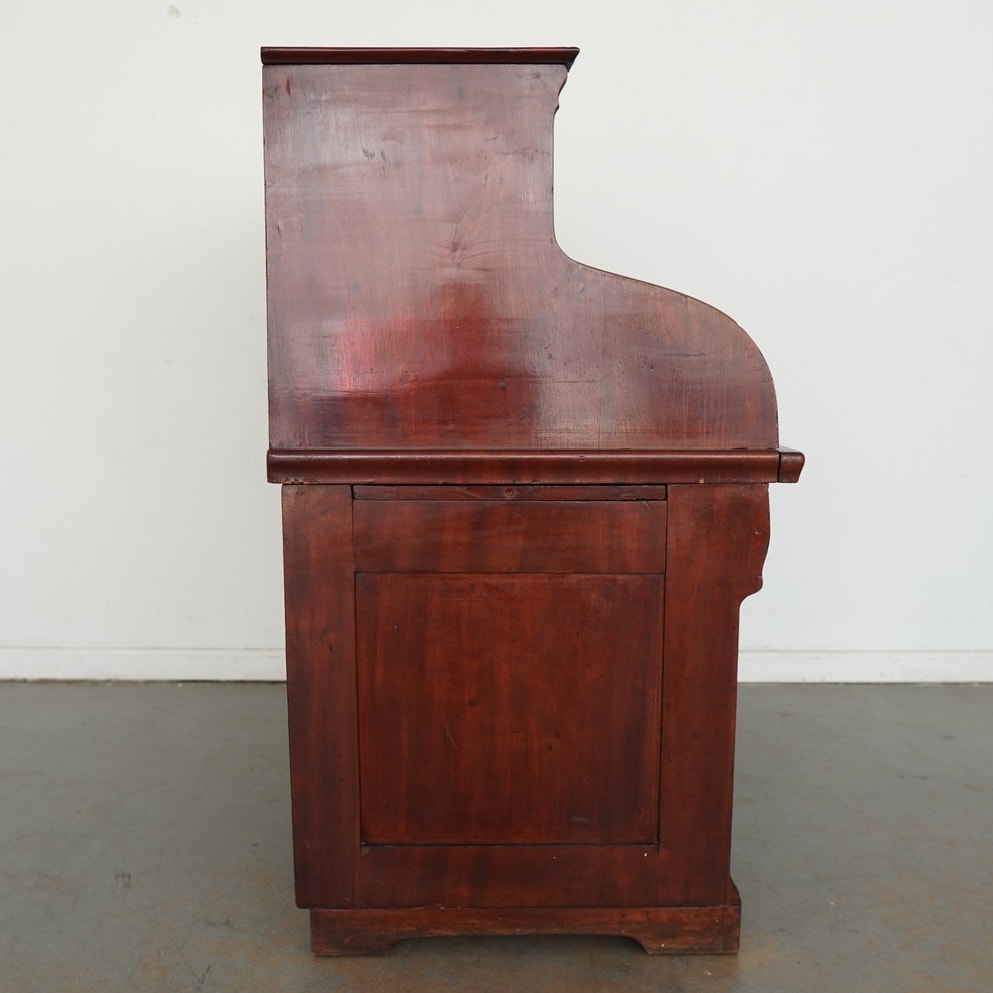 Condition: This antique secretary desk shows wear consistent with age and over a century of use. The mahogany finish displays surface scratches, scuffs, and areas of finish wear throughout, particularly along edges, corners, and the base. There is visible wear and minor chipping around the key escutcheons, along with expected separation and age-related movement at some joints and veneer seams. The lower base and feet show heavier wear from years of use, including rubbing and finish loss. The leather writing surface shows dryness and wear consistent with age. The key for the upper cylinder compartment is present; however, the key for the lower cabinet portion is missing. Despite these imperfections, the piece remains structurally solid and retains a rich, time-softened patina that beautifully reflects its antique character and craftsmanship.