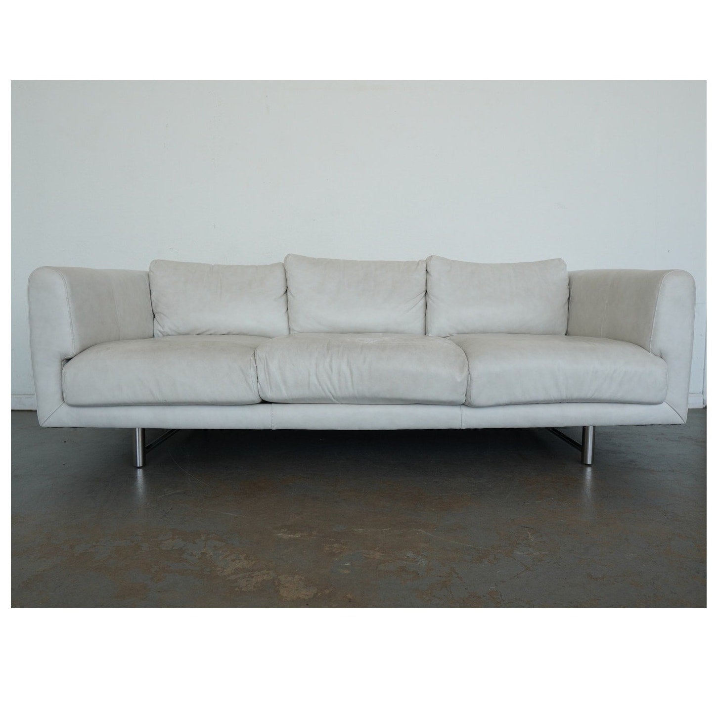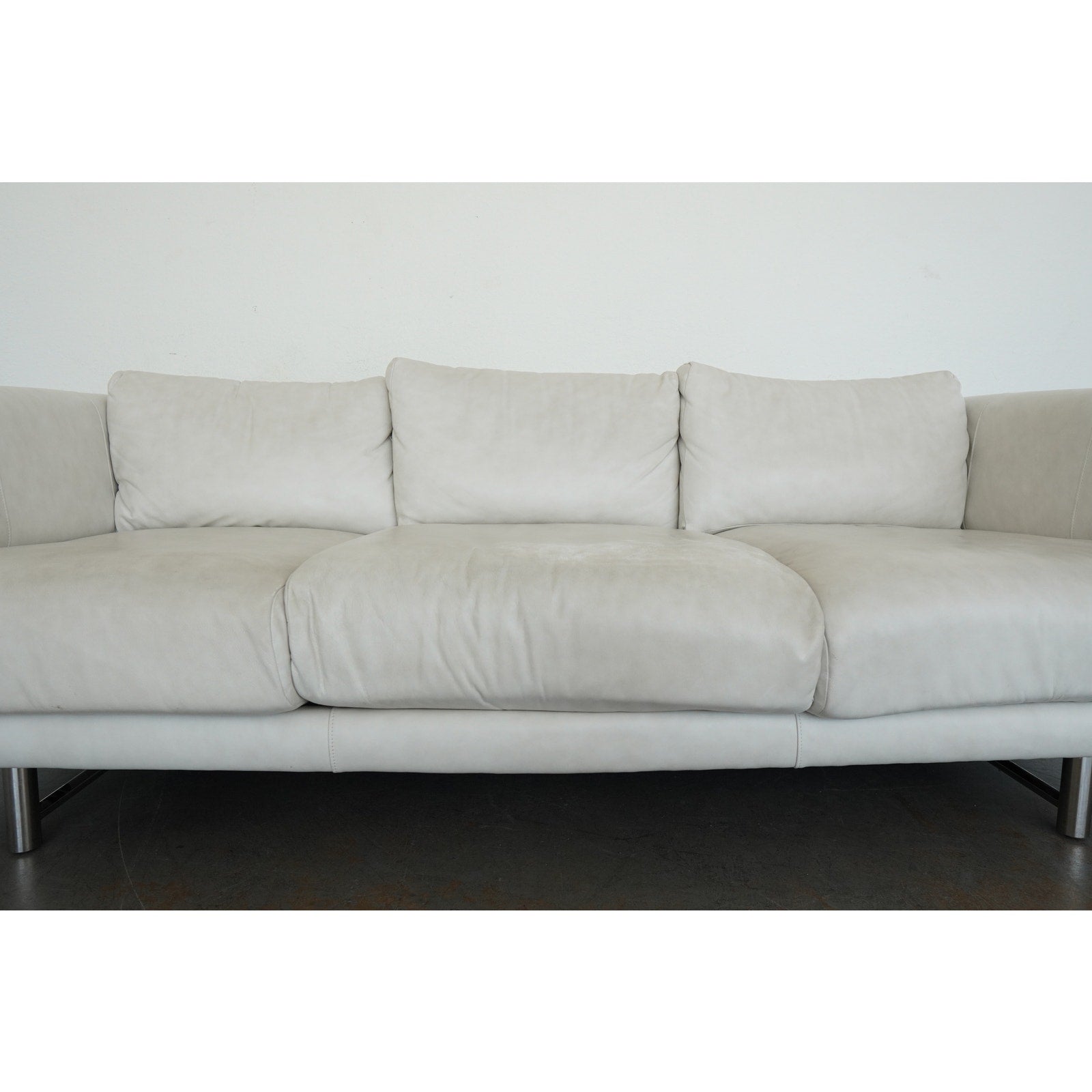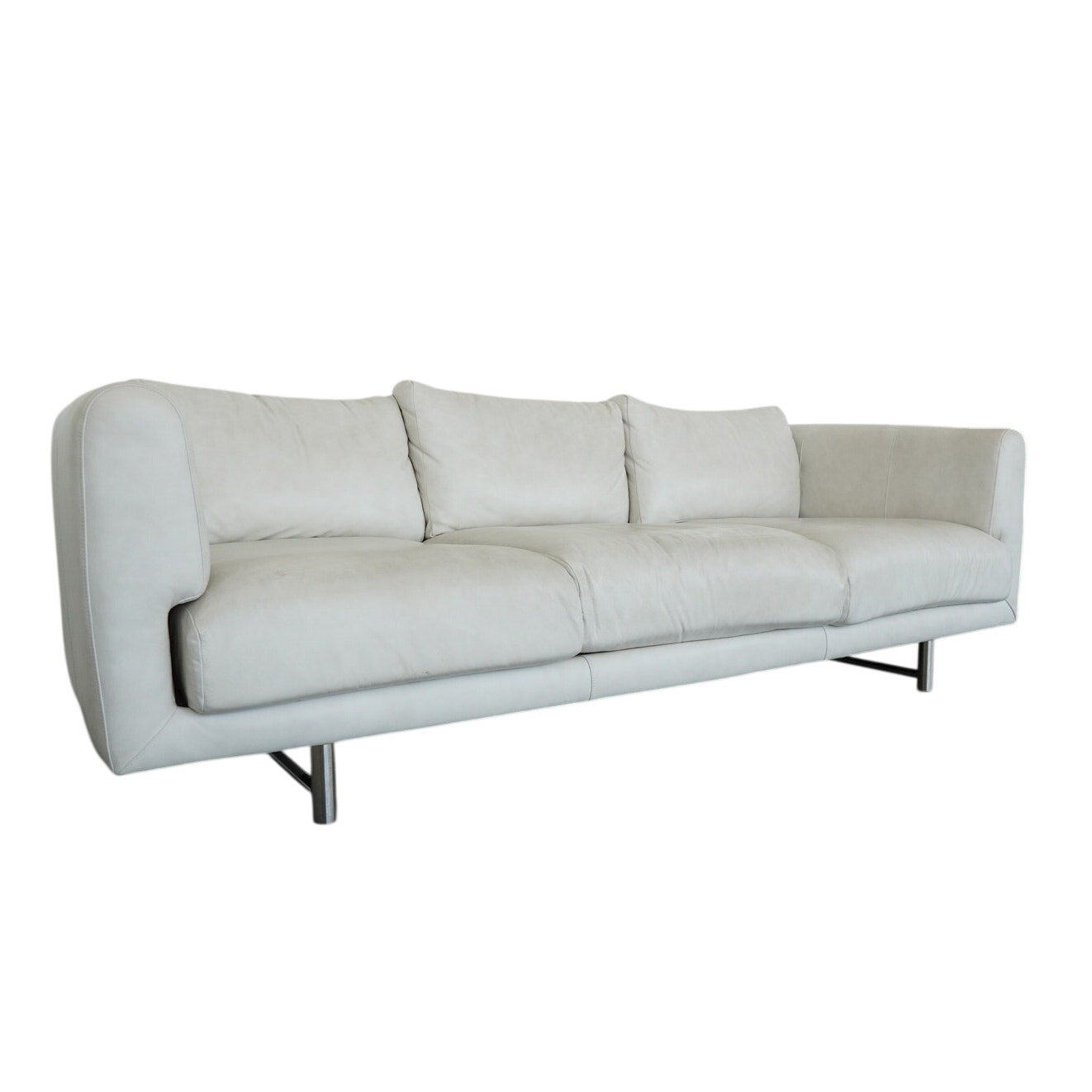 This Bernhardt Grayson leather sofa embodies a clean-lined contemporary design from the late 20th to early 21st century, defined by its understated silhouette and refined proportions. Upholstered in smooth, light-toned leather, the sofa features broad track arms, three plush seat cushions, and a low-profile frame that gives it a relaxed yet tailored presence. Subtle tailoring and generous cushioning create a balanced look that feels both modern and inviting, while the sleek metal legs add a touch of architectural contrast and elevate the overall design. The result is a versatile and sophisticated piece that highlights Bernhardt’s signature blend of comfort and streamlined style.