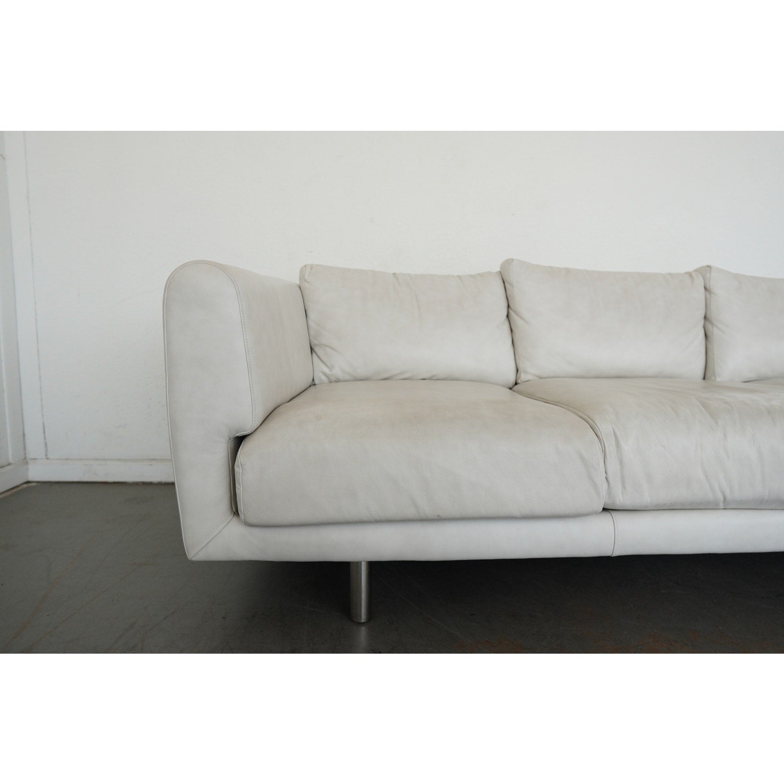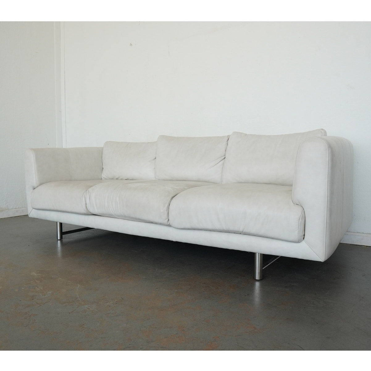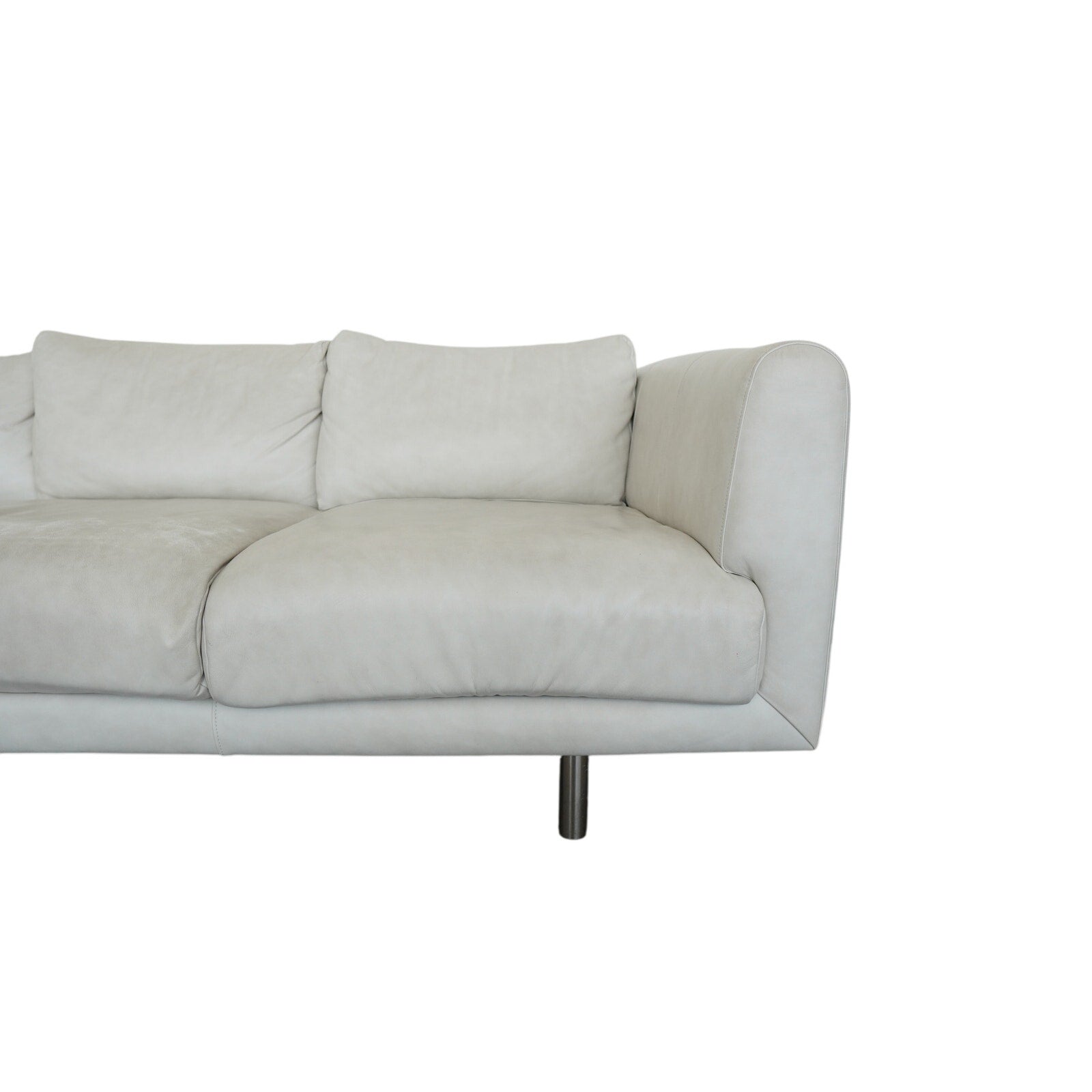 This Bernhardt Grayson leather sofa embodies a clean-lined contemporary design from the late 20th to early 21st century, defined by its understated silhouette and refined proportions. Upholstered in smooth, light-toned leather, the sofa features broad track arms, three plush seat cushions, and a low-profile frame that gives it a relaxed yet tailored presence. Subtle tailoring and generous cushioning create a balanced look that feels both modern and inviting, while the sleek metal legs add a touch of architectural contrast and elevate the overall design. The result is a versatile and sophisticated piece that highlights Bernhardt’s signature blend of comfort and streamlined style.