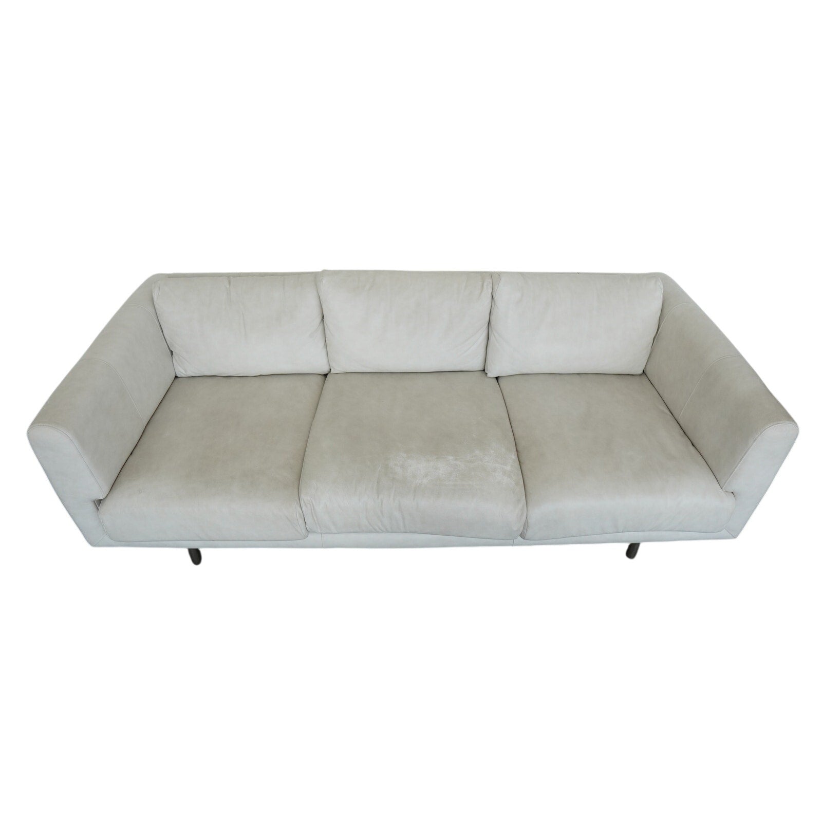 Condition: The sofa shows significant visible wear consistent with regular use over time, most notably across the seat cushions where the leather has pronounced discoloration, darkening, and uneven variation in tone. There is also evident creasing, wrinkling, and general surface wear throughout, especially in high-contact areas, which is typical for leather of this age and use. The arms and back show lighter signs of wear by comparison. The leather remains intact overall with no major tears observed, but the finish reflects a well-used piece with a clearly developed patina and substantial color wear. The cushions retain their shape and the frame feels sturdy and supportive, though the cosmetic discoloration and surface wear are prominent and should be expected.