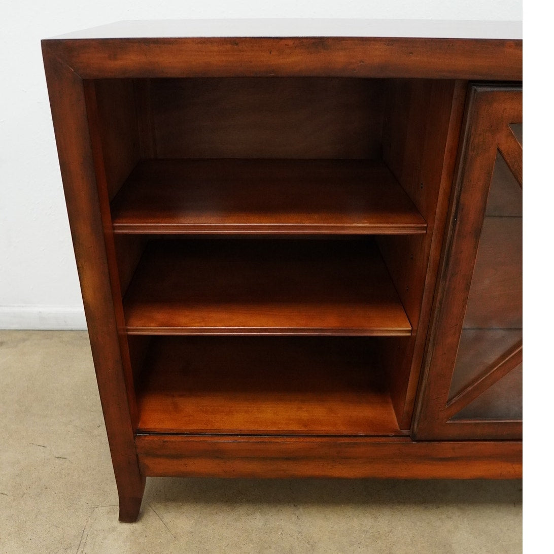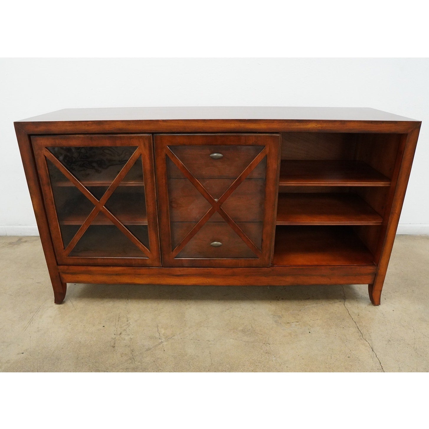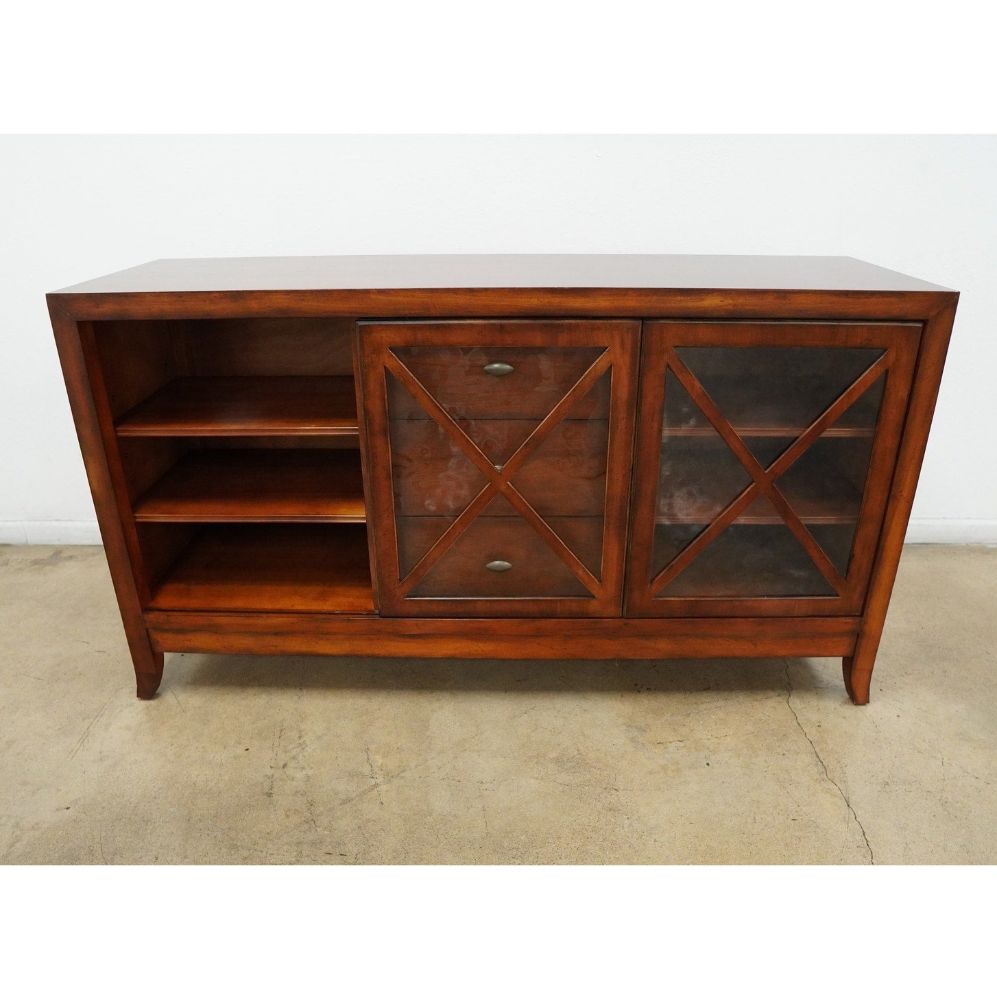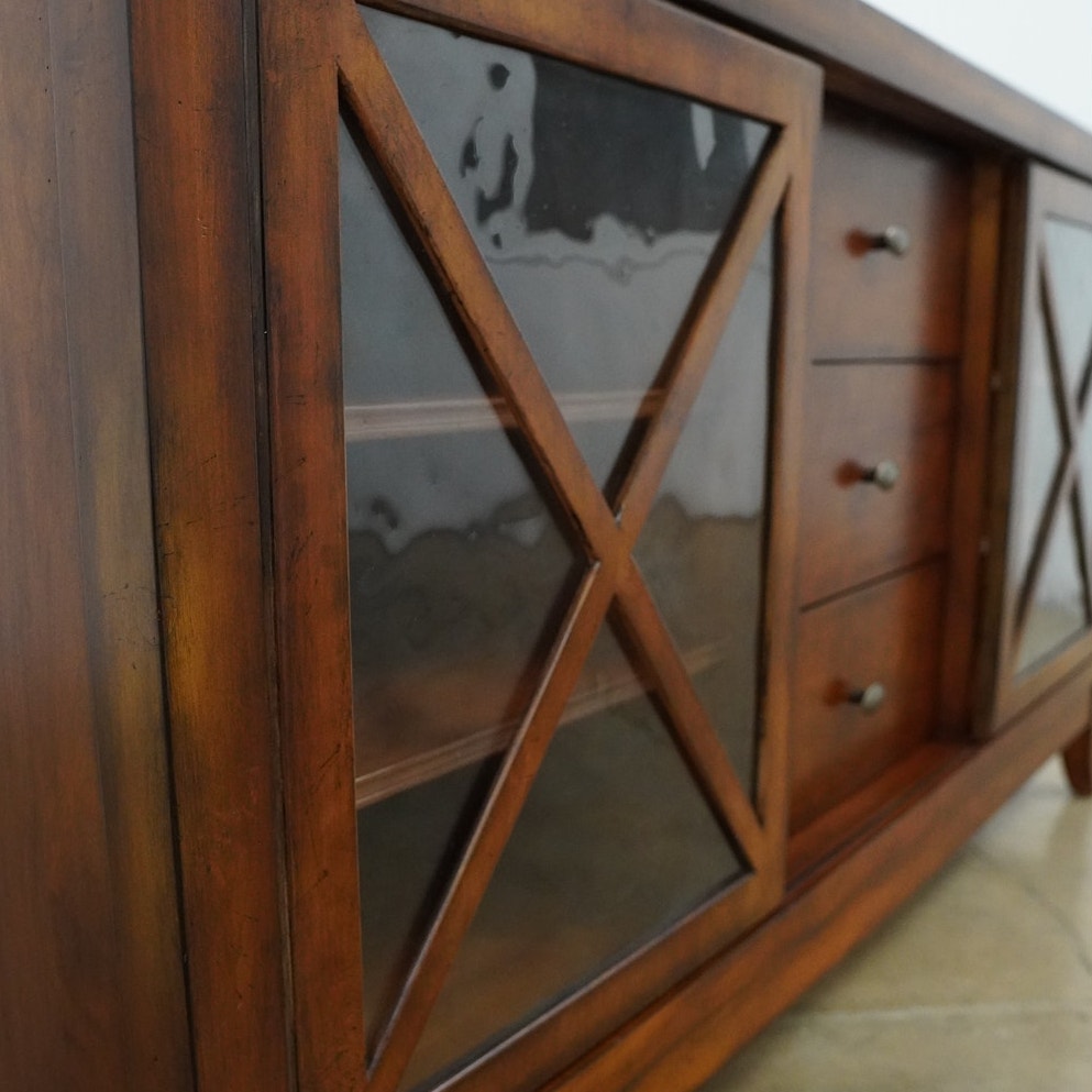 This Hooker Furniture media console features a clean-lined transitional design crafted in a rich cherry-toned finish with subtle warmth and depth. The piece is anchored by a central bank of drawers, flanked by two glass-front cabinets with classic X-mullion detailing, creating a balanced and visually striking profile. Designed with both form and function in mind, the console offers generous storage with adjustable shelving behind the cabinet doors and multiple drawers for organization, making it ideal for media components, dining storage, or general living space use. The interior includes practical cutouts for wire management, reinforcing its versatility as a media console while maintaining a refined furniture aesthetic. With its tailored proportions, softly tapered legs, and understated hardware, this piece reflects Hooker Furniture’s reputation for combining quality craftsmanship with approachable, timeless design.