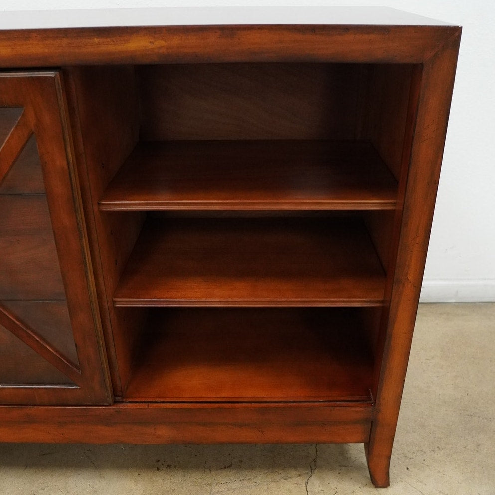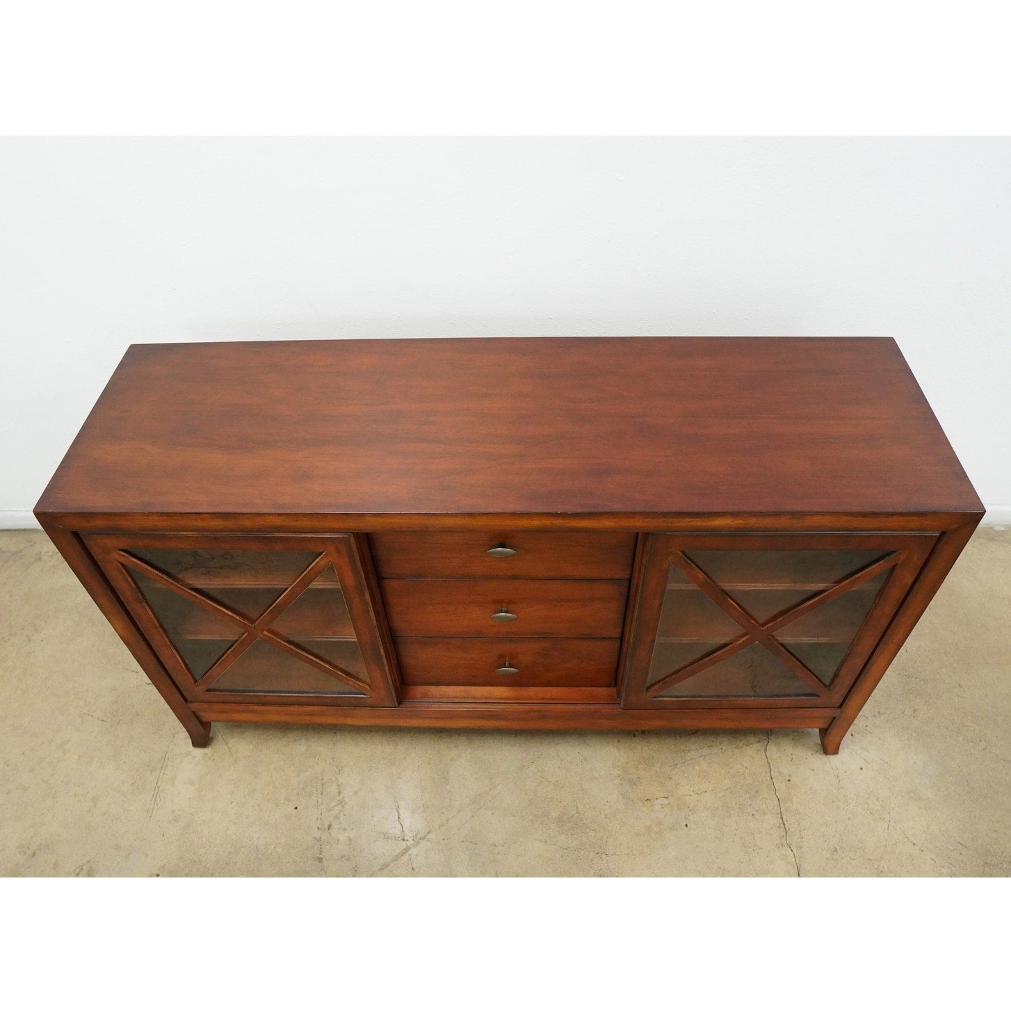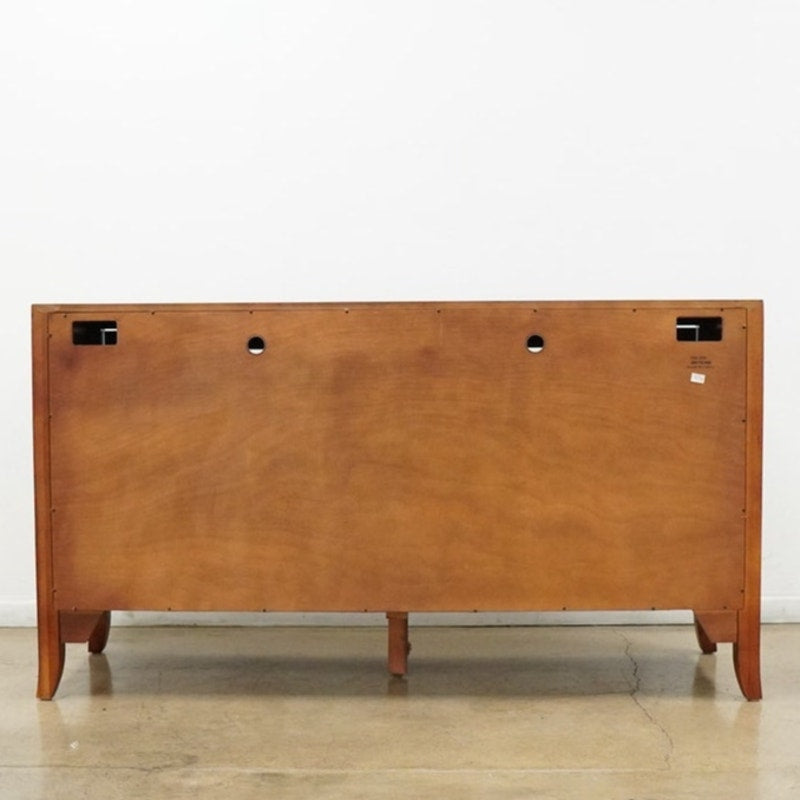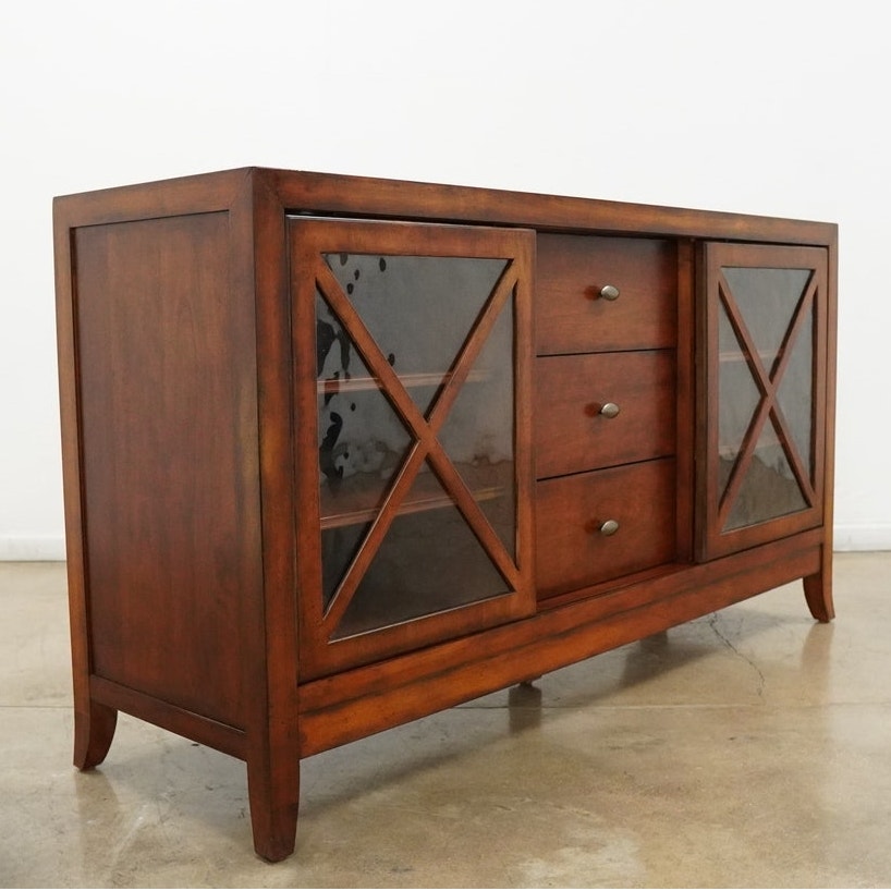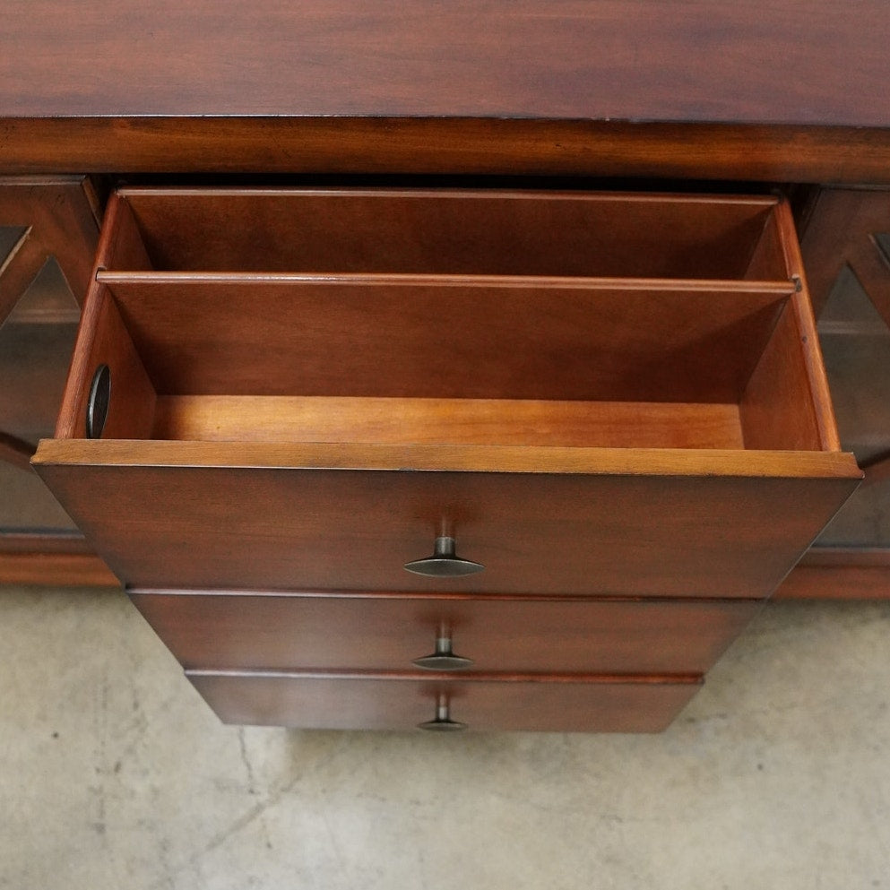 This Hooker Furniture media console features a clean-lined transitional design crafted in a rich cherry-toned finish with subtle warmth and depth. The piece is anchored by a central bank of drawers, flanked by two glass-front cabinets with classic X-mullion detailing, creating a balanced and visually striking profile. Designed with both form and function in mind, the console offers generous storage with adjustable shelving behind the cabinet doors and multiple drawers for organization, making it ideal for media components, dining storage, or general living space use. The interior includes practical cutouts for wire management, reinforcing its versatility as a media console while maintaining a refined furniture aesthetic. With its tailored proportions, softly tapered legs, and understated hardware, this piece reflects Hooker Furniture’s reputation for combining quality craftsmanship with approachable, timeless design.