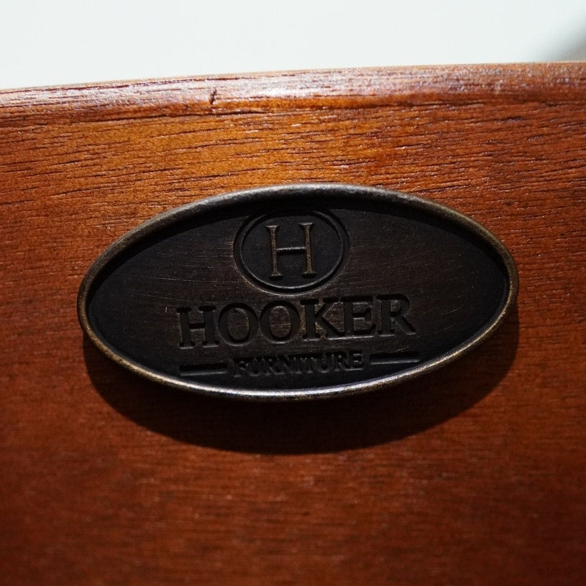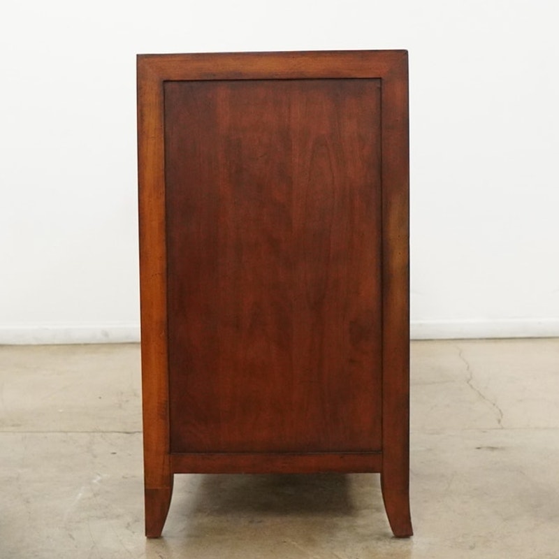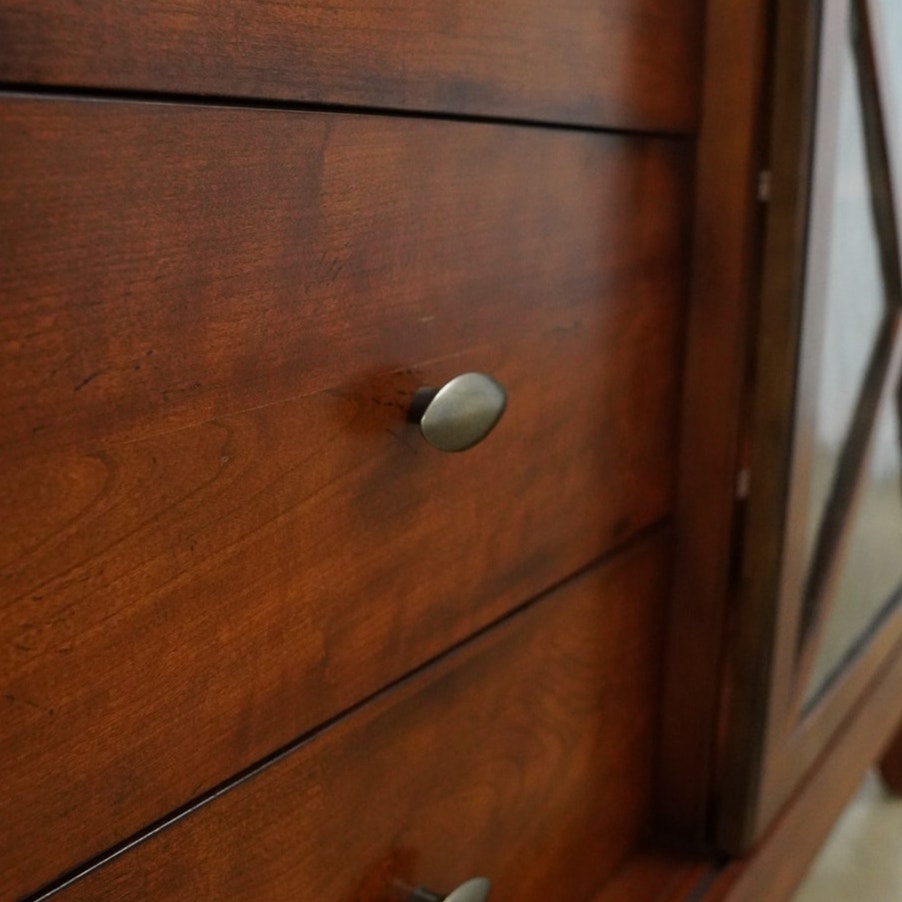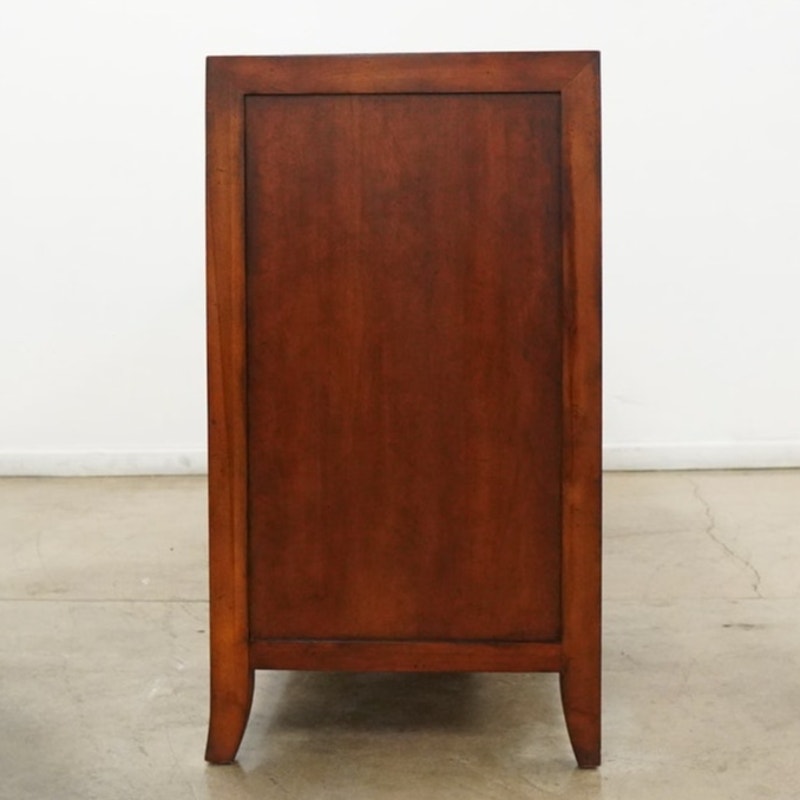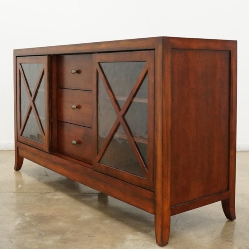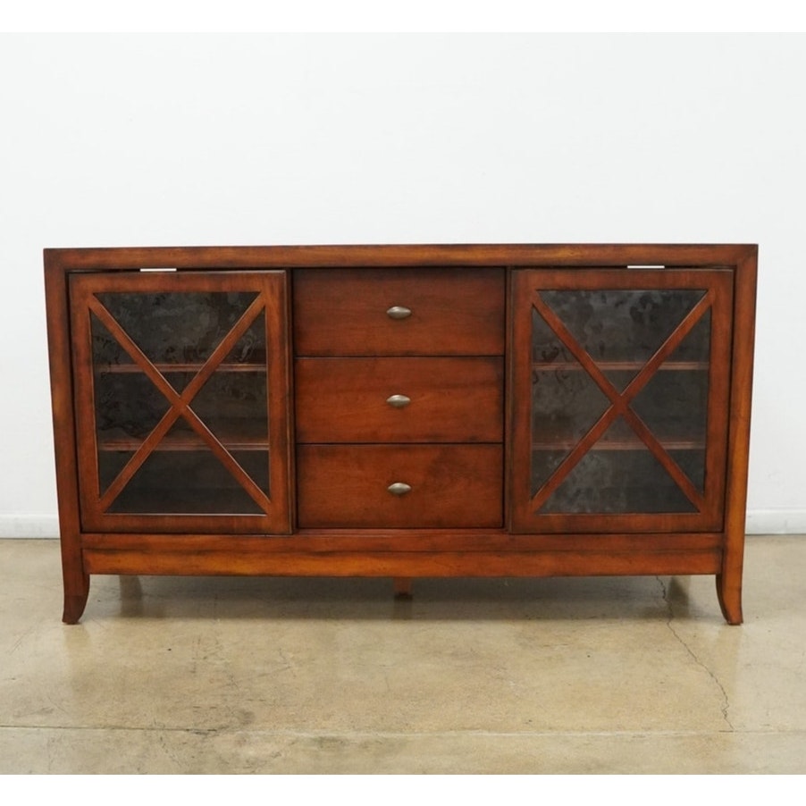 This Hooker Furniture media console features a clean-lined transitional design crafted in a rich cherry-toned finish with subtle warmth and depth. The piece is anchored by a central bank of drawers, flanked by two glass-front cabinets with classic X-mullion detailing, creating a balanced and visually striking profile. Designed with both form and function in mind, the console offers generous storage with adjustable shelving behind the cabinet doors and multiple drawers for organization, making it ideal for media components, dining storage, or general living space use. The interior includes practical cutouts for wire management, reinforcing its versatility as a media console while maintaining a refined furniture aesthetic. With its tailored proportions, softly tapered legs, and understated hardware, this piece reflects Hooker Furniture’s reputation for combining quality craftsmanship with approachable, timeless design.