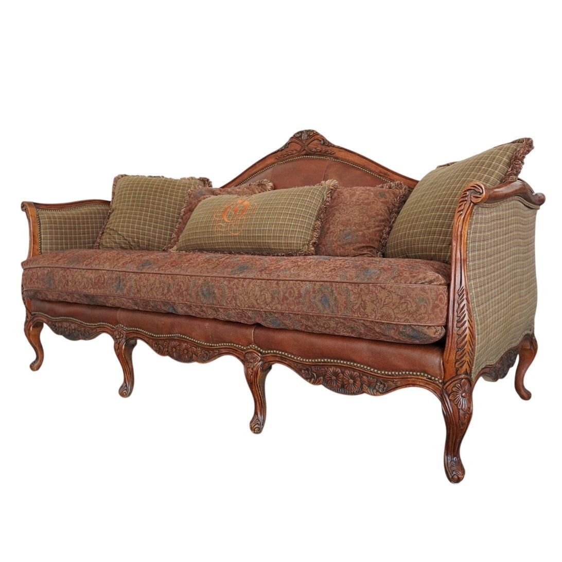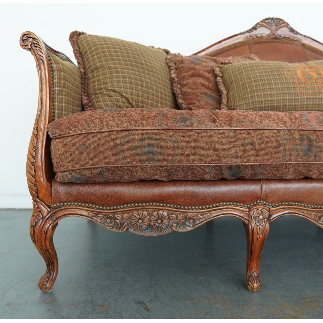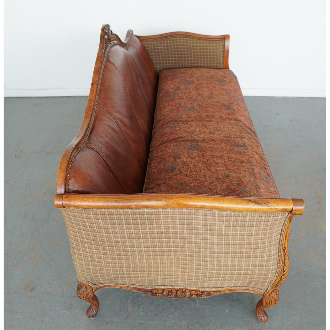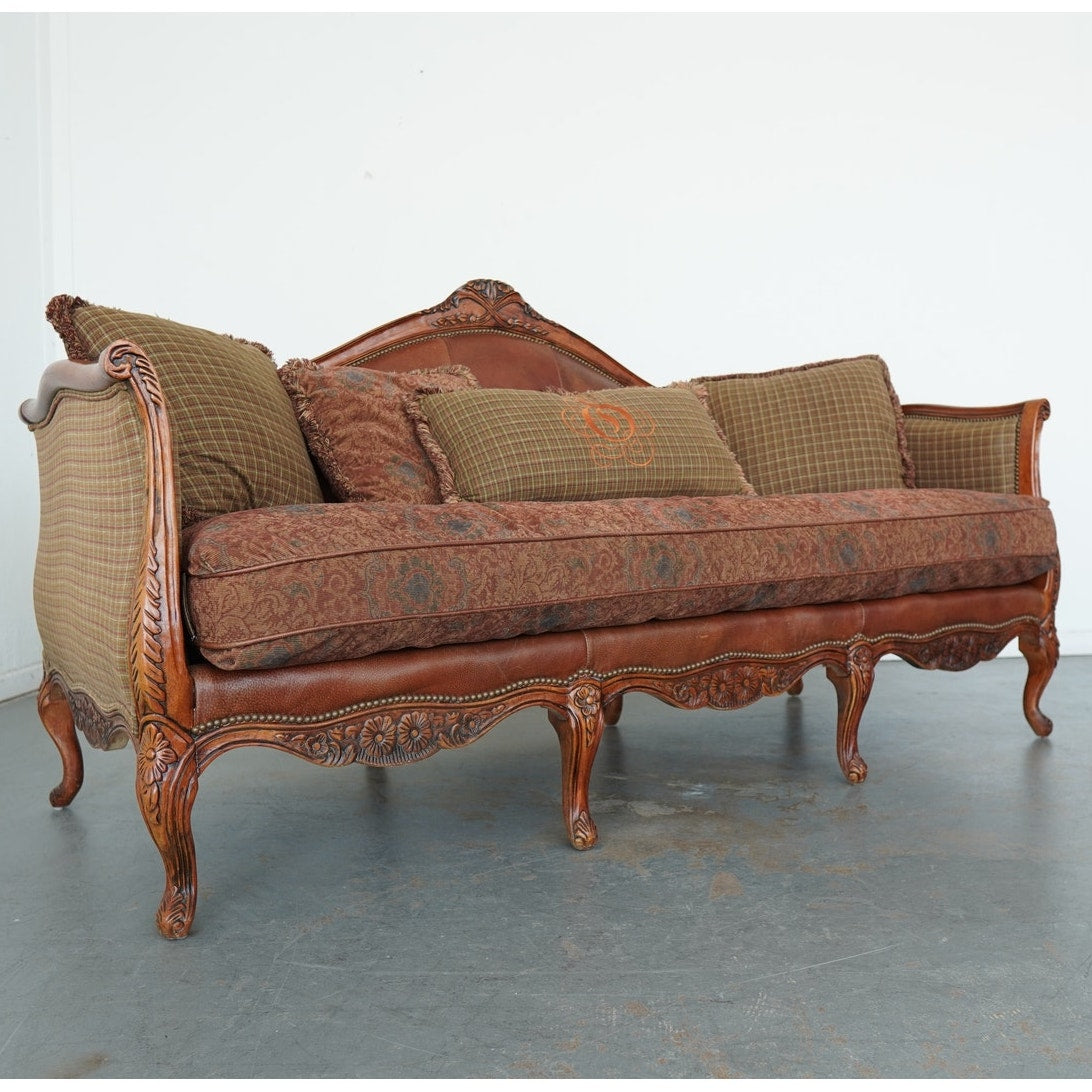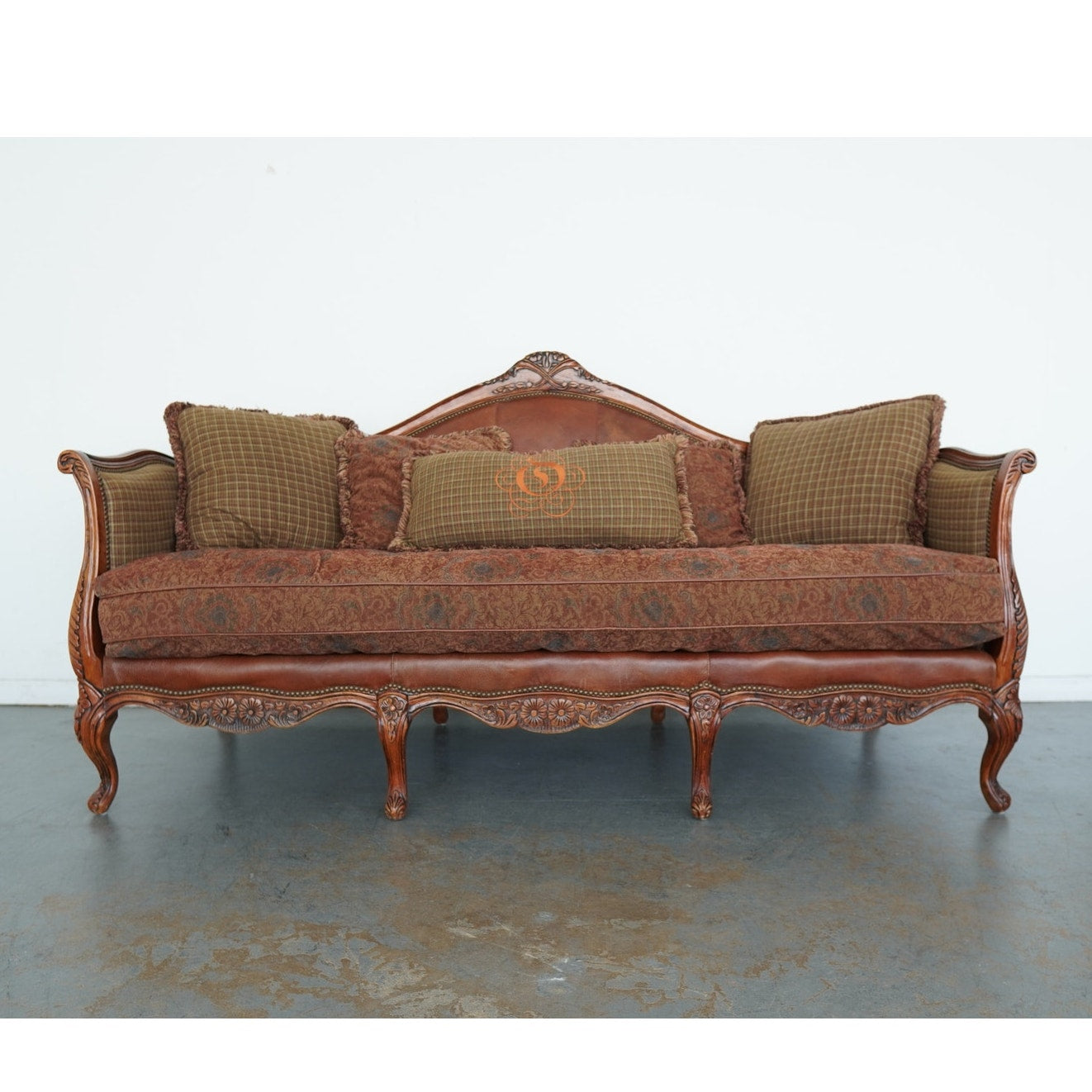 This Louis XV–style sofa features a gracefully contoured silhouette with a richly carved wooden frame, detailed with a sculpted crest rail, floral apron carvings, and cabriole legs. The back is upholstered in warm-toned leather, complemented by patterned seat and side upholstery that creates a layered and traditional look. Nailhead trim follows the contours of the frame, adding a refined finishing touch, while the decorative pillows complete the presentation. Designed with an emphasis on ornamentation and classic European influence, this sofa serves as a striking statement piece well suited to a formal living space or traditional interior.