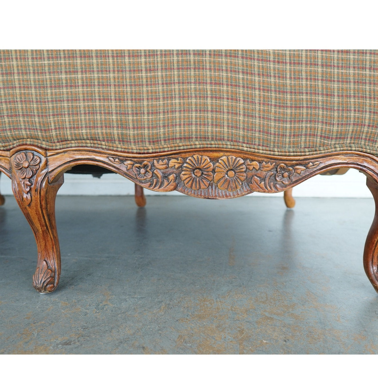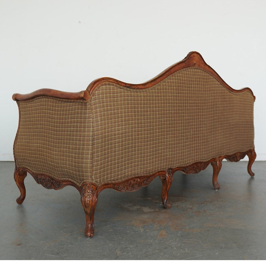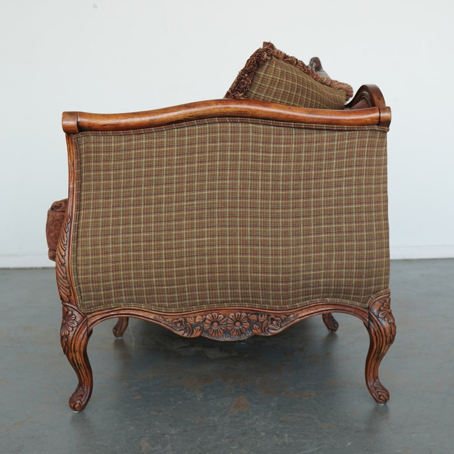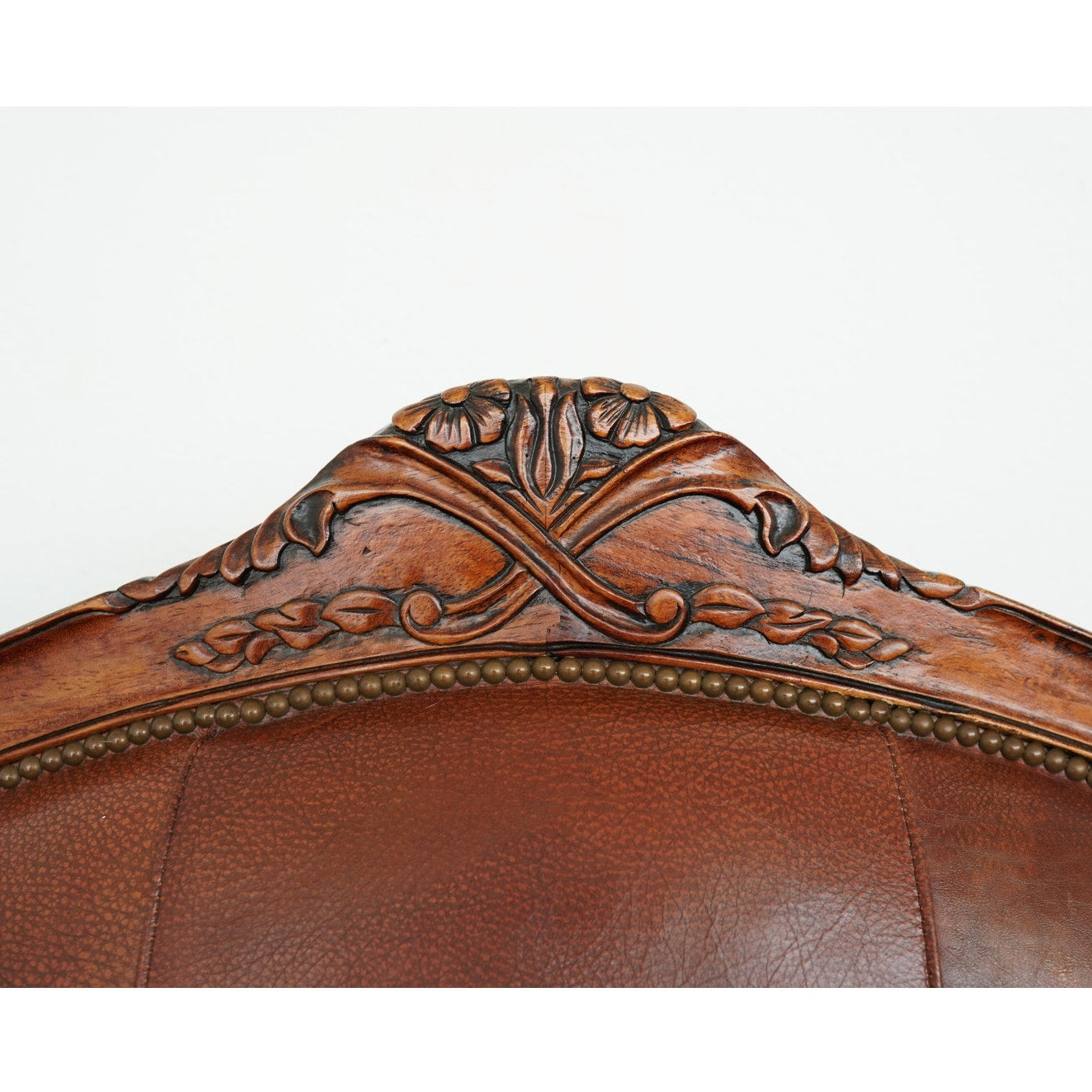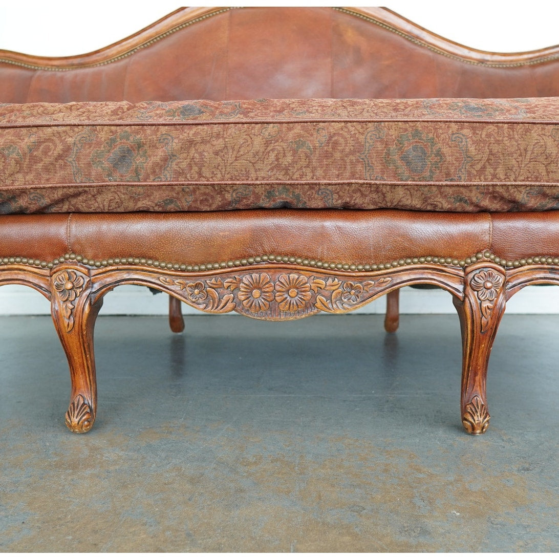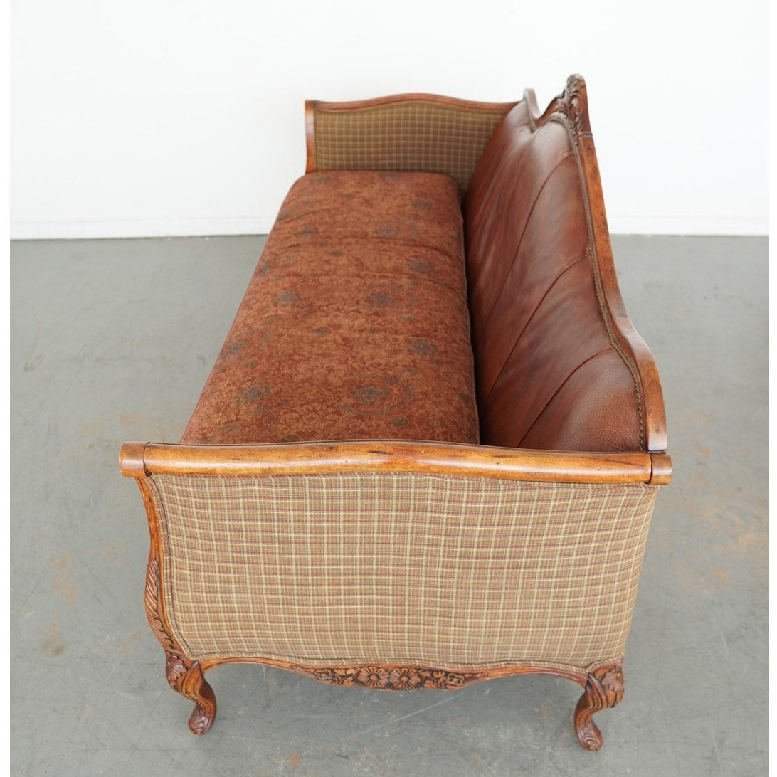 This Louis XV–style sofa features a gracefully contoured silhouette with a richly carved wooden frame, detailed with a sculpted crest rail, floral apron carvings, and cabriole legs. The back is upholstered in warm-toned leather, complemented by patterned seat and side upholstery that creates a layered and traditional look. Nailhead trim follows the contours of the frame, adding a refined finishing touch, while the decorative pillows complete the presentation. Designed with an emphasis on ornamentation and classic European influence, this sofa serves as a striking statement piece well suited to a formal living space or traditional interior.
