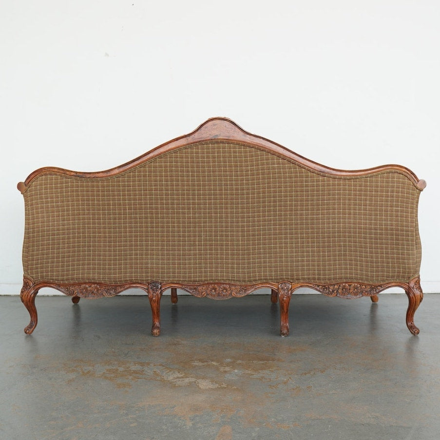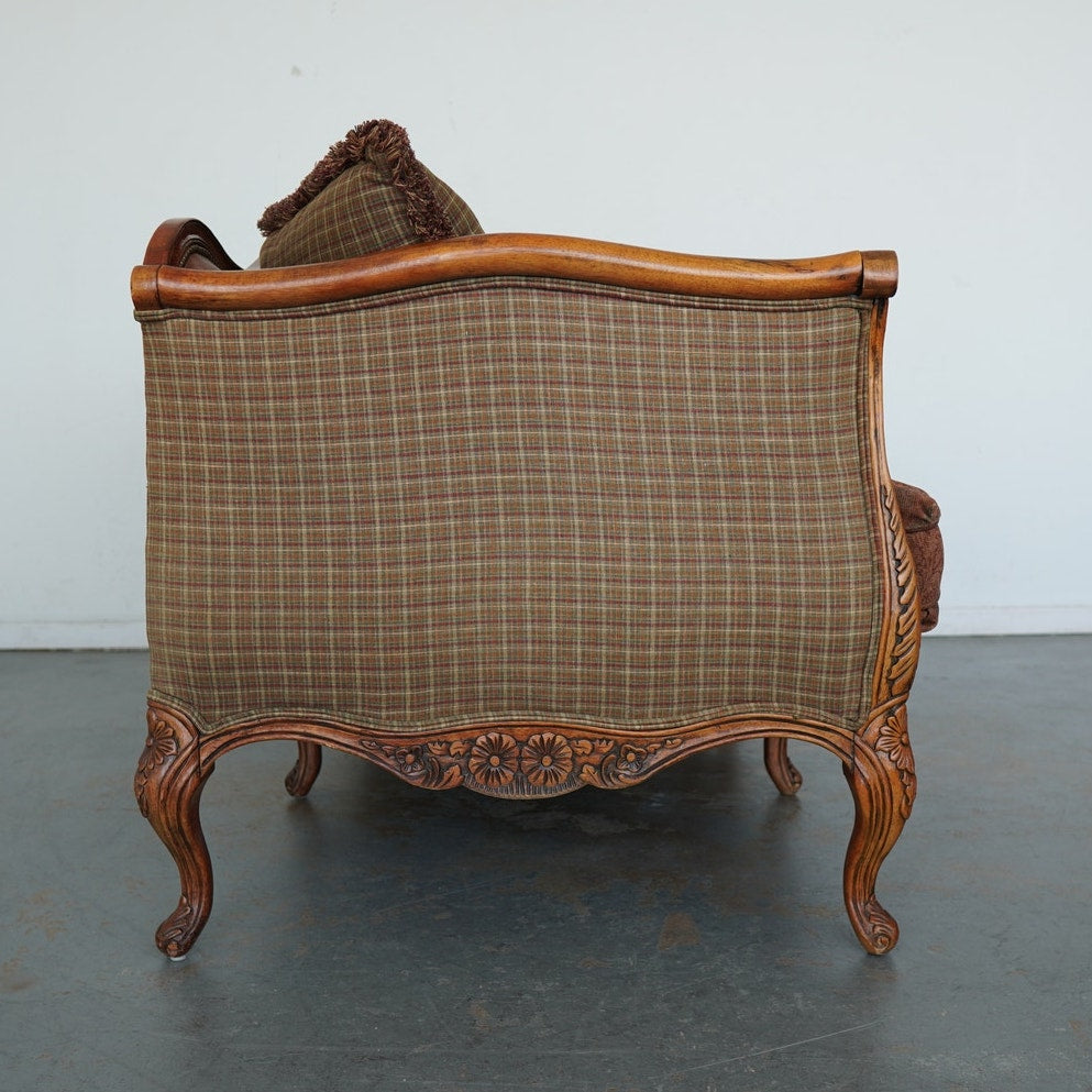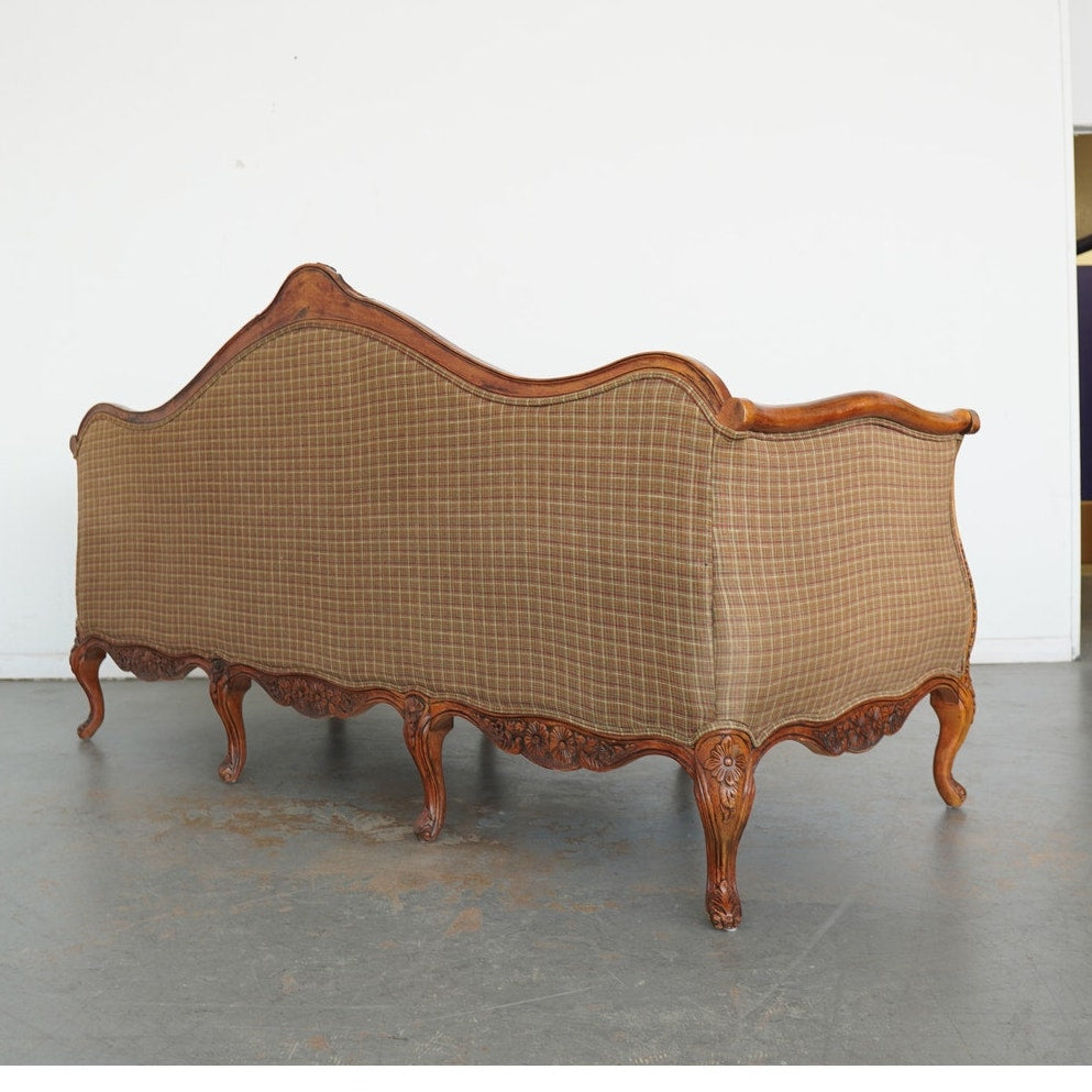 Condition: This sofa is in very good overall condition, with light, age-appropriate wear consistent with normal use. The carved wood frame shows minor surface wear in select areas, and the leather back remains supple with natural variation. The upholstered sections and cushions present well, maintaining their structure and visual appeal. Any signs of wear are cosmetic in nature and do not detract from the sofa’s overall presence or functionality.