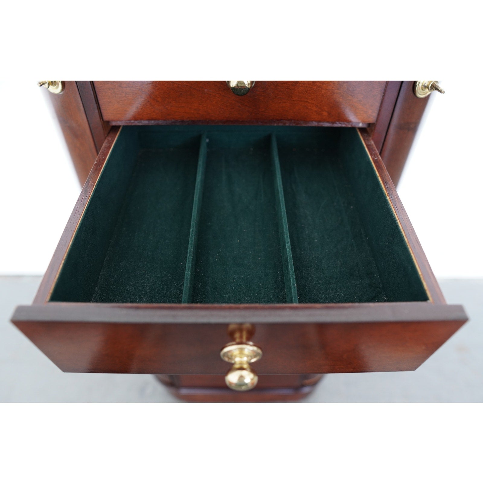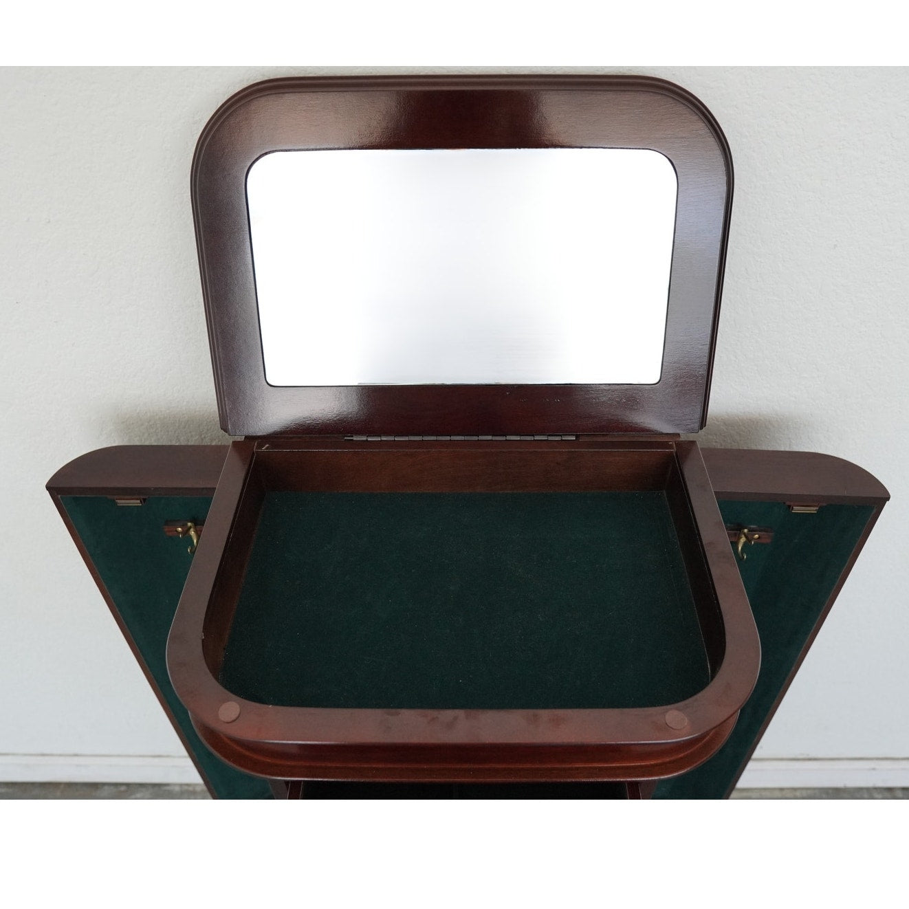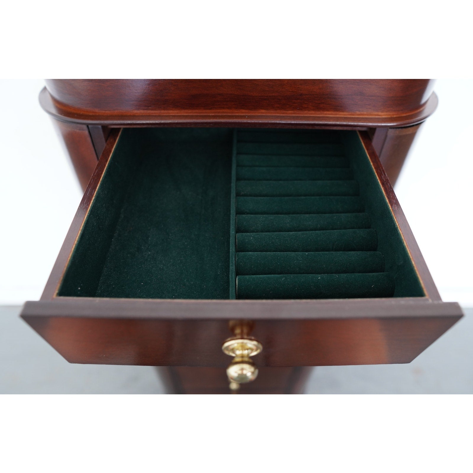 This elegant jewelry armoire by Powell offers both timeless style and practical storage. Finished in a rich mahogany tone, it features eight drawers, each felt-lined to protect your collection. The top four drawers are thoughtfully designed with specialized compartments: ring rolls, divided sections, and necklace slots for organized storage. The lower drawers are open, providing ample room for larger pieces or accessories. Side doors swing open to reveal necklace hooks with catch chains, while the lift-top opens to a mirror and additional storage space for daily use. Brass-tone knobs complement the classic design, adding a refined touch.
