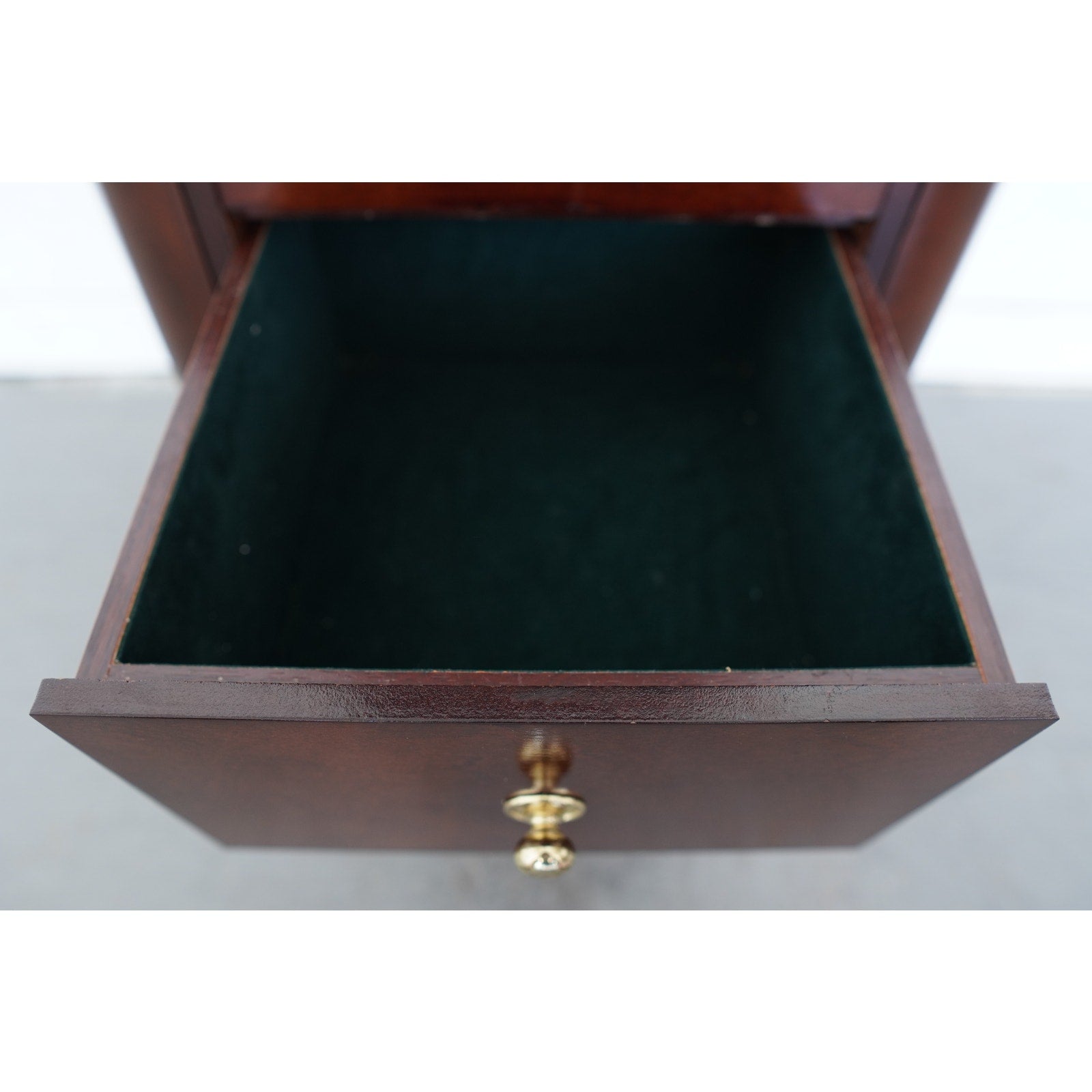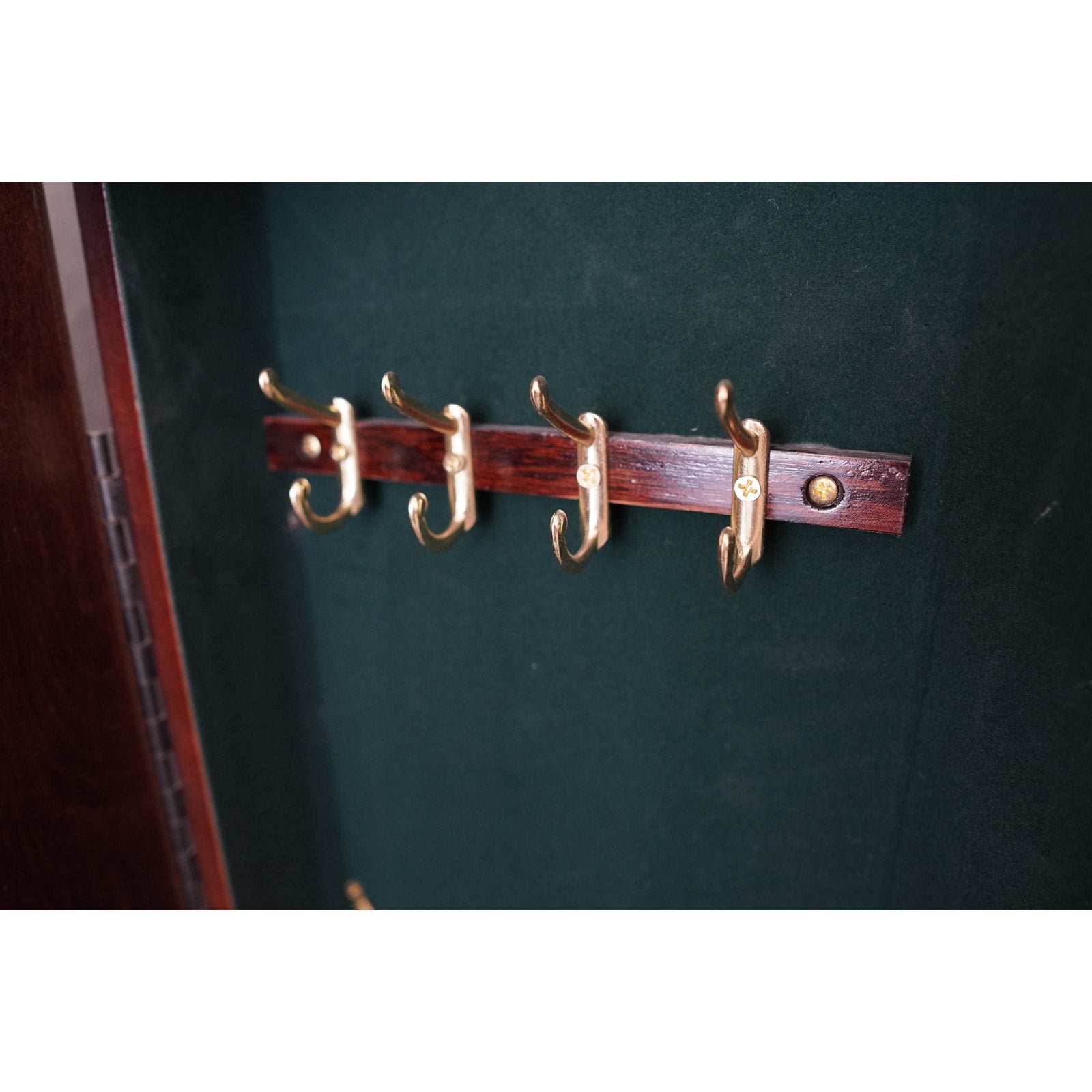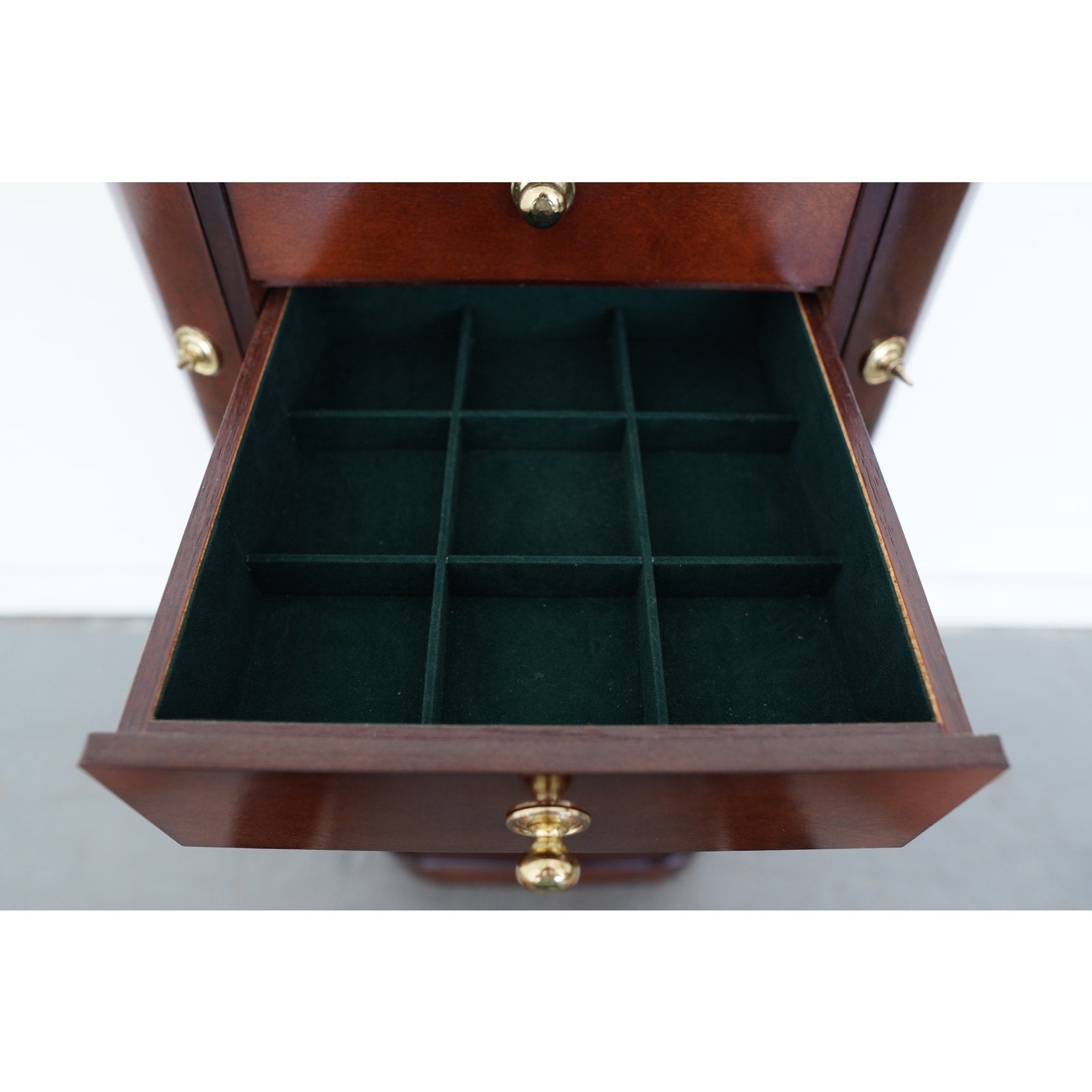 This elegant jewelry armoire by Powell offers both timeless style and practical storage. Finished in a rich mahogany tone, it features eight drawers, each felt-lined to protect your collection. The top four drawers are thoughtfully designed with specialized compartments: ring rolls, divided sections, and necklace slots for organized storage. The lower drawers are open, providing ample room for larger pieces or accessories. Side doors swing open to reveal necklace hooks with catch chains, while the lift-top opens to a mirror and additional storage space for daily use. Brass-tone knobs complement the classic design, adding a refined touch.