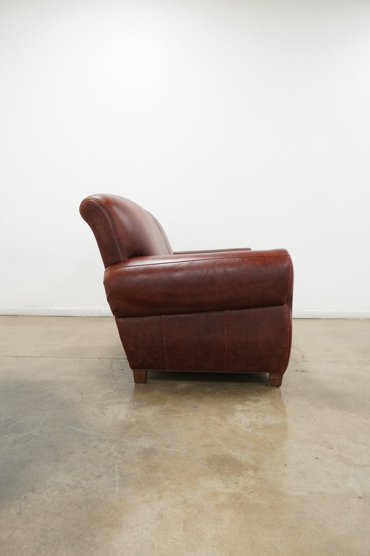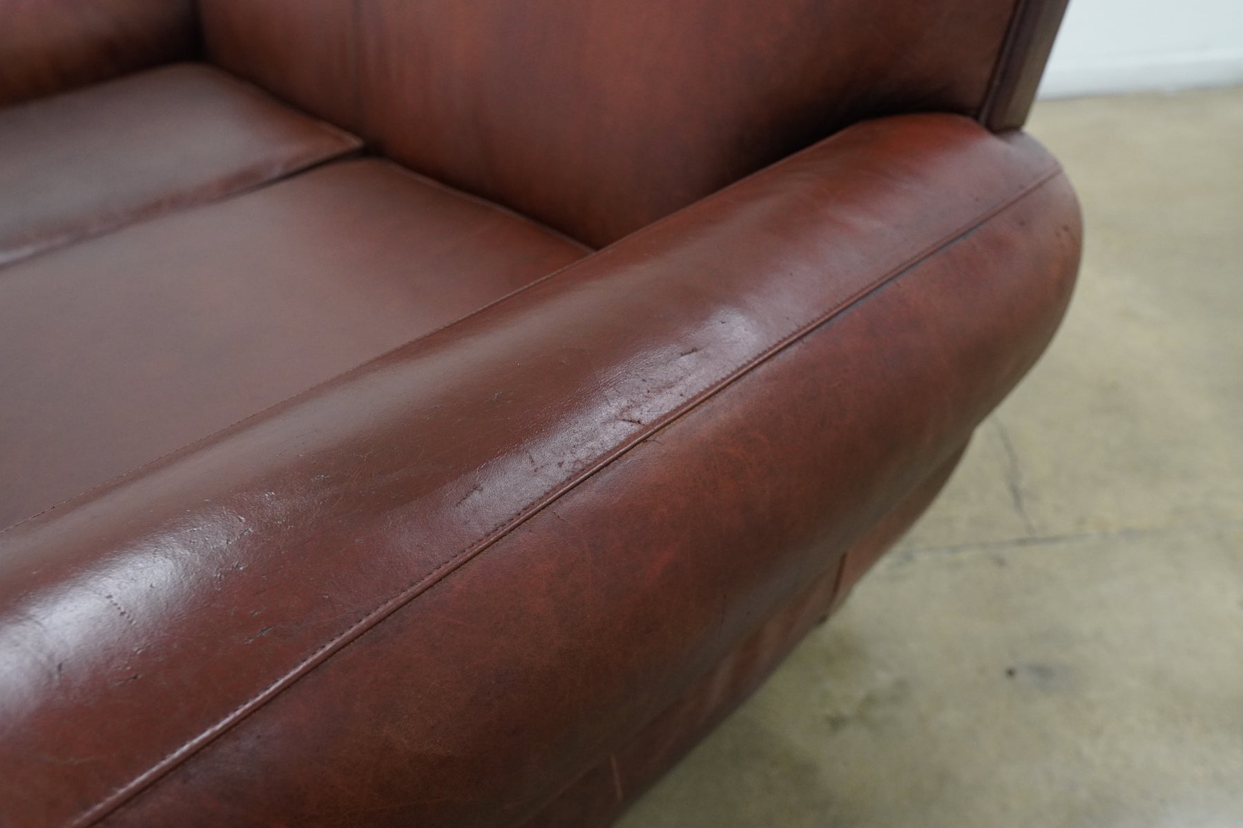 Condition: Good overall condition with visible wear consistent with regular use. The leather shows light surface scratches, scuffs, and areas of rubbing, particularly along the arms where there is some finish wear and minor discoloration. These imperfections are cosmetic in nature and contribute to the natural character of the leather without affecting the structure or function of the piece.