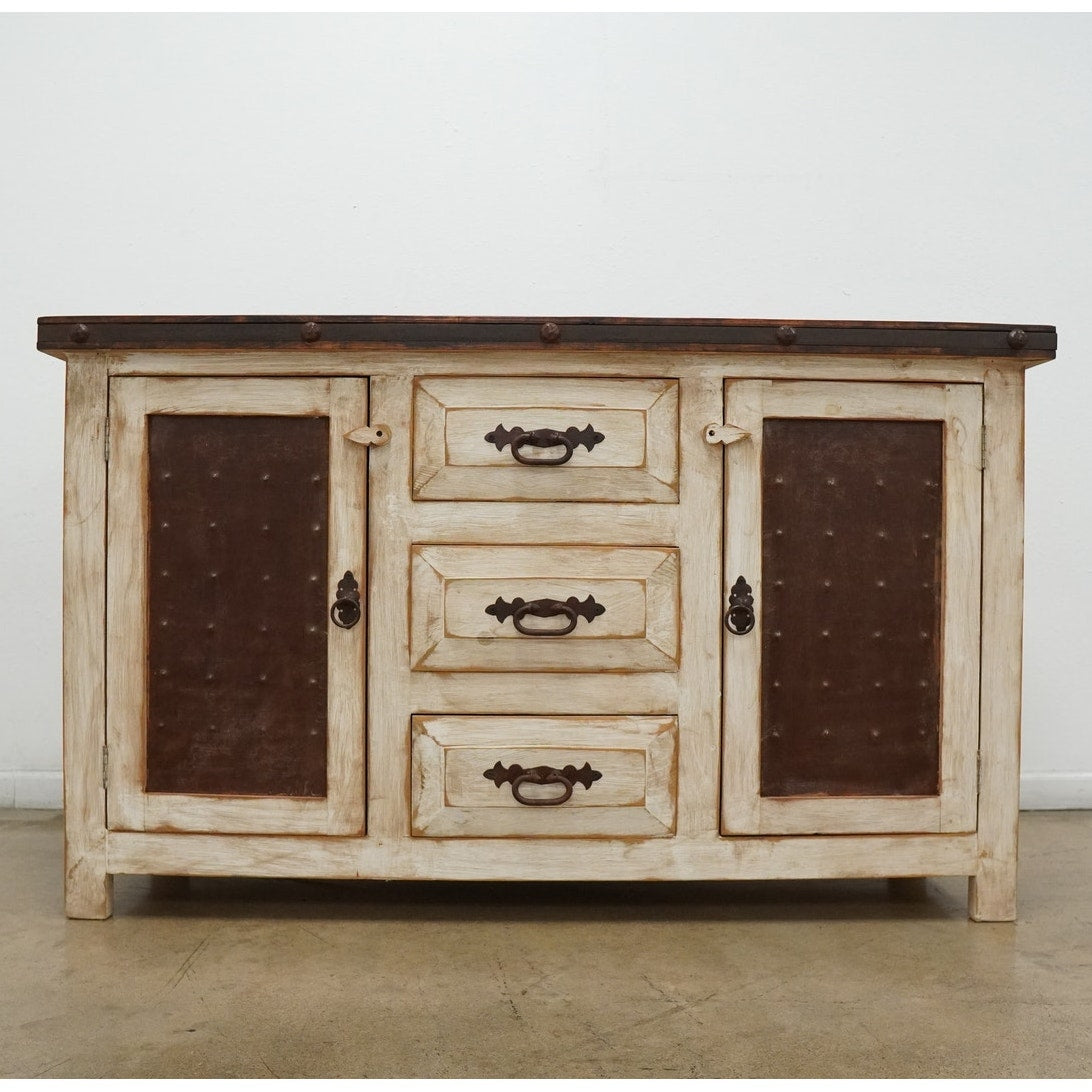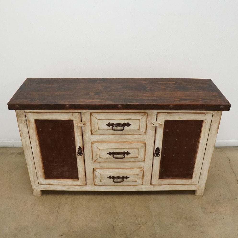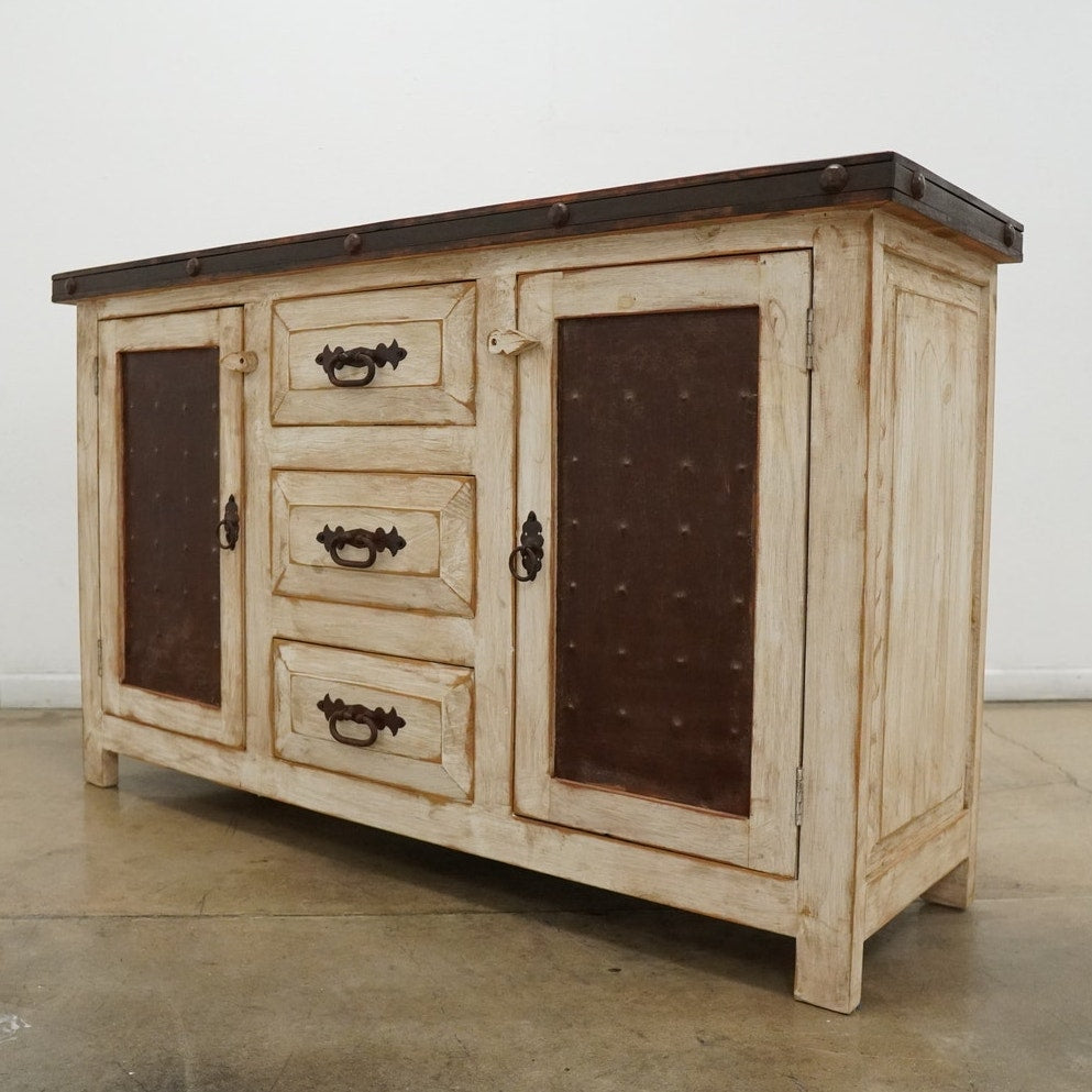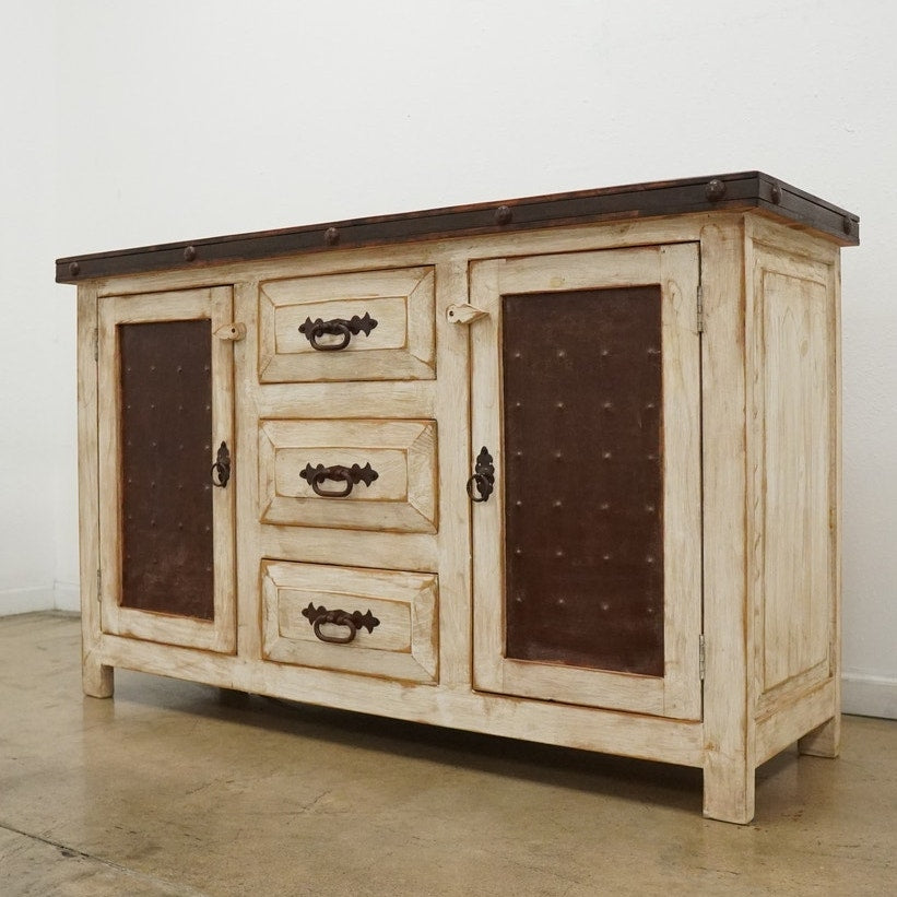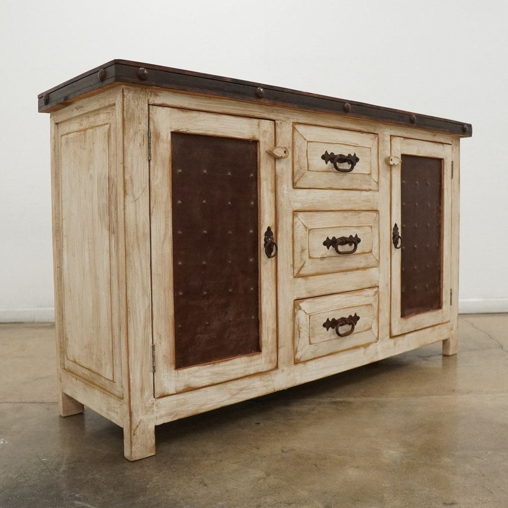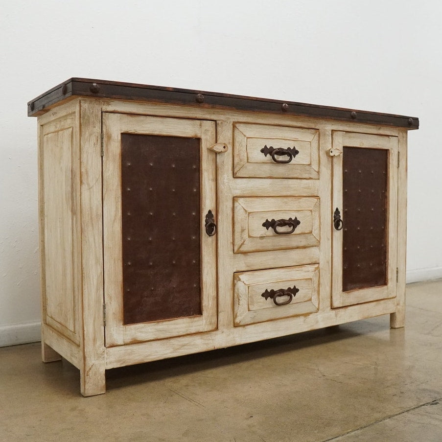 Rustic style media console featuring a distressed whitewashed finish, dark stained wood top, decorative metal hardware, and dark inset door panels. Designed with three center drawers and two side cabinets with interior shelving, this piece offers practical storage for electronics, media, games, remotes, and other living room essentials. Marked “Hecho en Mexico” on the back. A warm, character-rich piece that works well as a TV stand or media cabinet in rustic, farmhouse, southwestern, or hacienda-inspired spaces.