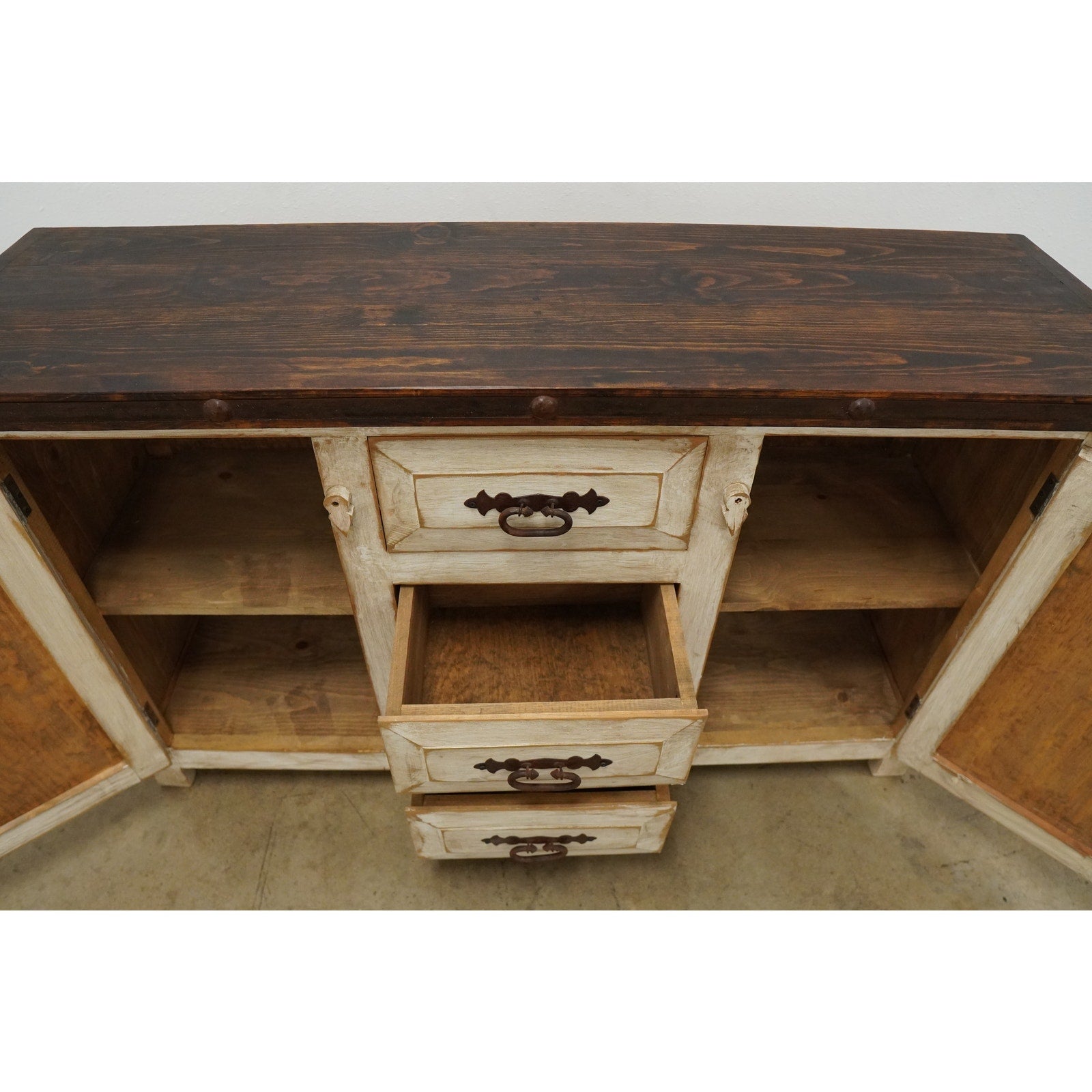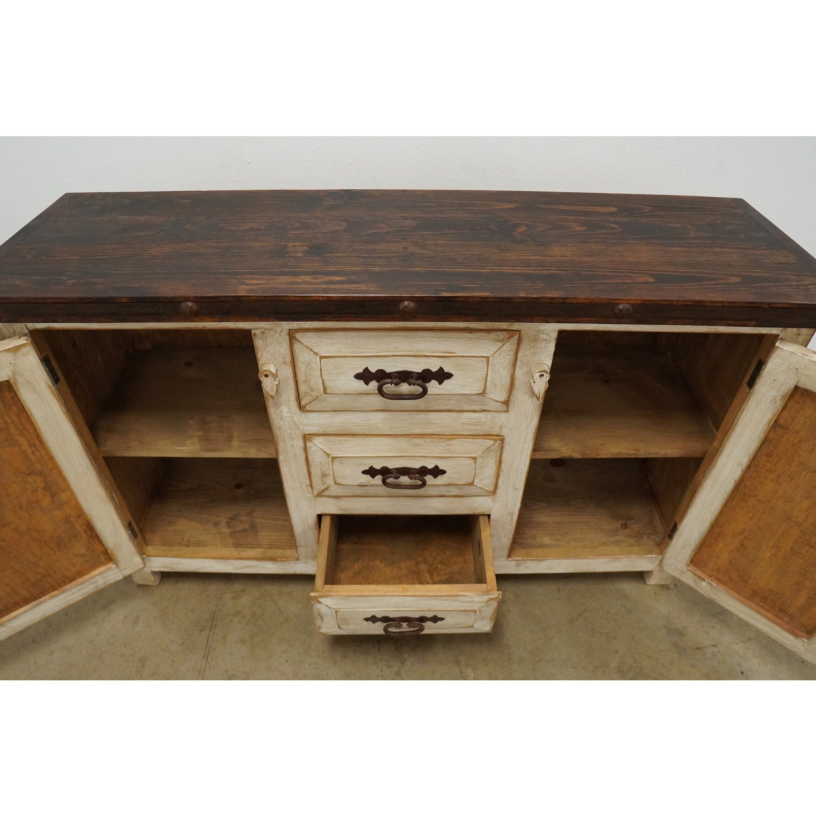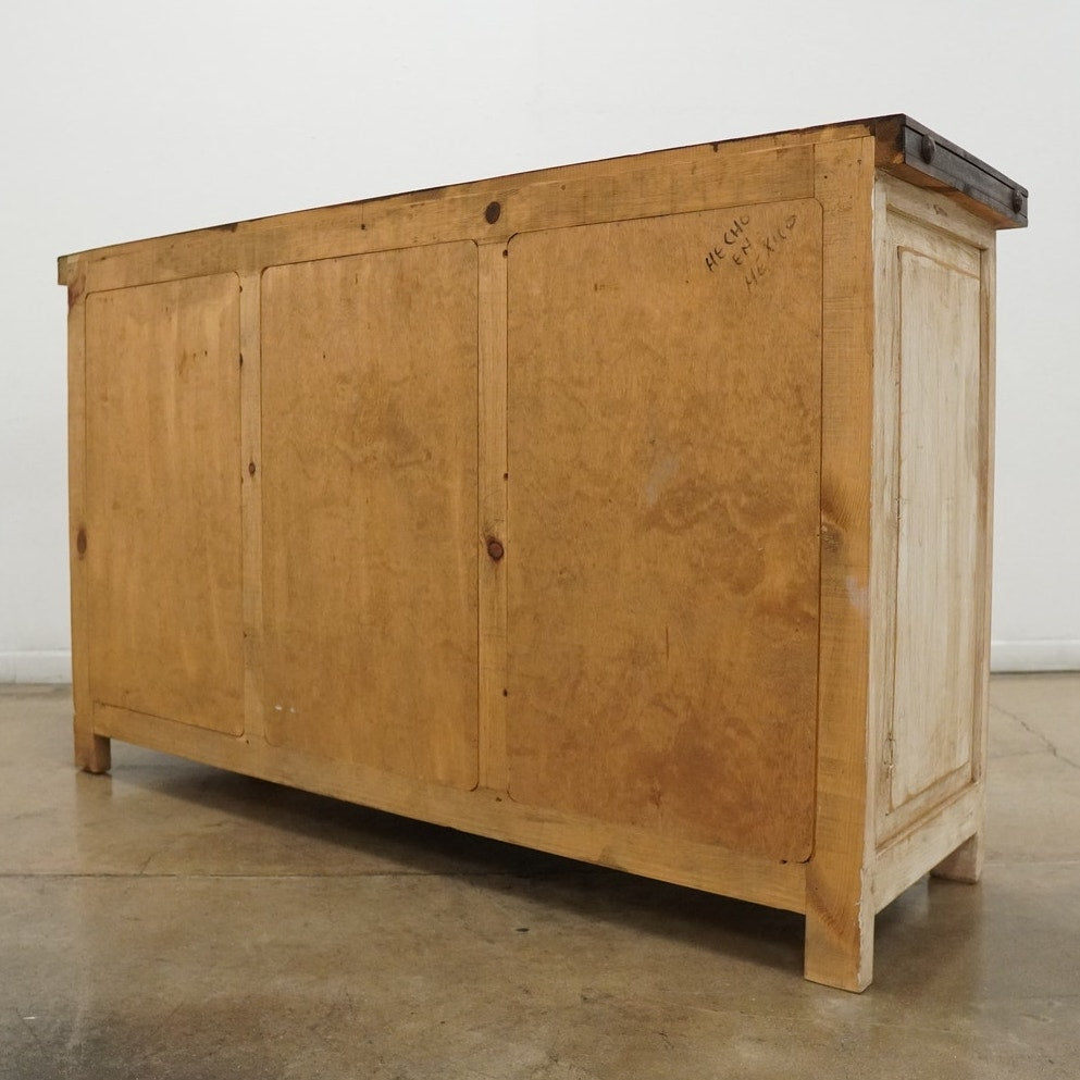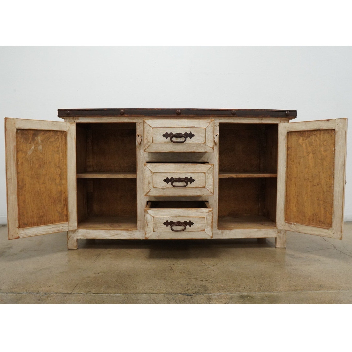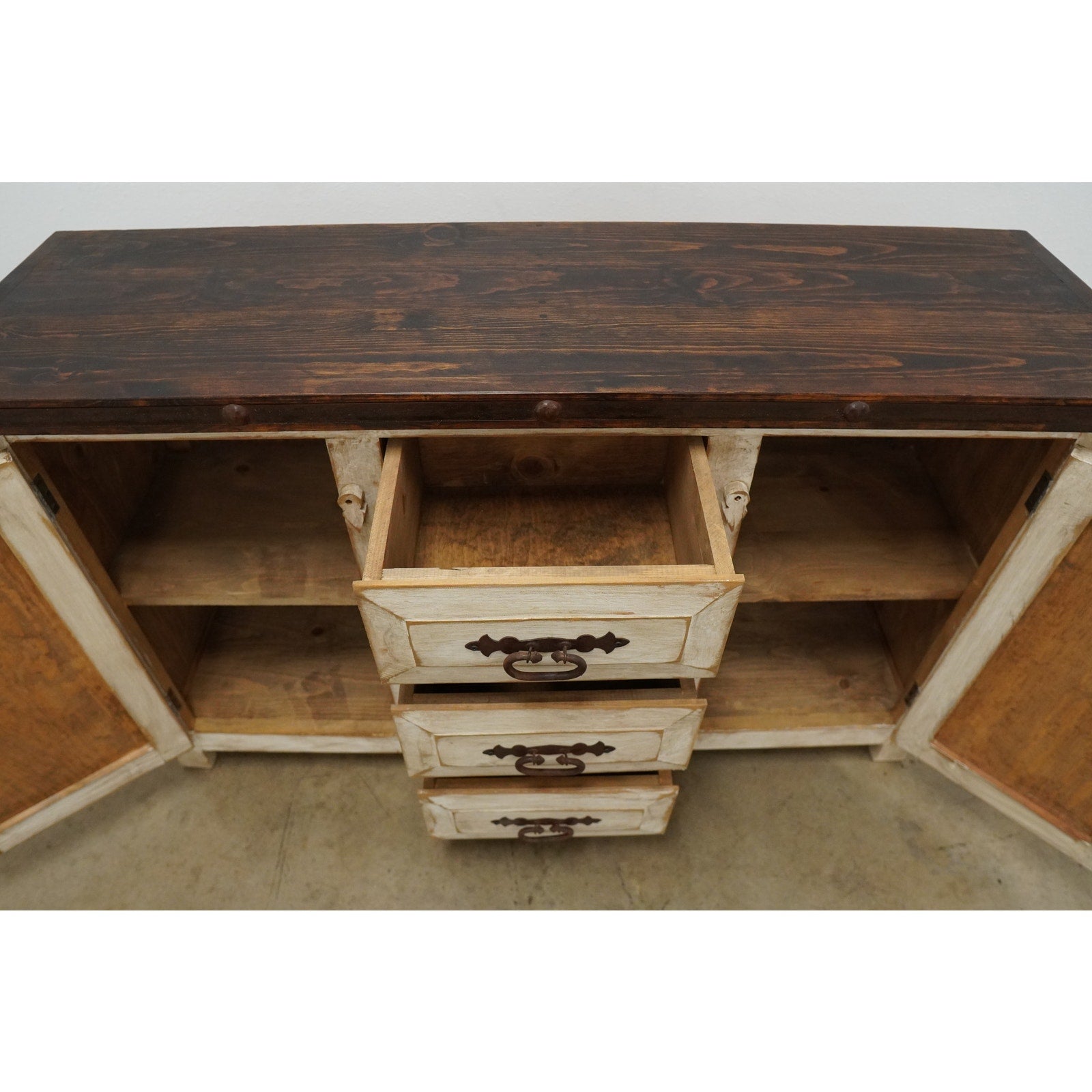 Rustic style media console featuring a distressed whitewashed finish, dark stained wood top, decorative metal hardware, and dark inset door panels. Designed with three center drawers and two side cabinets with interior shelving, this piece offers practical storage for electronics, media, games, remotes, and other living room essentials. Marked “Hecho en Mexico” on the back. A warm, character-rich piece that works well as a TV stand or media cabinet in rustic, farmhouse, southwestern, or hacienda-inspired spaces.