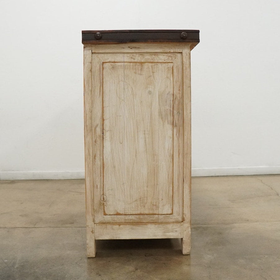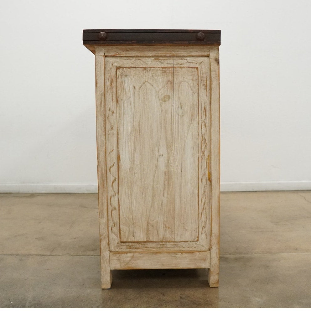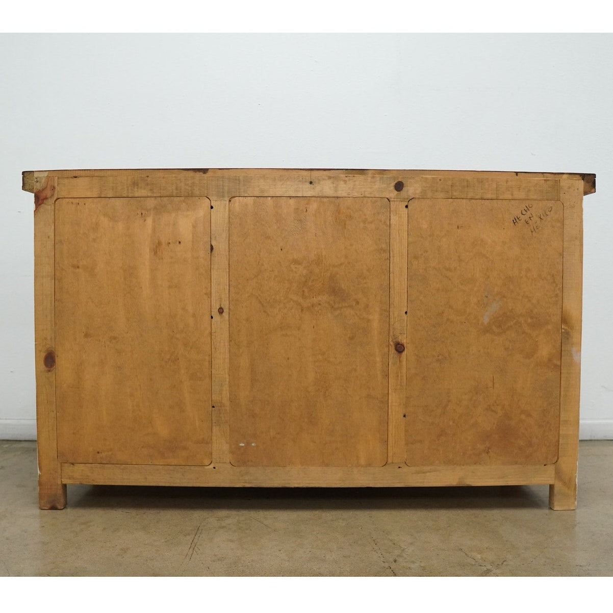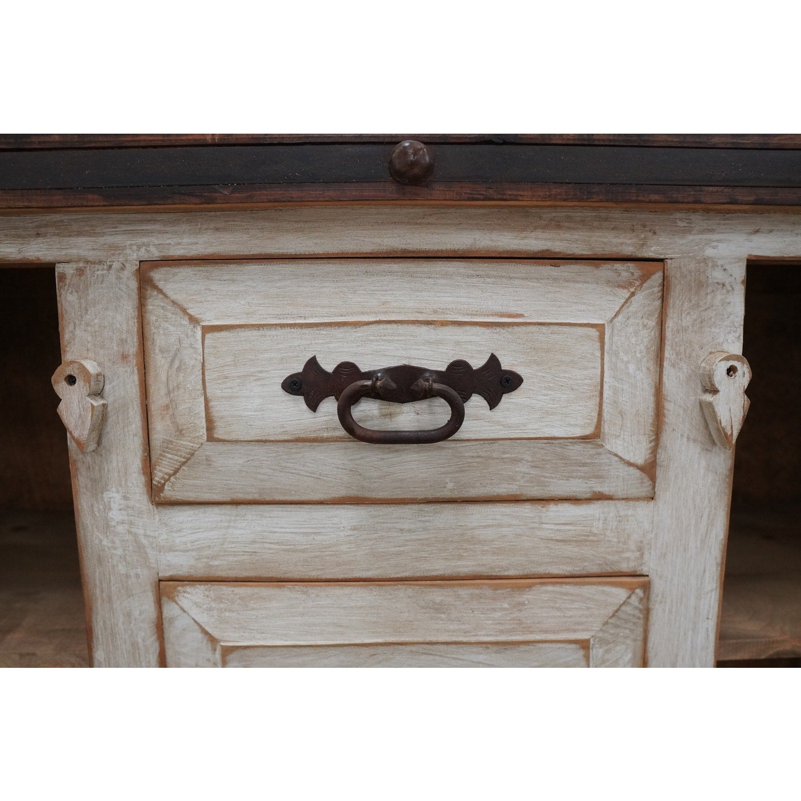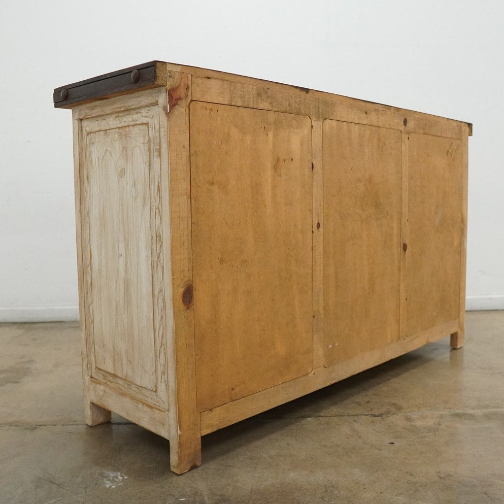Rustic style media console featuring a distressed whitewashed finish, dark stained wood top, decorative metal hardware, and dark inset door panels. Designed with three center drawers and two side cabinets with interior shelving, this piece offers practical storage for electronics, media, games, remotes, and other living room essentials. Marked “Hecho en Mexico” on the back. A warm, character-rich piece that works well as a TV stand or media cabinet in rustic, farmhouse, southwestern, or hacienda-inspired spaces.
