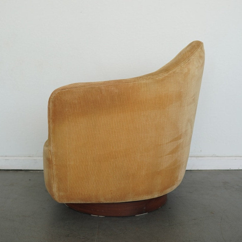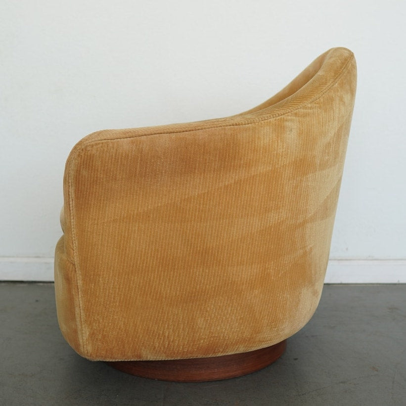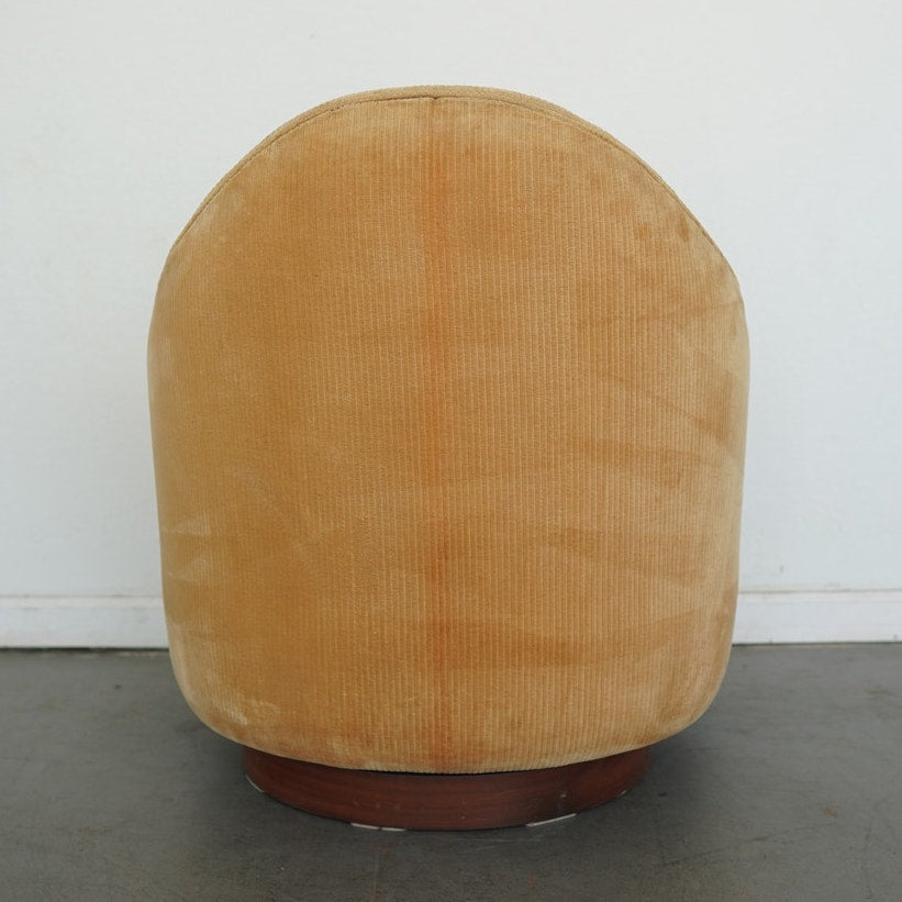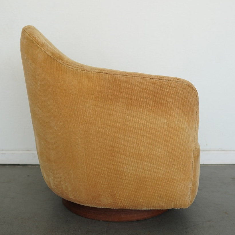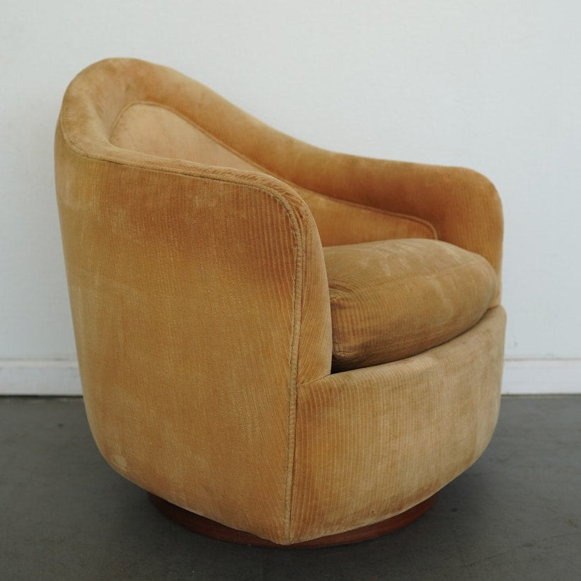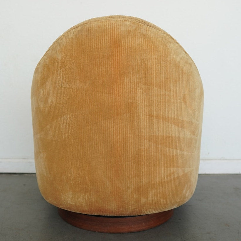 Originally designed in 1973 by Milo Baughman, the Tear Drop swivel-tilt chair is a modern classic. Featuring our unique swivel-tilt base and revolutionary construction, the Tear Drop gently cradles while seemingly floating on air. Upholstered in a plush golden camel corduroy velvet, the texture and tone add warmth and mid-century charm. Each chair rests on a rich walnut swivel base, allowing for smooth 360° movement and a gentle tilt for relaxed lounging.