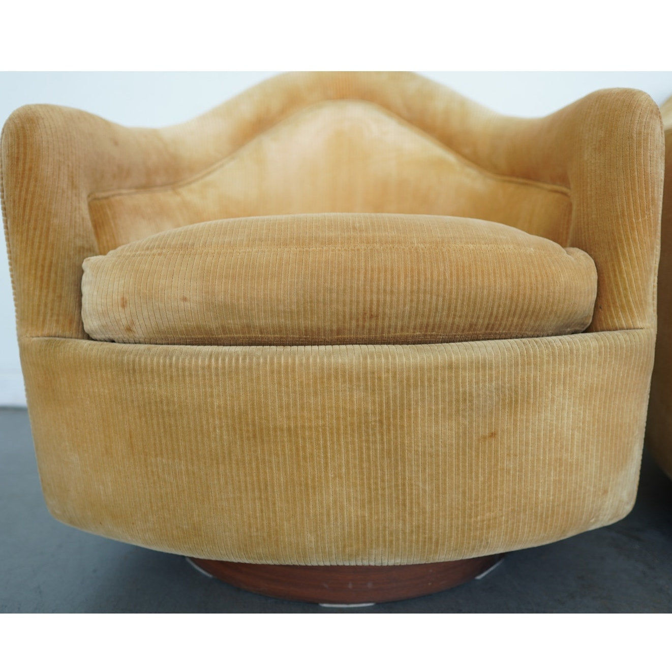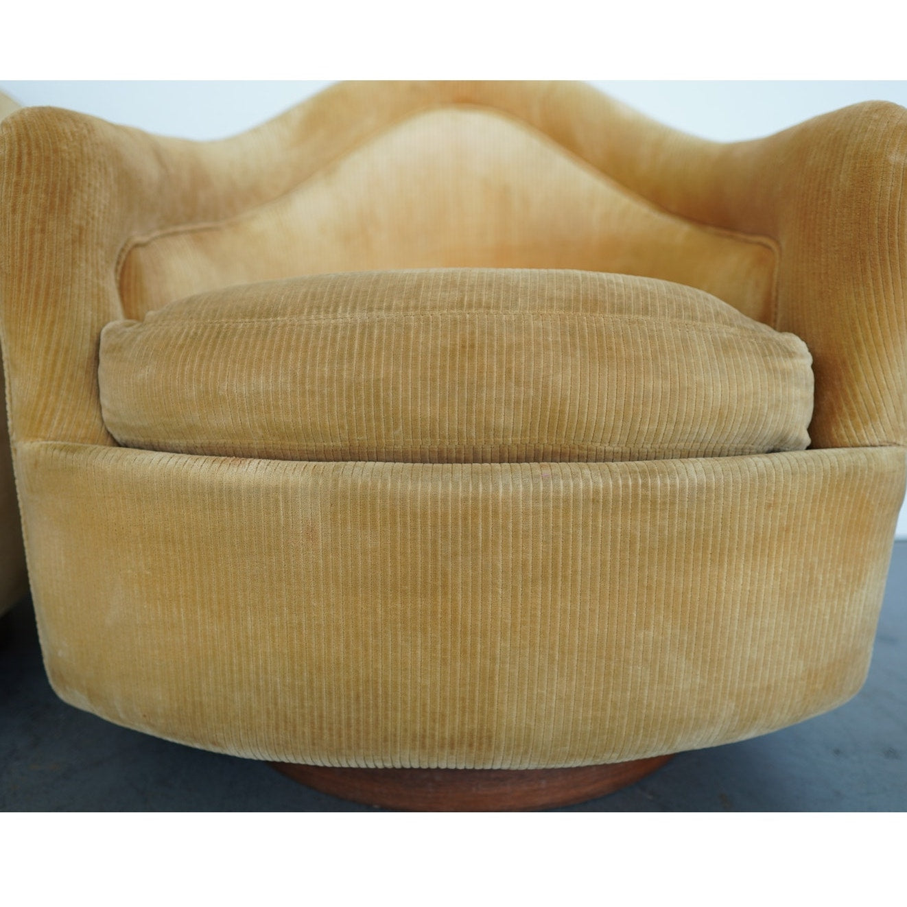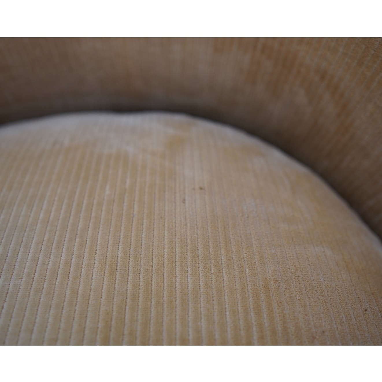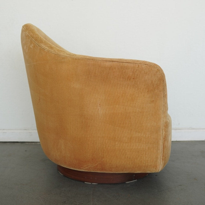 Originally designed in 1973 by Milo Baughman, the Tear Drop swivel-tilt chair is a modern classic. Featuring our unique swivel-tilt base and revolutionary construction, the Tear Drop gently cradles while seemingly floating on air. Upholstered in a plush golden camel corduroy velvet, the texture and tone add warmth and mid-century charm. Each chair rests on a rich walnut swivel base, allowing for smooth 360° movement and a gentle tilt for relaxed lounging.