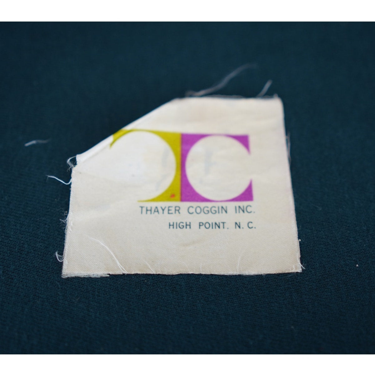 Condition: Good condition. Each chair shows some gentle discoloration—one at the seat cushion and the other along the front of the seat base. Both also feature a faint vertical line of discoloration running down the back, which appears consistently on each chair and is believed to be characteristic of the fabric rather than a stain. There is a small hole along the back seam of one chair. (see photos) The walnut bases display only minimal wear consistent with age and use.