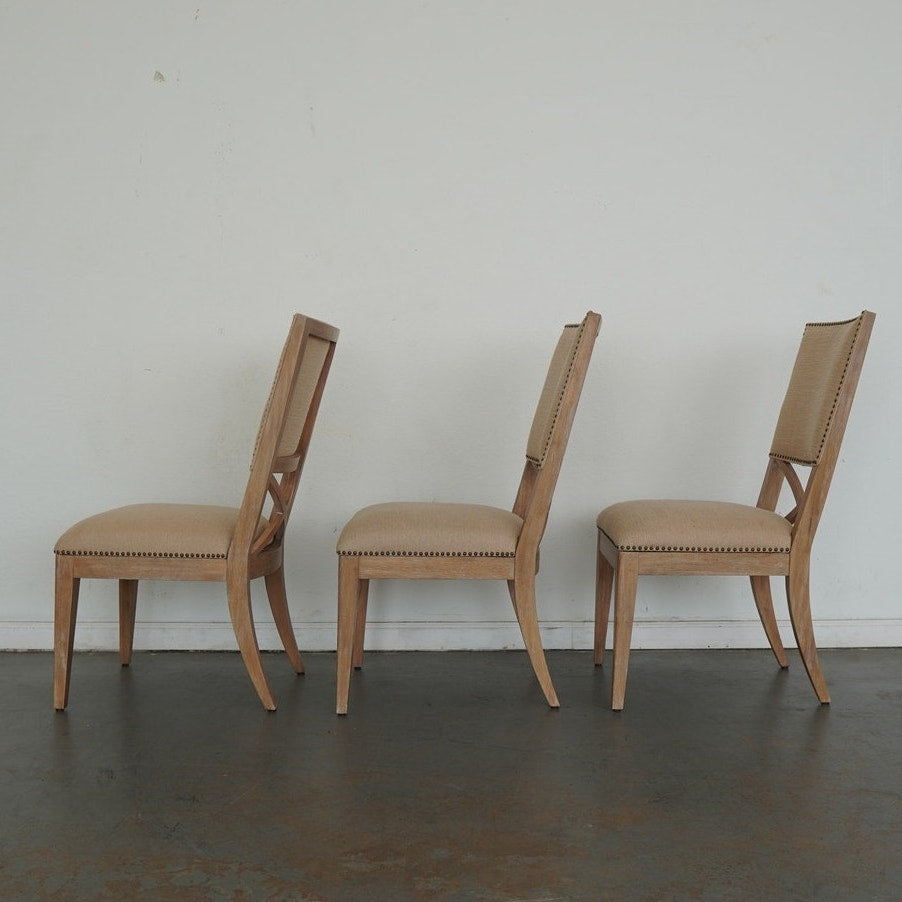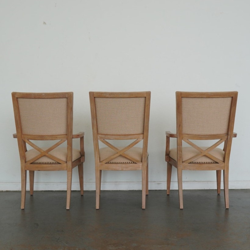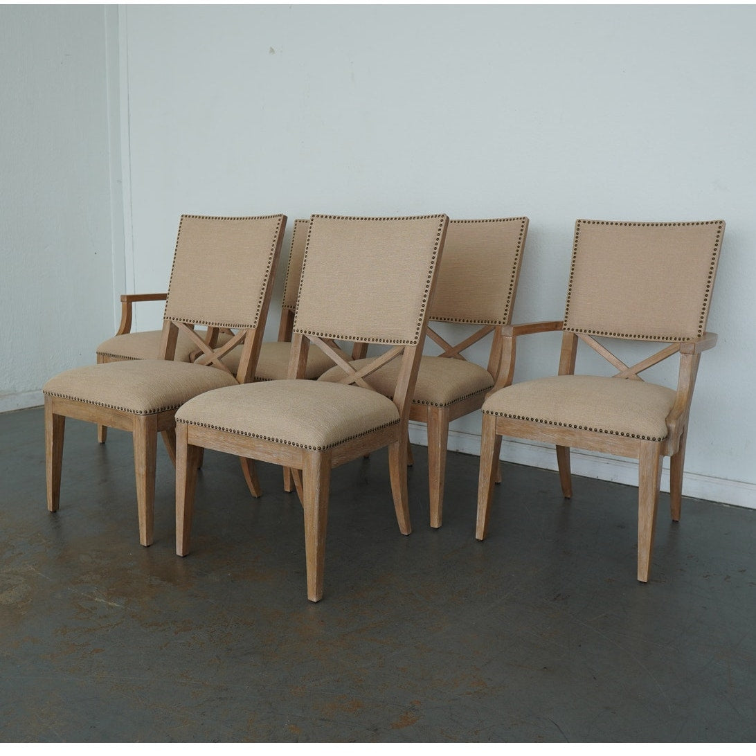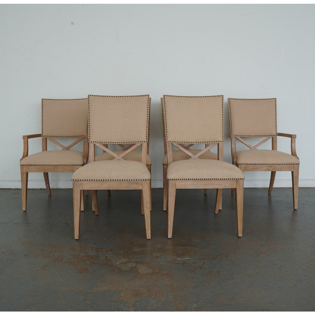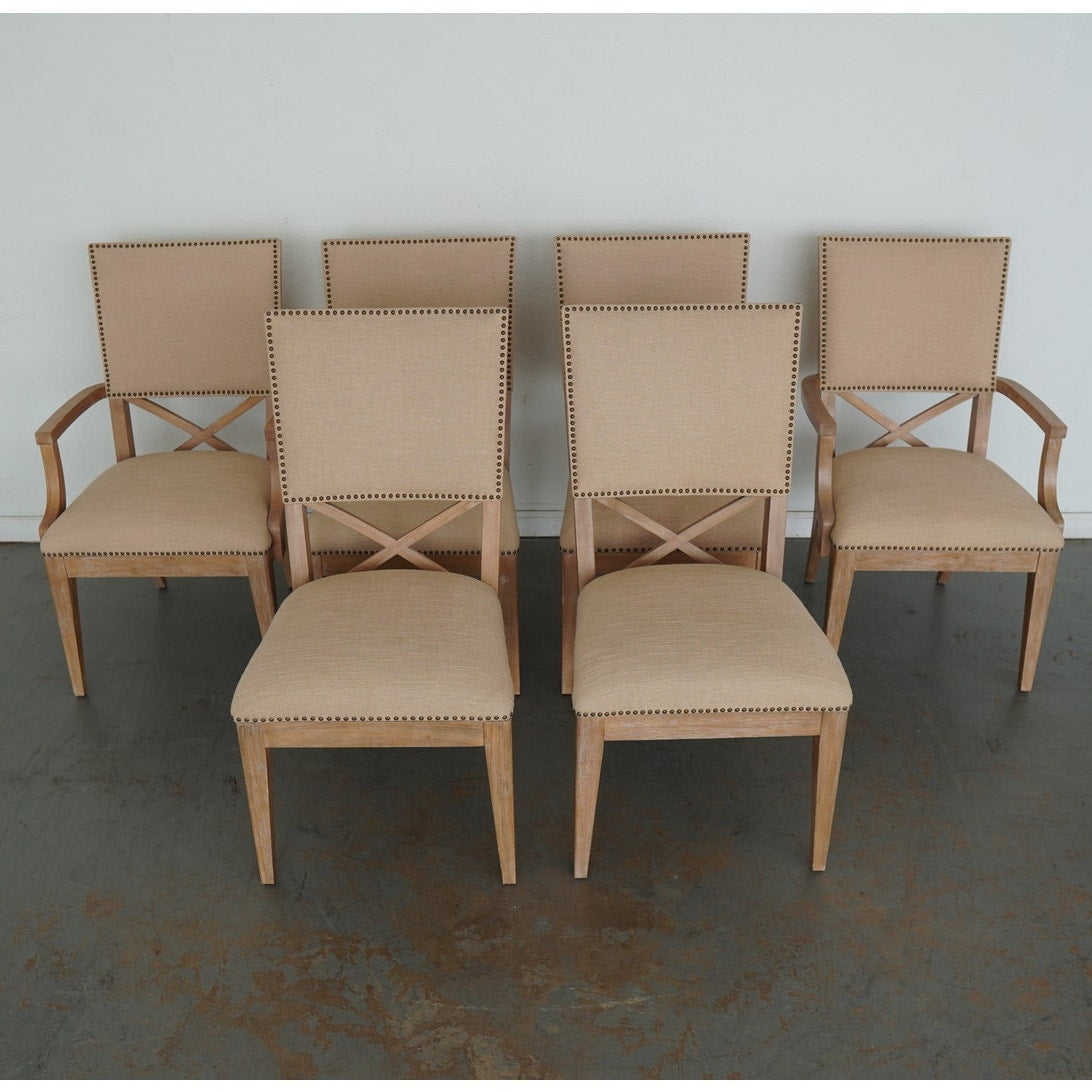 The ideal pairing of comfort and design, these dining chairs feature an upholstered back with a contemporary X-back lumbar detail that defines their tailored silhouette. Upholstered as shown in Ellerston fabric 429141, a woven construction with the look of natural linen, they’re finished in a soft golden maize tone and trimmed in a spaced, natural-finished nailhead for a refined touch. This set includes 2 armchairs and 4 side chairs.