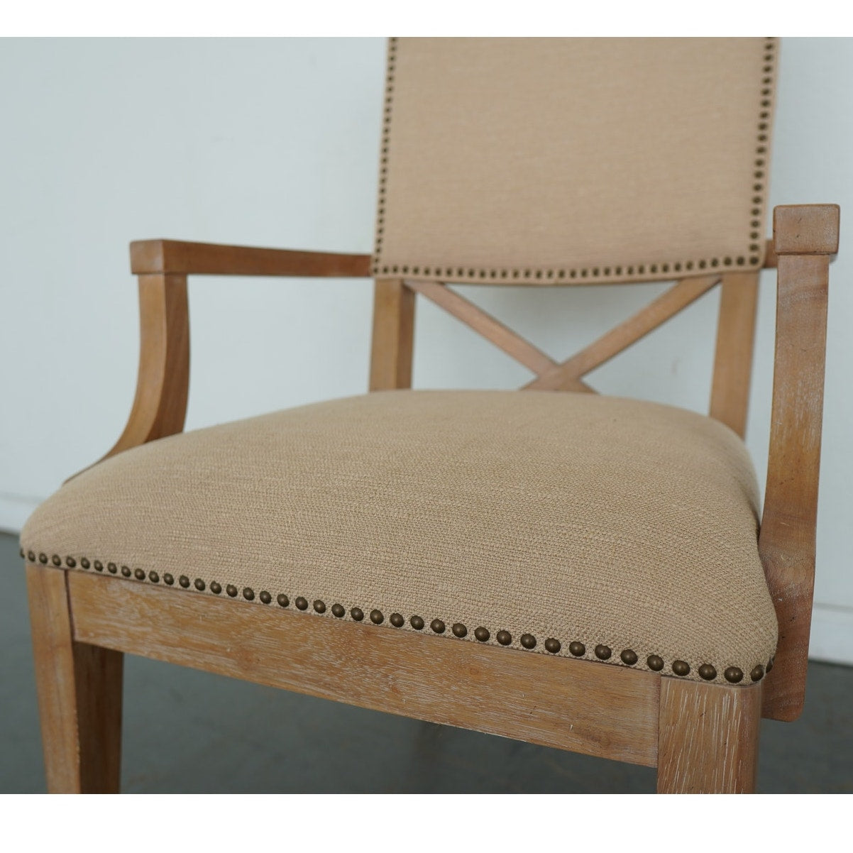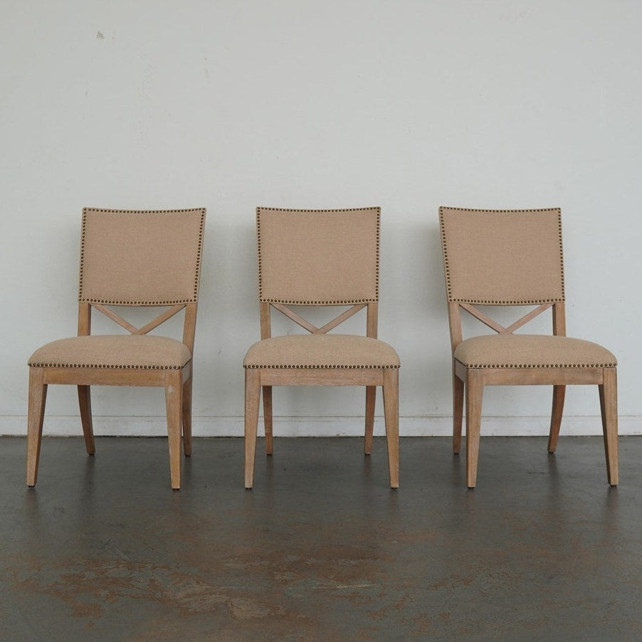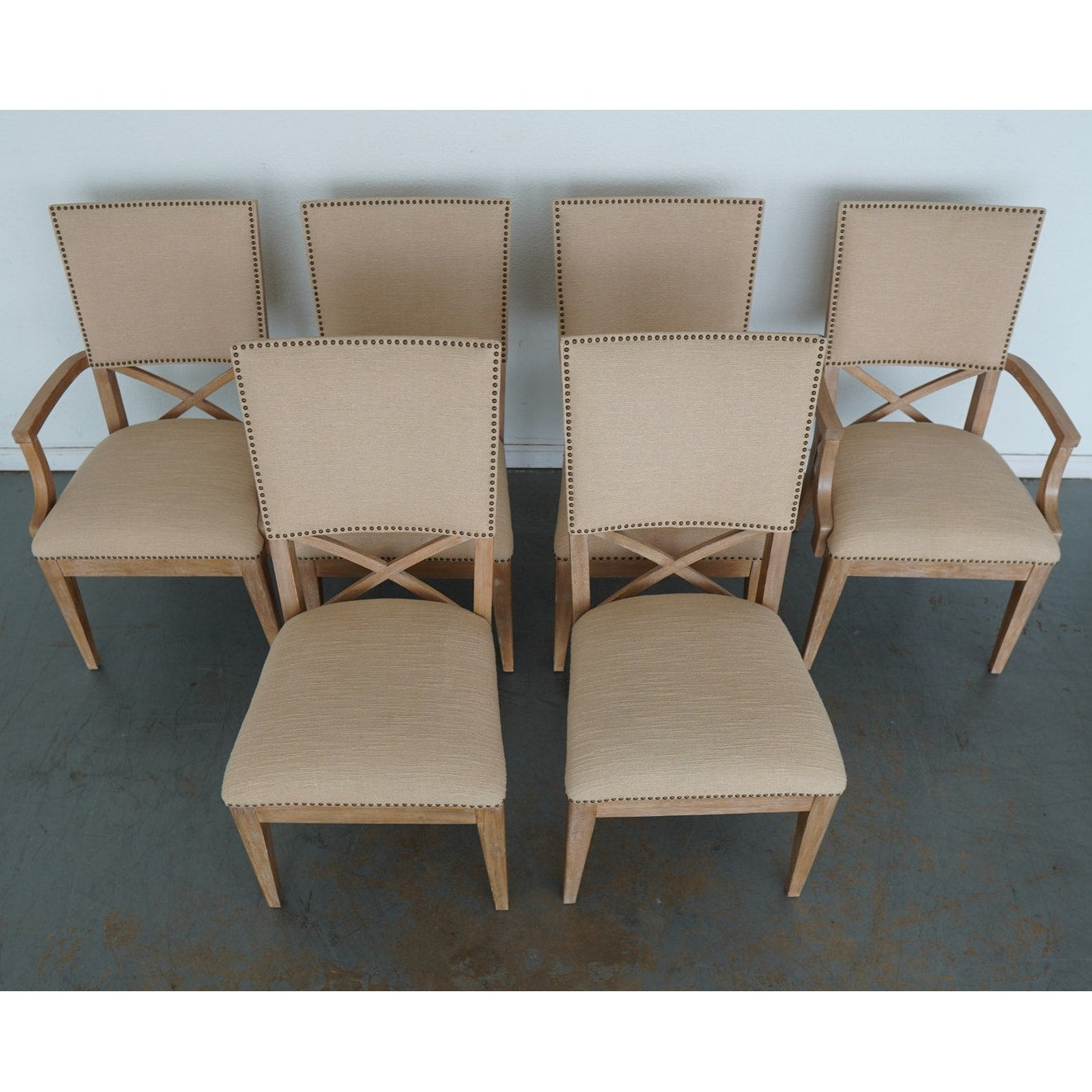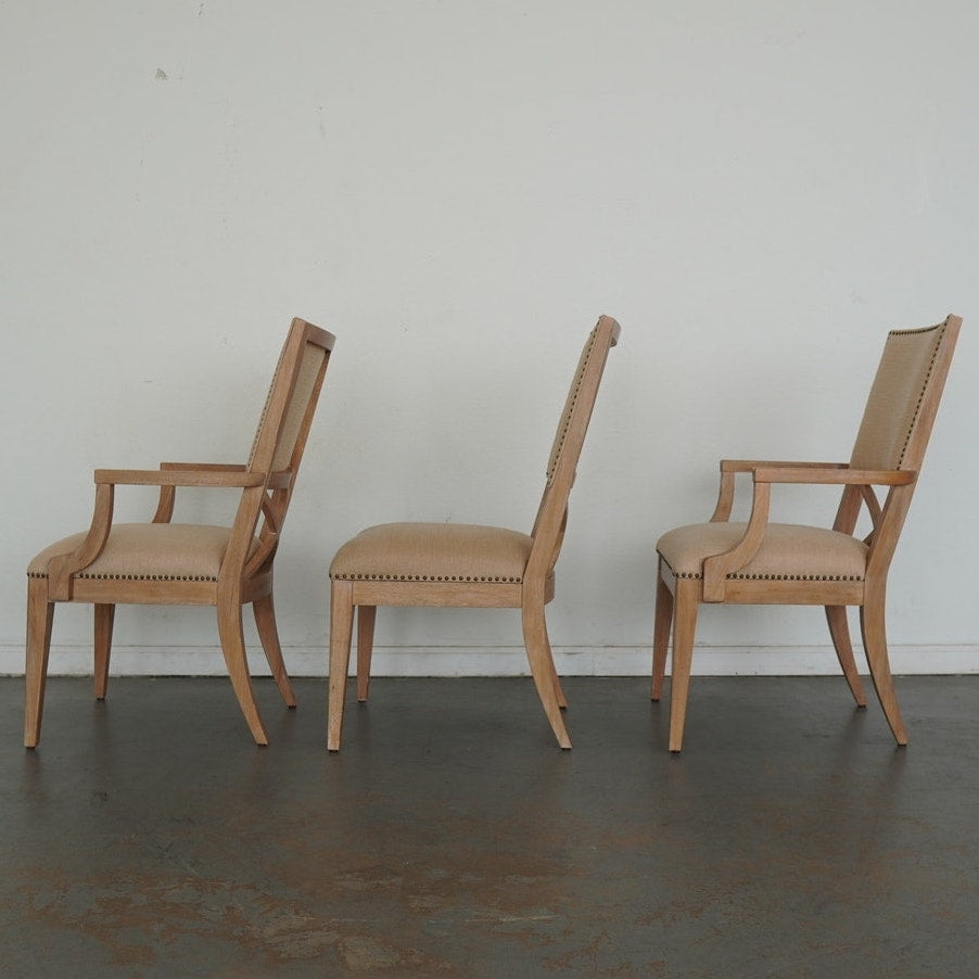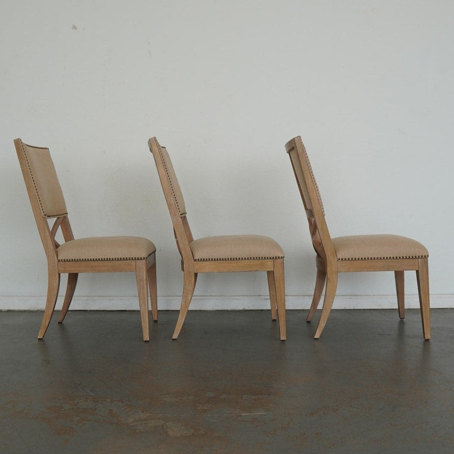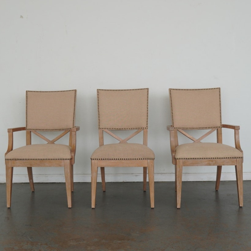 The ideal pairing of comfort and design, these dining chairs feature an upholstered back with a contemporary X-back lumbar detail that defines their tailored silhouette. Upholstered as shown in Ellerston fabric 429141, a woven construction with the look of natural linen, they’re finished in a soft golden maize tone and trimmed in a spaced, natural-finished nailhead for a refined touch. This set includes 2 armchairs and 4 side chairs.