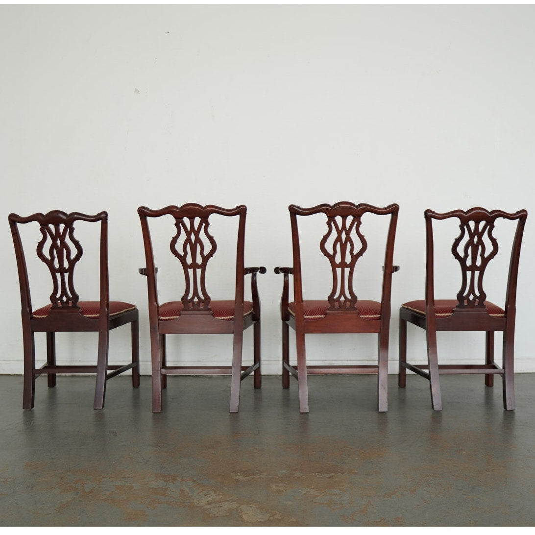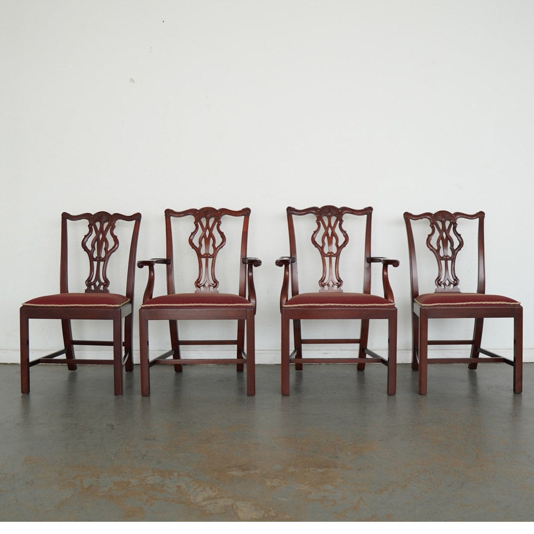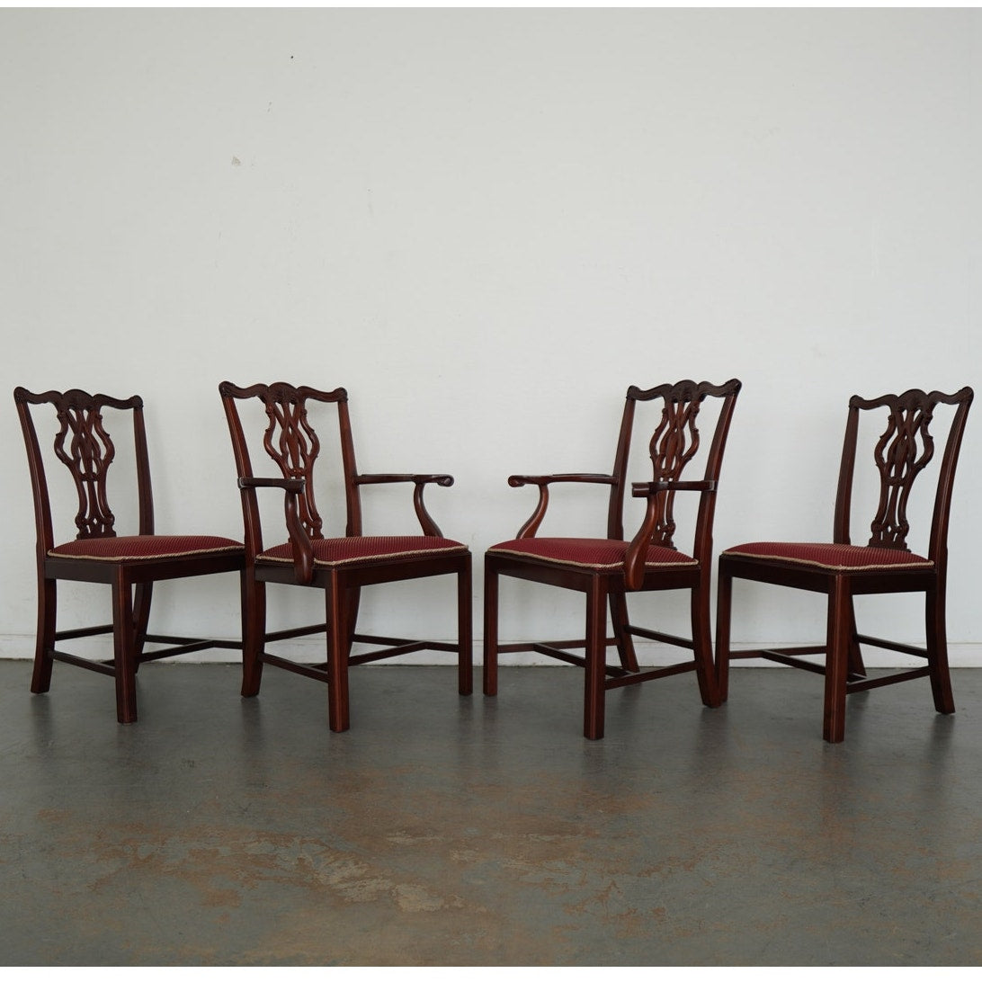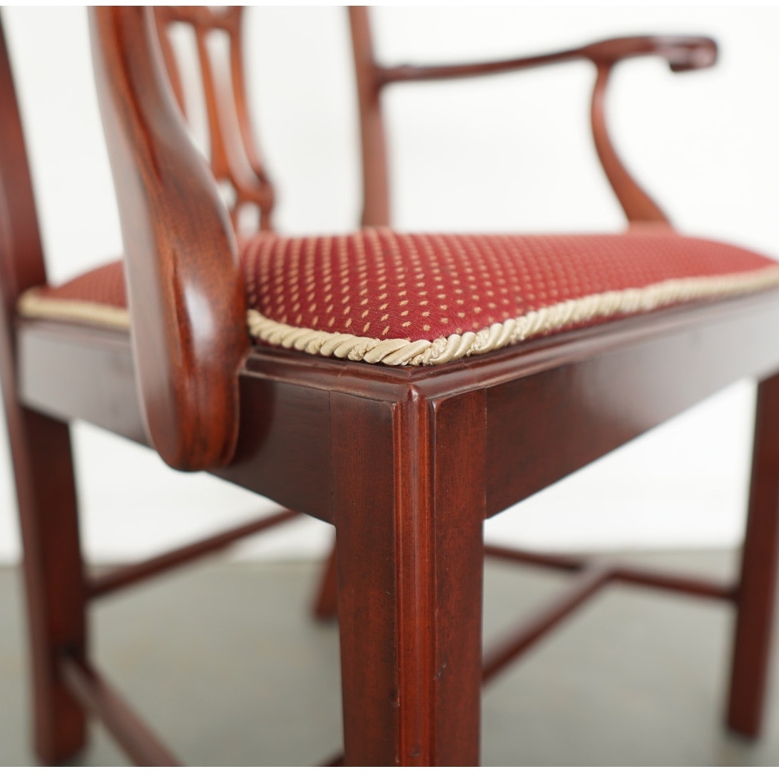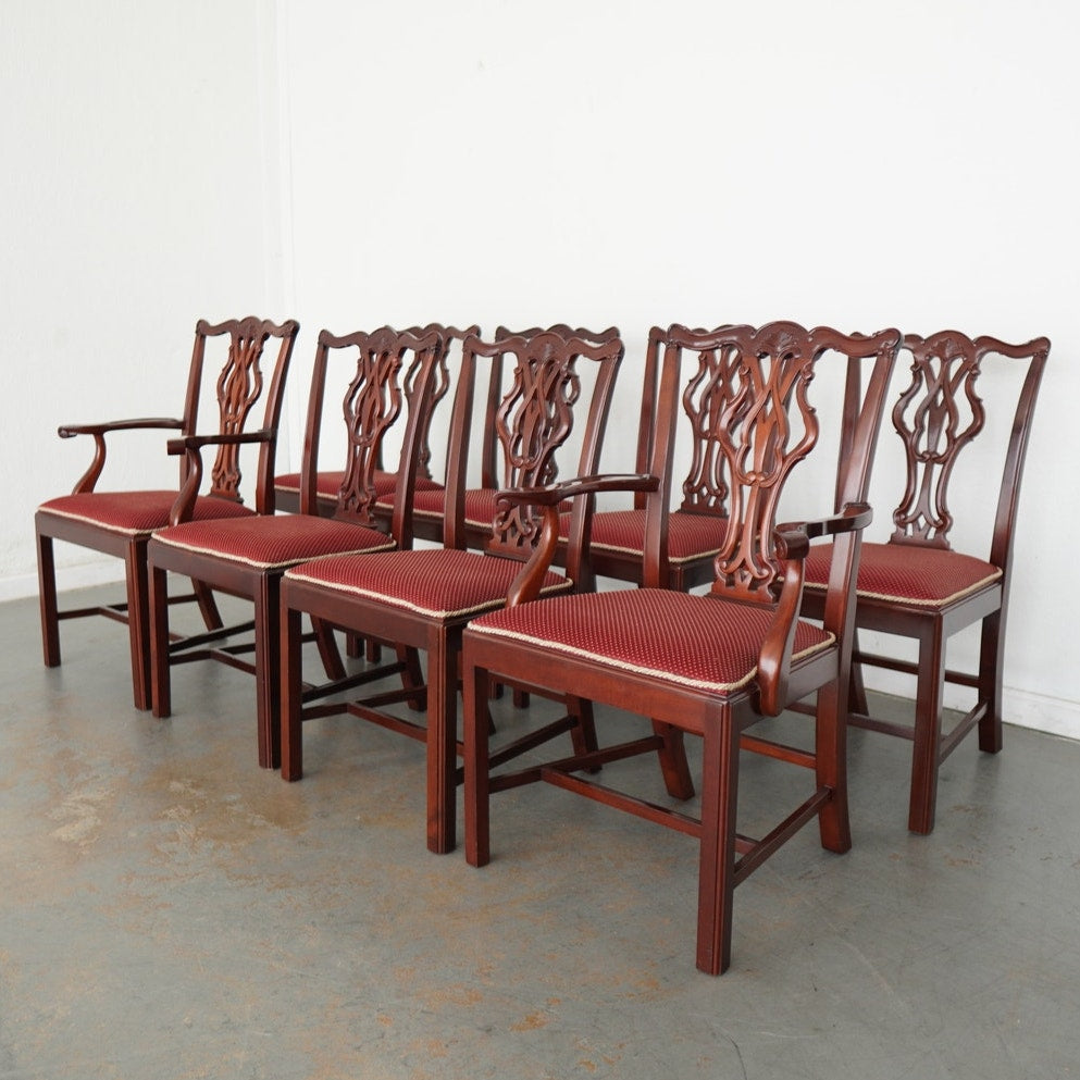 This vintage set of eight Chippendale-style dining chairs dates to the mid-20th century and includes six side chairs and two coordinating armchairs. Crafted in richly finished wood, the set is defined by elegantly pierced splat backs with classic ribbon and scroll motifs, gently shaped crest rails, and refined, straight legs connected by understated stretchers. The armchairs feature gracefully curved arms that echo the flowing lines of the backs, adding presence and balance to the set. Upholstered seats in a deep red patterned fabric with decorative trim provide a traditional contrast to the warm wood tones. Cohesive, formal, and timeless, this set offers a complete and visually striking seating arrangement.
