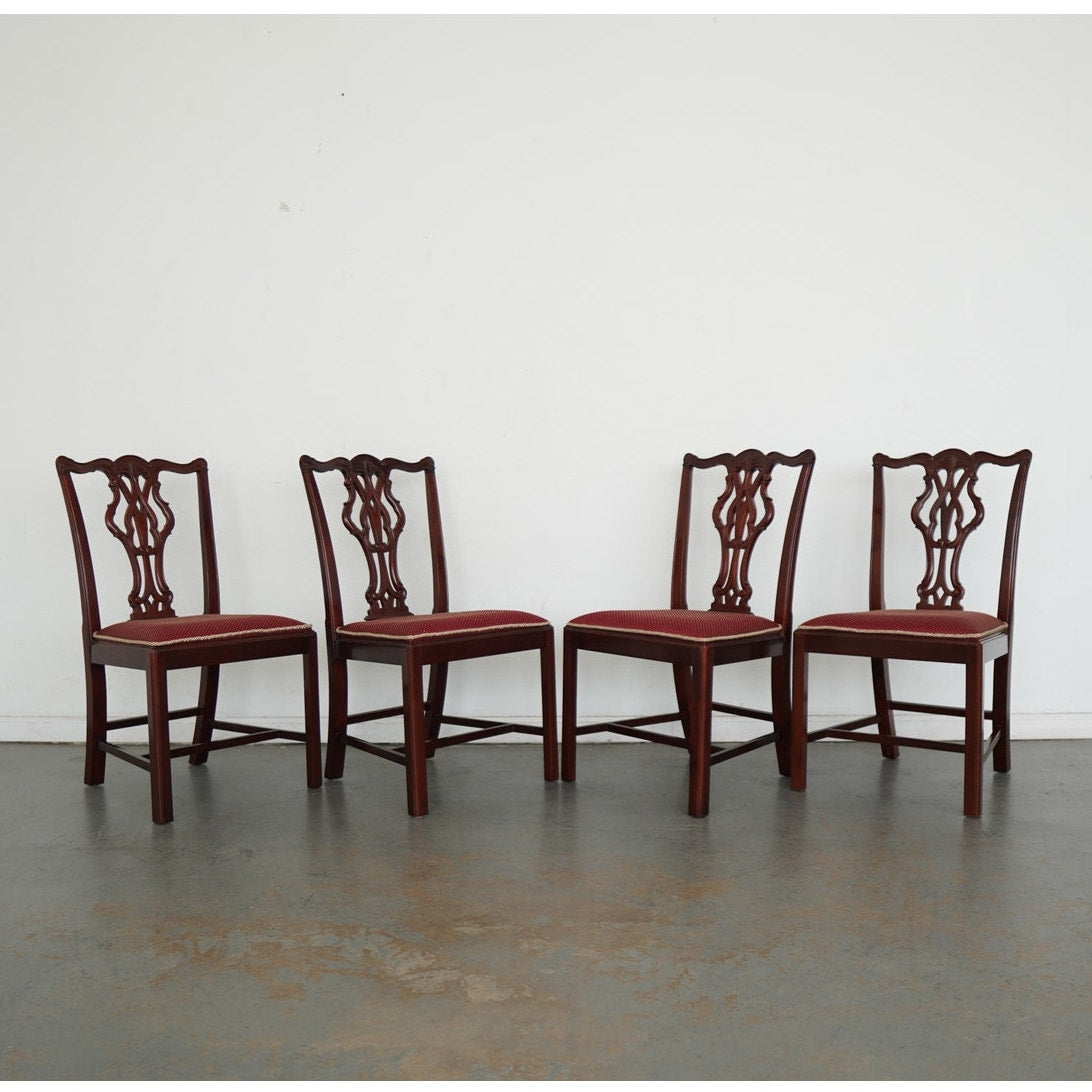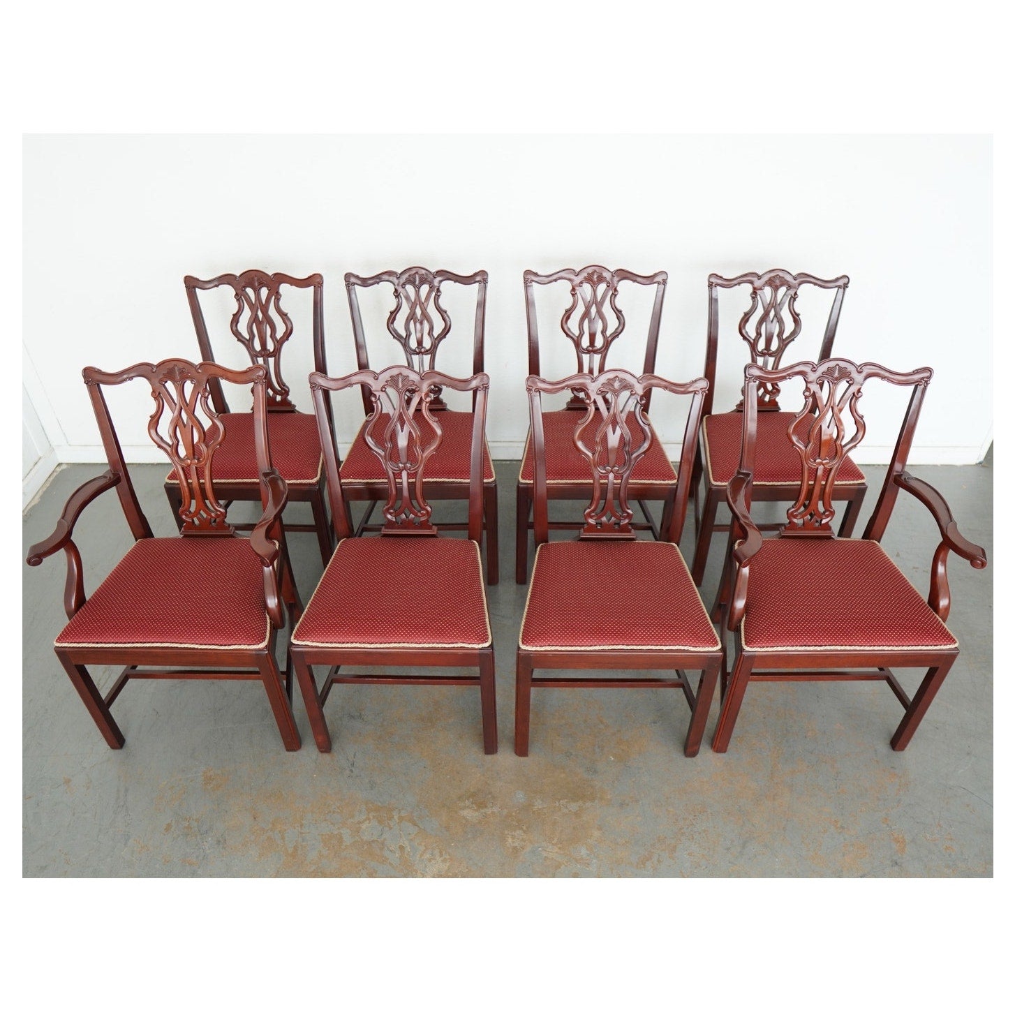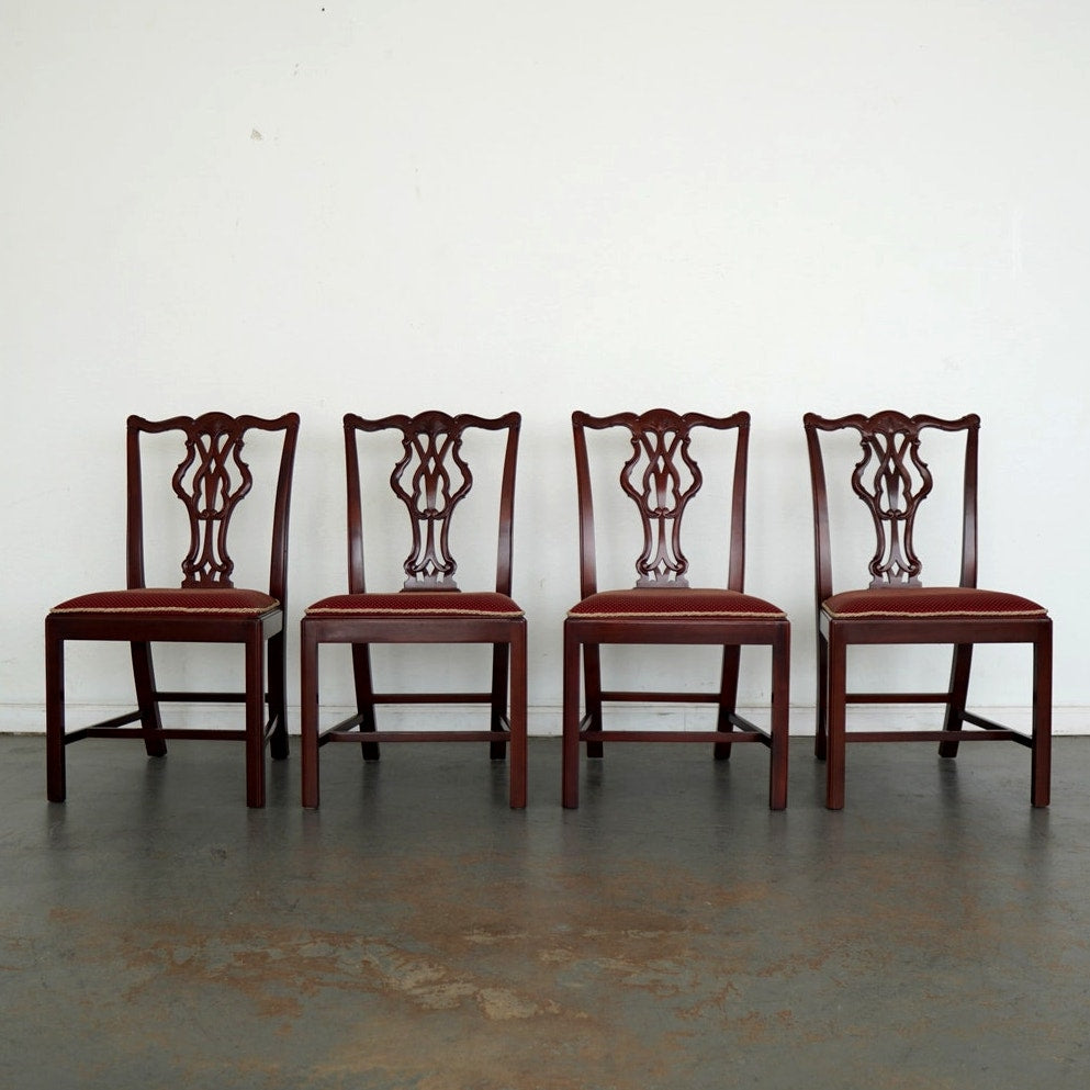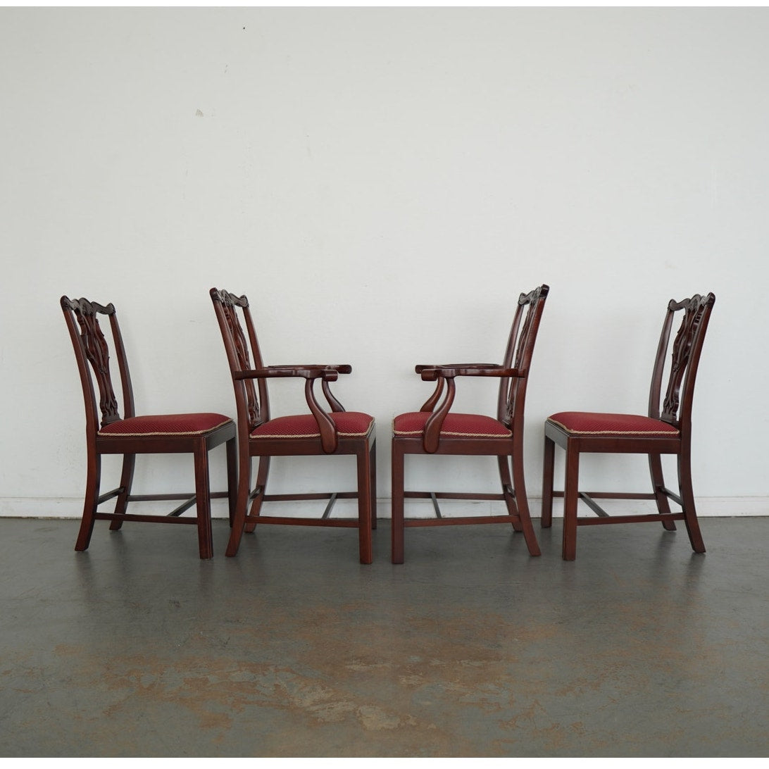 This vintage set of eight Chippendale-style dining chairs dates to the mid-20th century and includes six side chairs and two coordinating armchairs. Crafted in richly finished wood, the set is defined by elegantly pierced splat backs with classic ribbon and scroll motifs, gently shaped crest rails, and refined, straight legs connected by understated stretchers. The armchairs feature gracefully curved arms that echo the flowing lines of the backs, adding presence and balance to the set. Upholstered seats in a deep red patterned fabric with decorative trim provide a traditional contrast to the warm wood tones. Cohesive, formal, and timeless, this set offers a complete and visually striking seating arrangement.