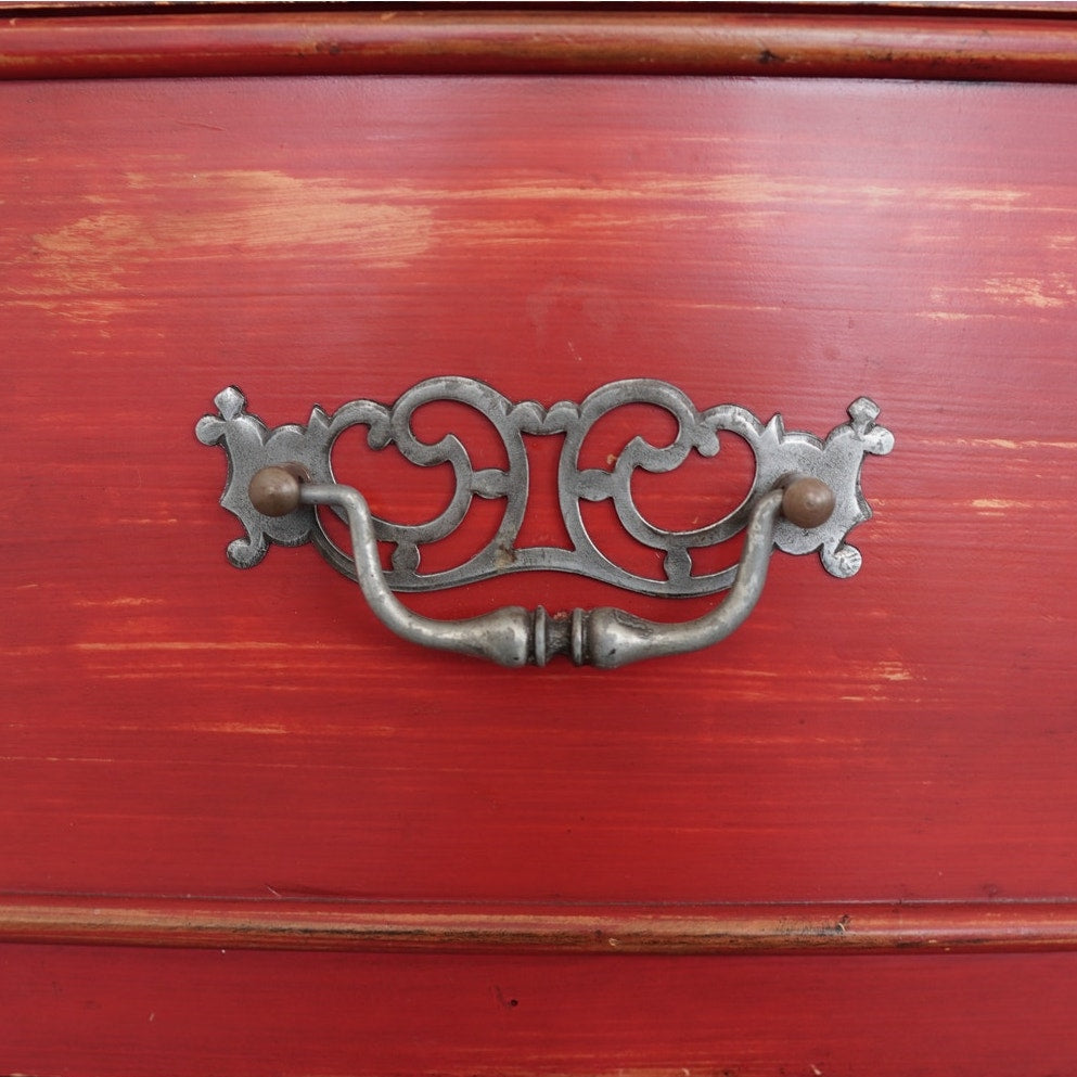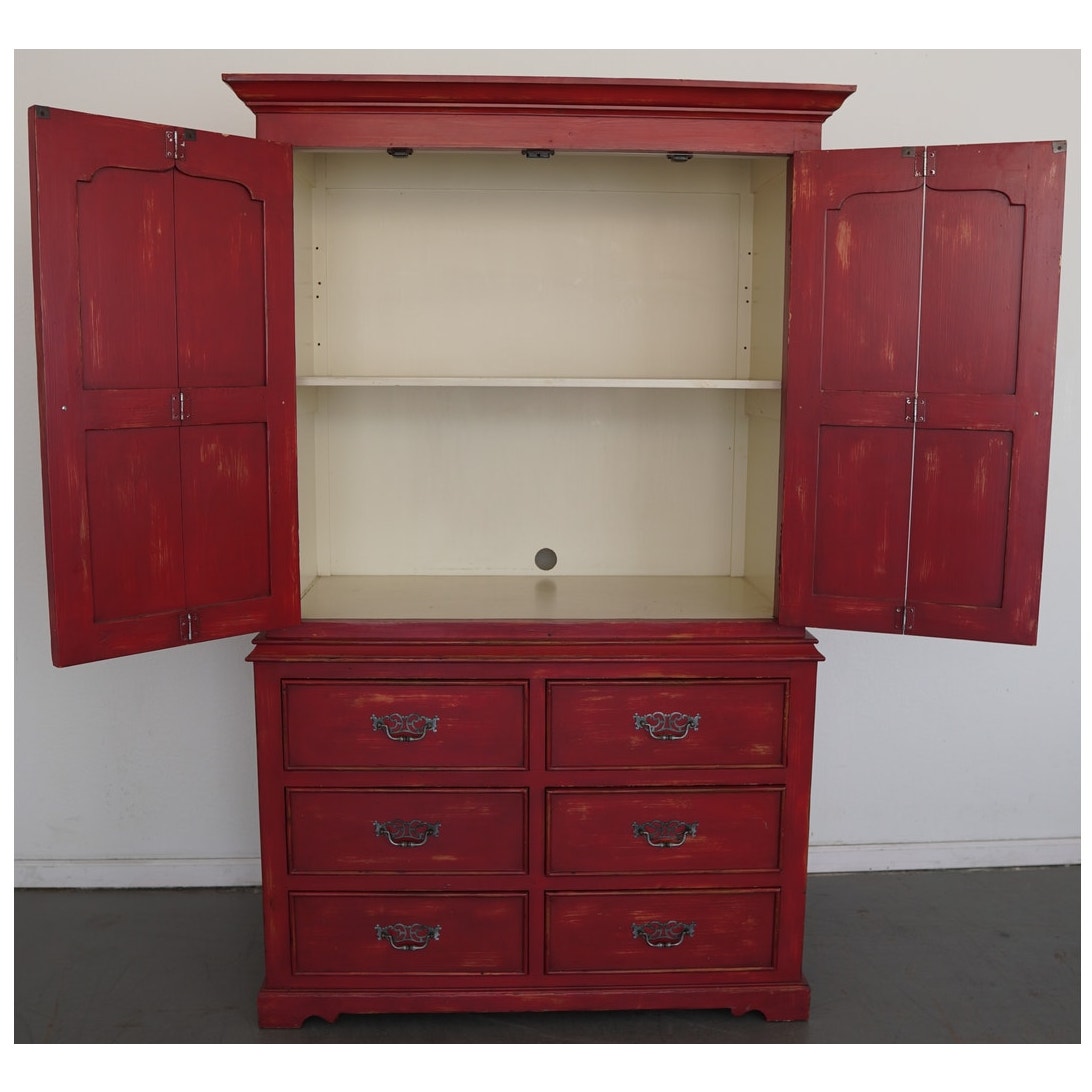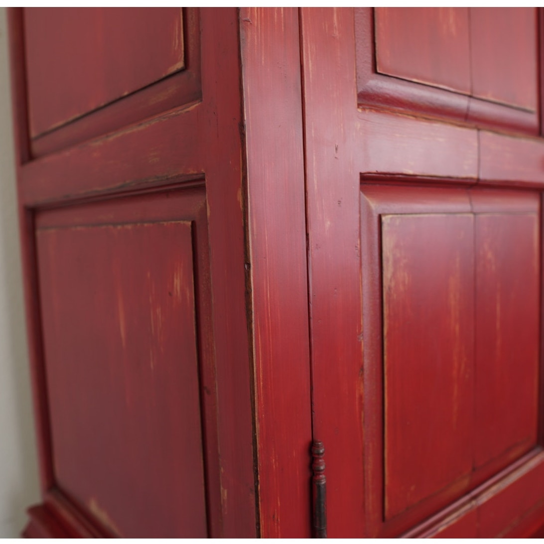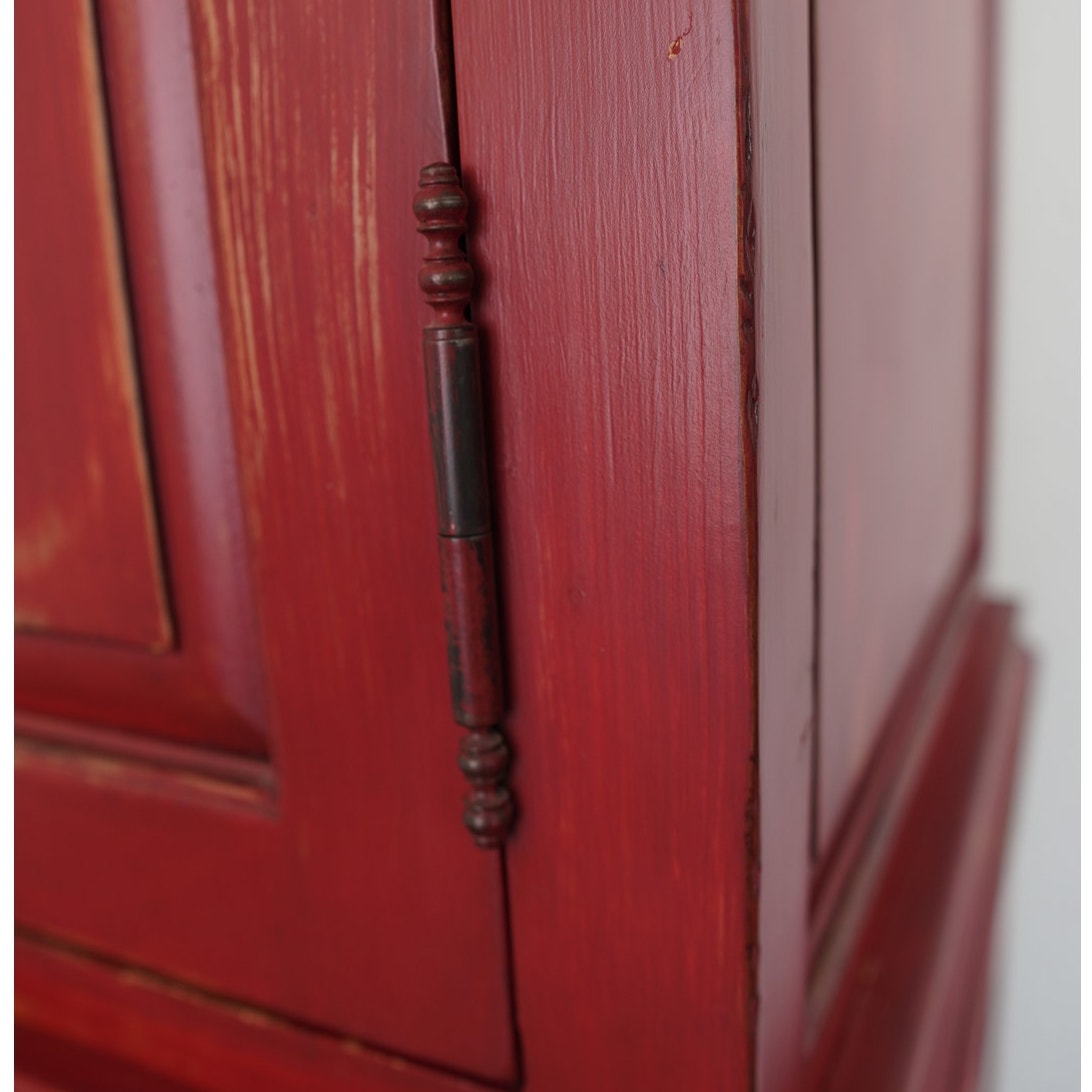 Striking Dutch Kas in a rich red finish with softly distressed detailing. The design features paneled bi-fold doors that open fully to reveal a shelf and interior storage space, ideal for media, linens, or wardrobe use. Six lower drawers with decorative metal pulls provide additional storage, while the crown molding and carved door panels add a refined traditional touch.