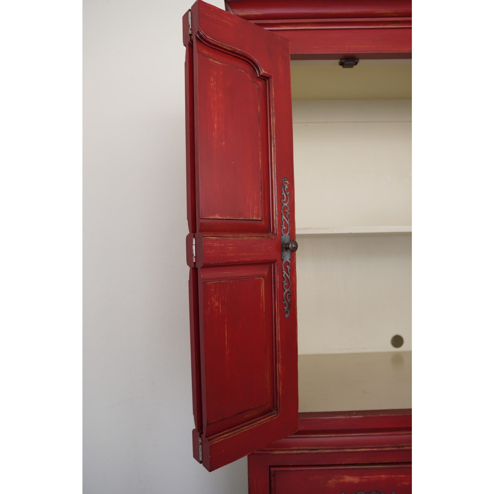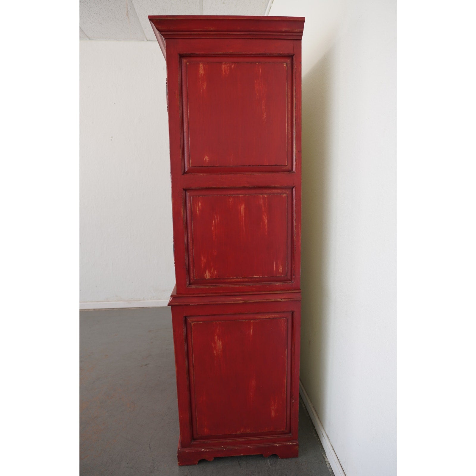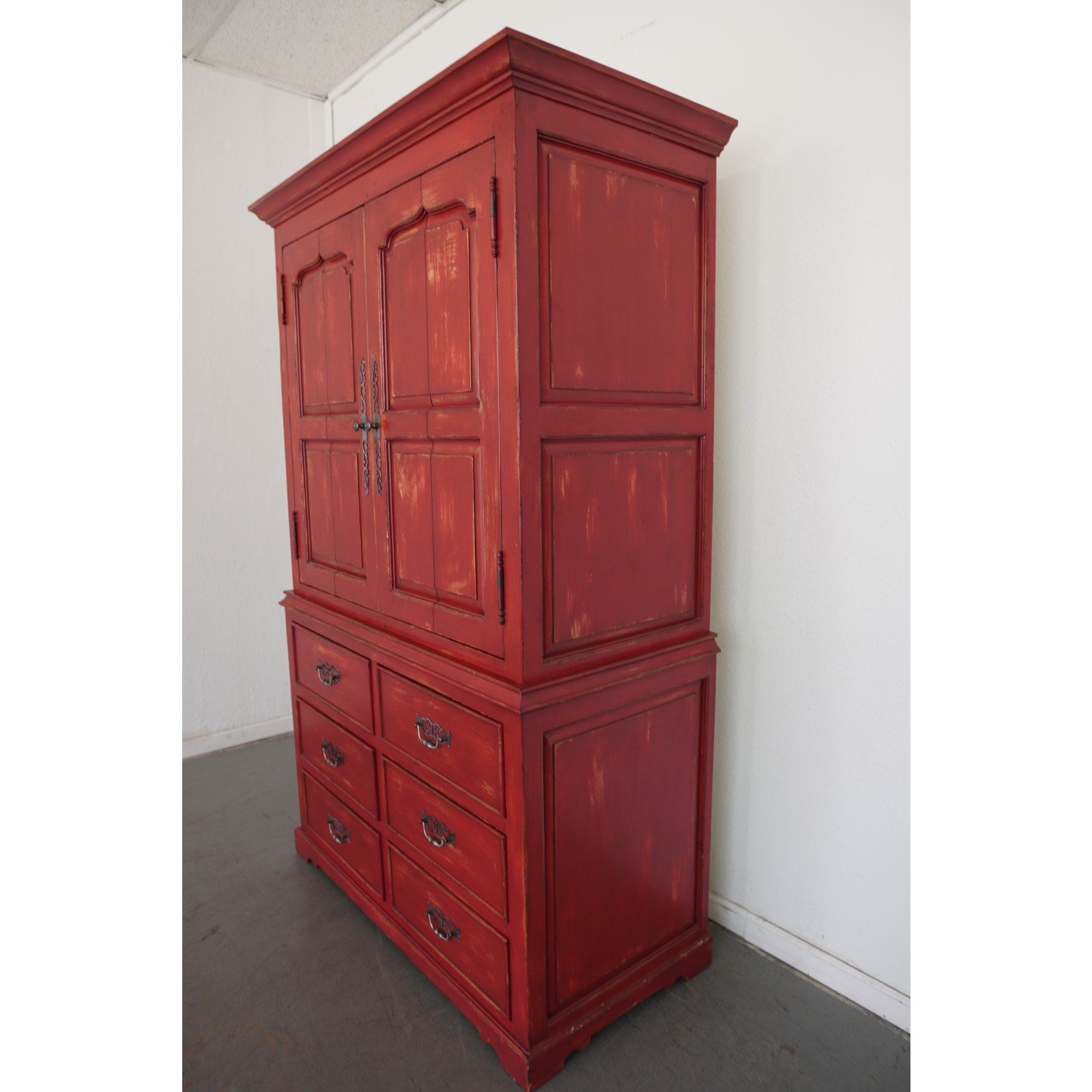 Striking Dutch Kas in a rich red finish with softly distressed detailing. The design features paneled bi-fold doors that open fully to reveal a shelf and interior storage space, ideal for media, linens, or wardrobe use. Six lower drawers with decorative metal pulls provide additional storage, while the crown molding and carved door panels add a refined traditional touch.