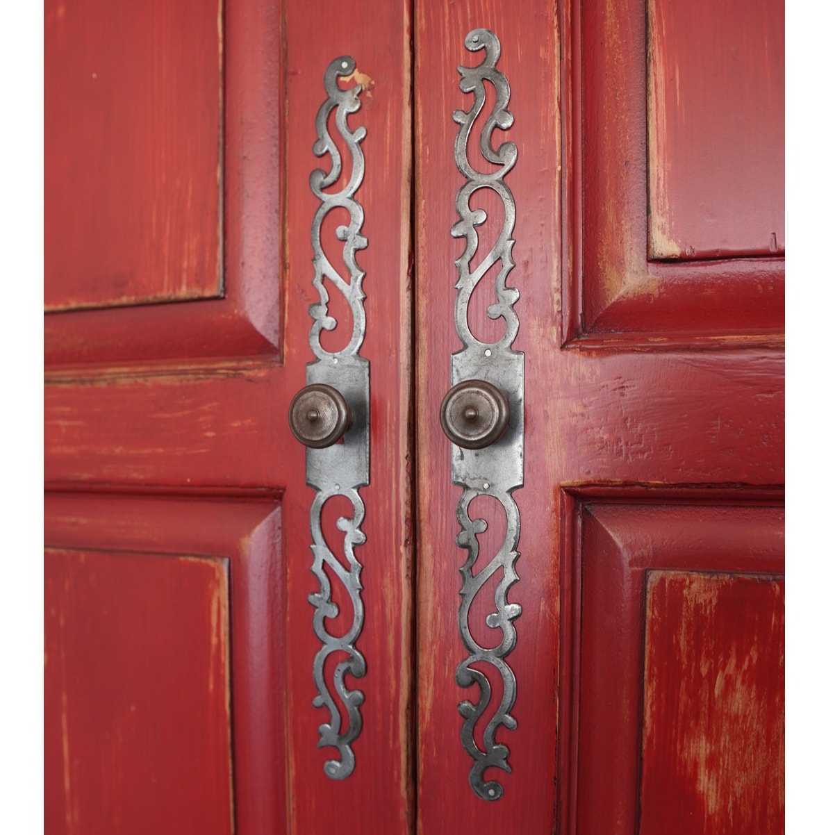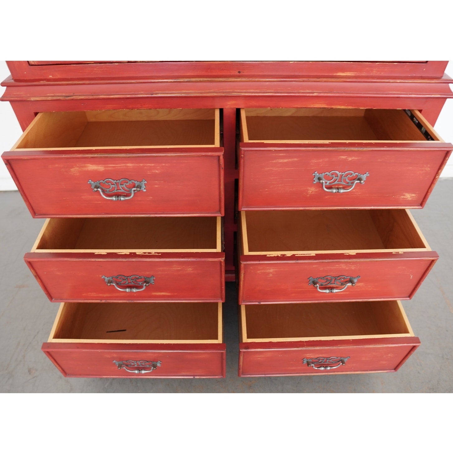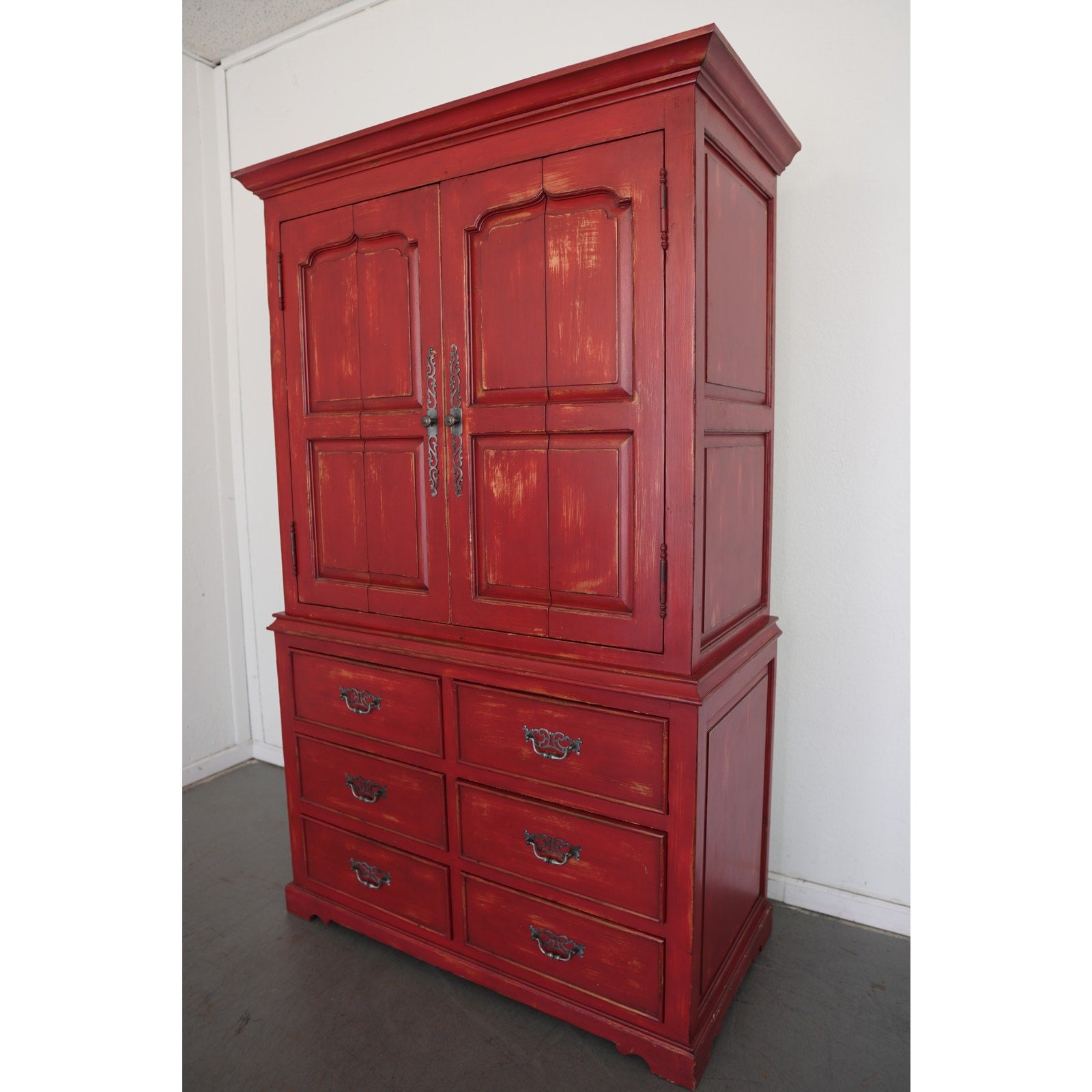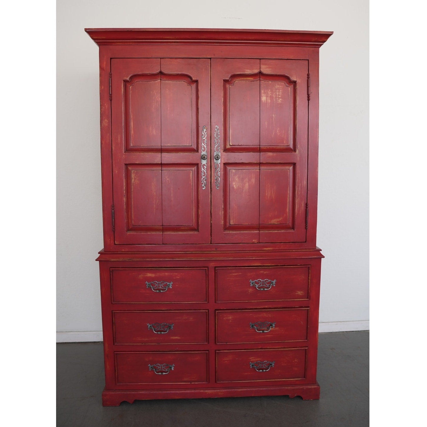 Striking Dutch Kas in a rich red finish with softly distressed detailing. The design features paneled bi-fold doors that open fully to reveal a shelf and interior storage space, ideal for media, linens, or wardrobe use. Six lower drawers with decorative metal pulls provide additional storage, while the crown molding and carved door panels add a refined traditional touch.