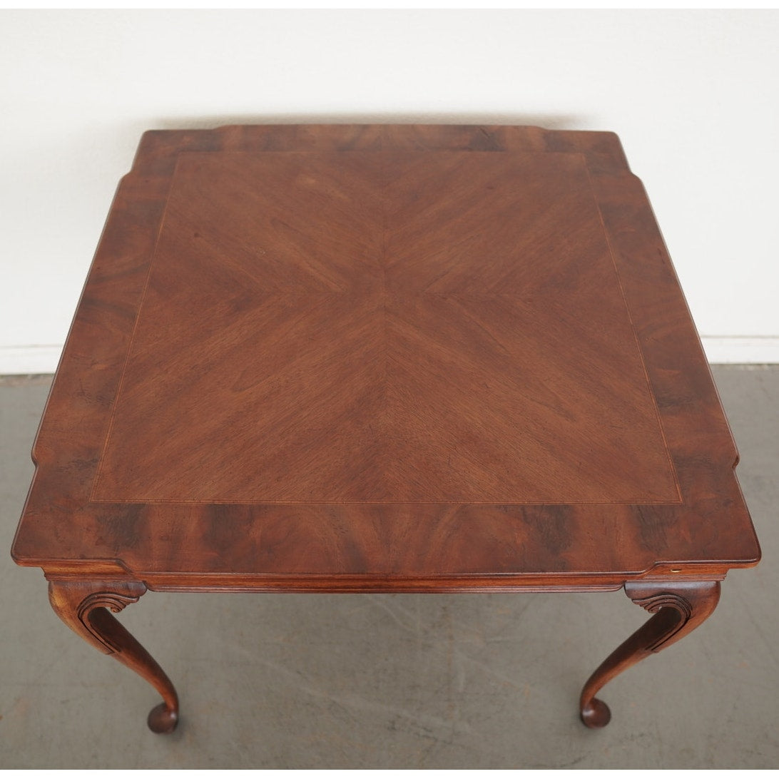 Elegant vintage mahogany game or card table featuring beautifully curved cabriole legs, carved knee details, and a rich, warm finish. The table’s top showcases a striking veneer pattern with subtle geometric borders, adding depth and craftsmanship to the design. Each corner includes a pull-out drink tray with an inset circular rest — a charming and functional detail typical of fine mid-century reproductions of 18th-century Queen Anne and Chippendale styles.