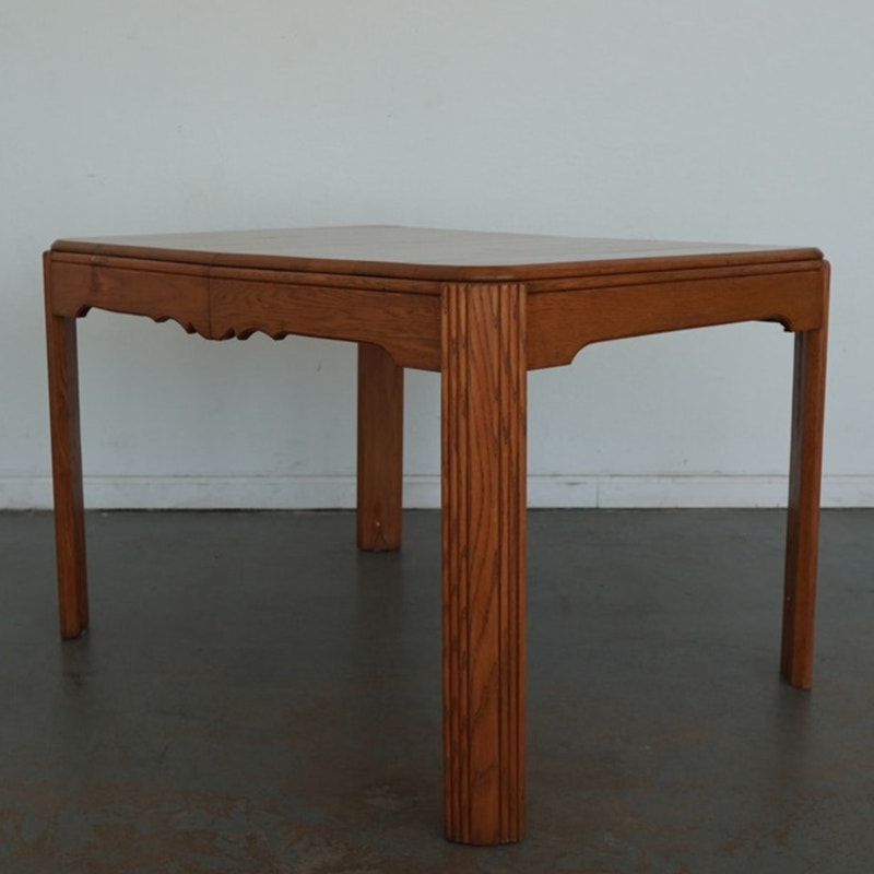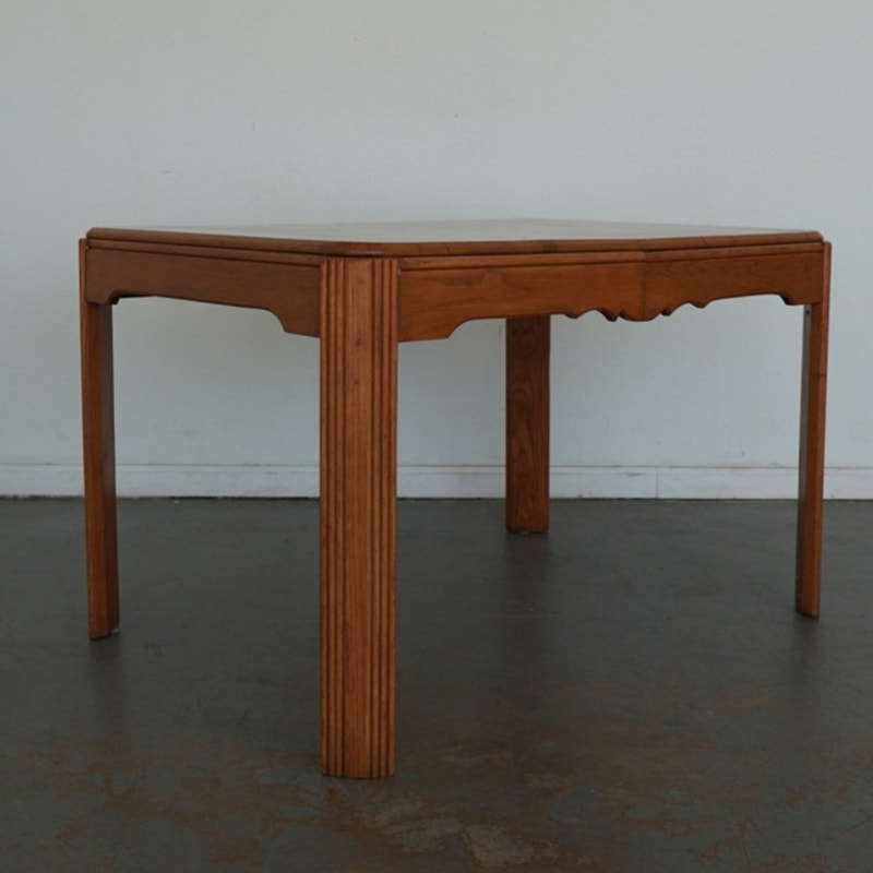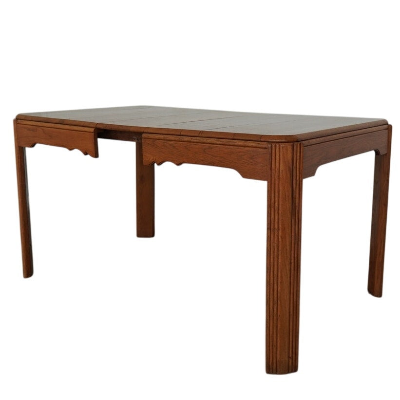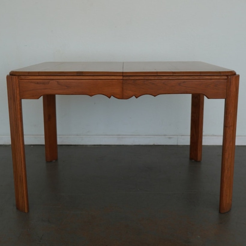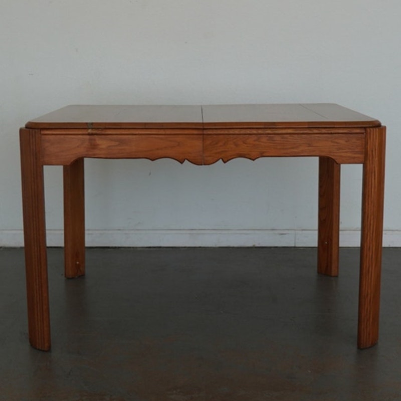 This vintage mid-century American dining table dates to the mid-20th century and reflects a refined blend of traditional and transitional design. Crafted in solid wood with a warm, honey-toned finish, the table features softly rounded corners, tapered legs, and a subtly scalloped apron that adds understated character without overwhelming the clean silhouette. The top is composed of beautifully grained planks and includes a single extension leaf, allowing the table to expand for additional seating while maintaining a balanced, cohesive look when closed. Thoughtfully proportioned and versatile in style, this piece bridges classic American craftsmanship with the streamlined sensibility of mid-century design, making it an easy fit in both traditional and collected interiors.