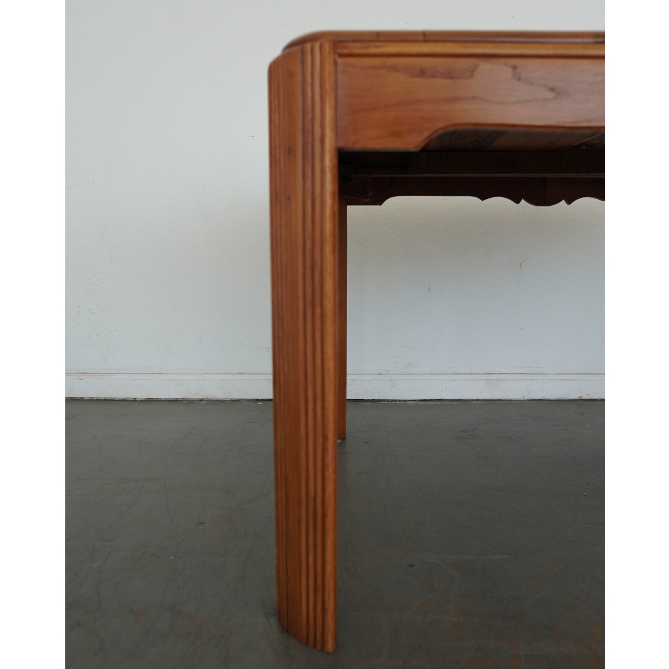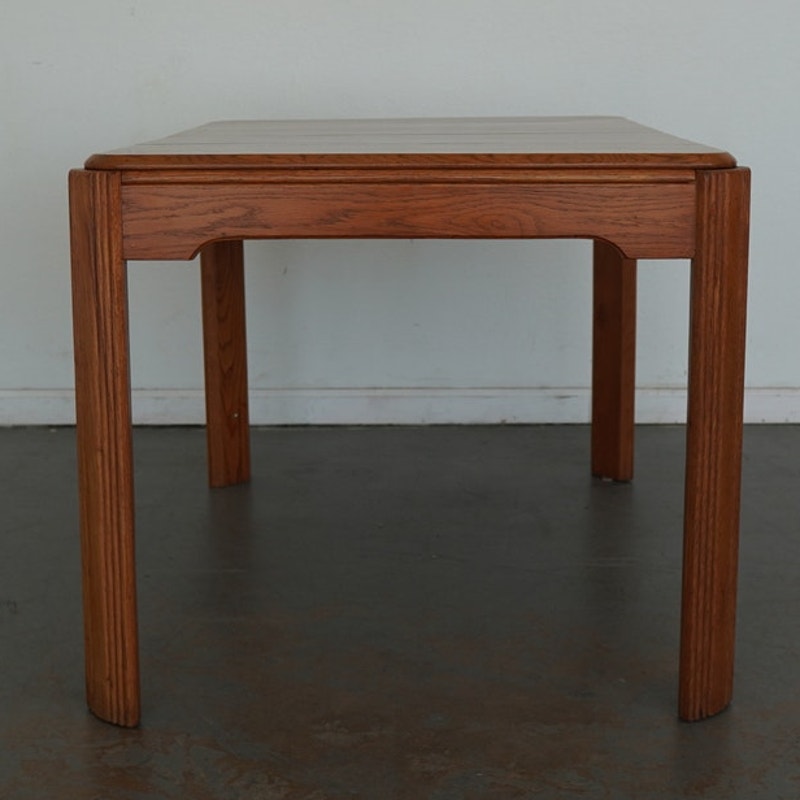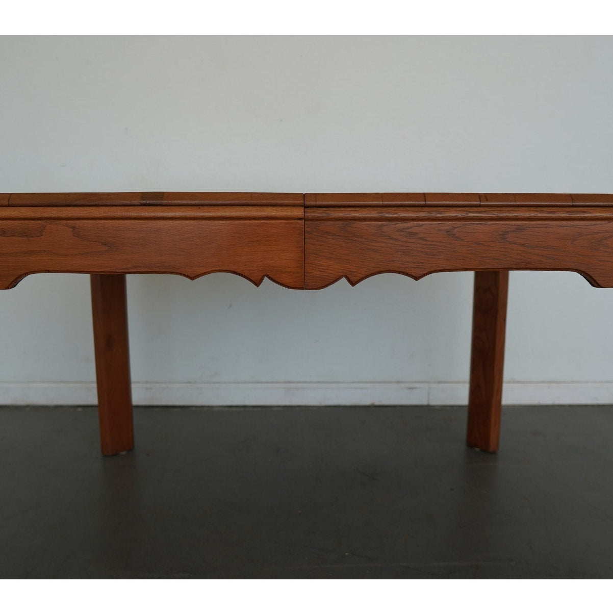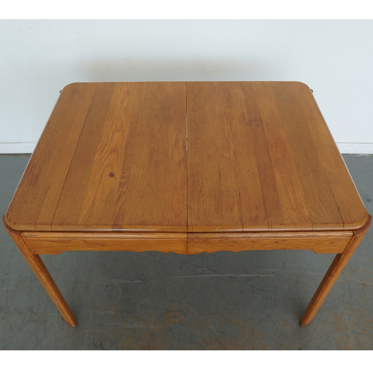 This vintage mid-century American dining table dates to the mid-20th century and reflects a refined blend of traditional and transitional design. Crafted in solid wood with a warm, honey-toned finish, the table features softly rounded corners, tapered legs, and a subtly scalloped apron that adds understated character without overwhelming the clean silhouette. The top is composed of beautifully grained planks and includes a single extension leaf, allowing the table to expand for additional seating while maintaining a balanced, cohesive look when closed. Thoughtfully proportioned and versatile in style, this piece bridges classic American craftsmanship with the streamlined sensibility of mid-century design, making it an easy fit in both traditional and collected interiors.