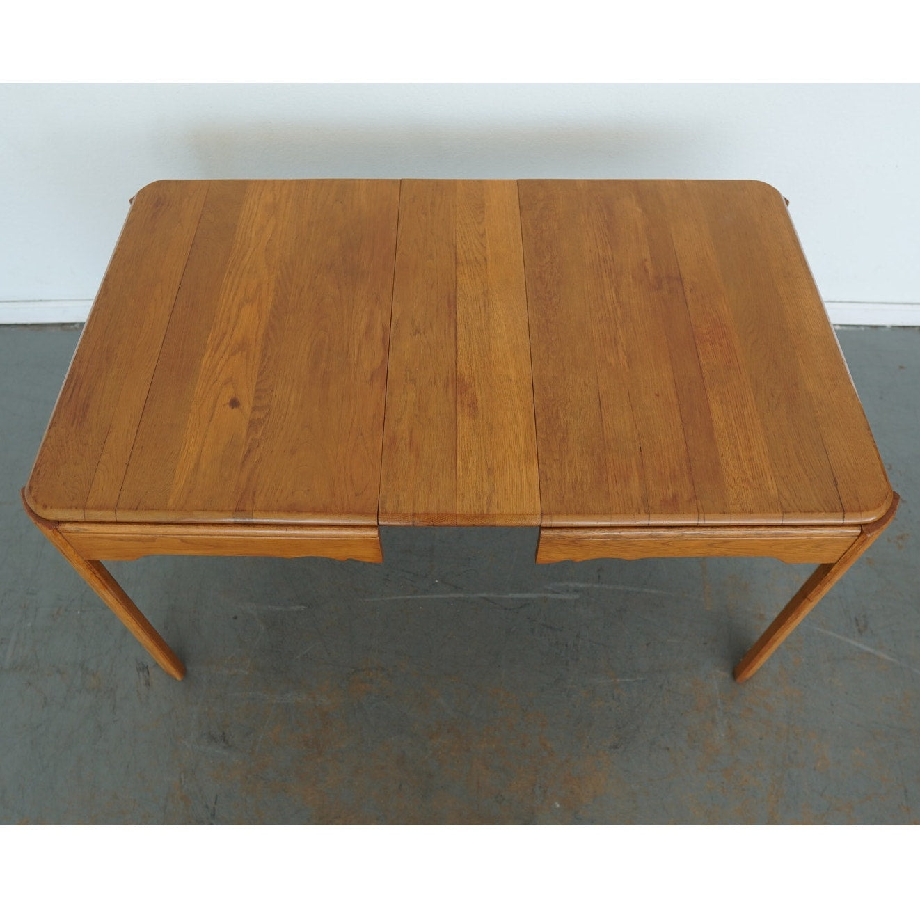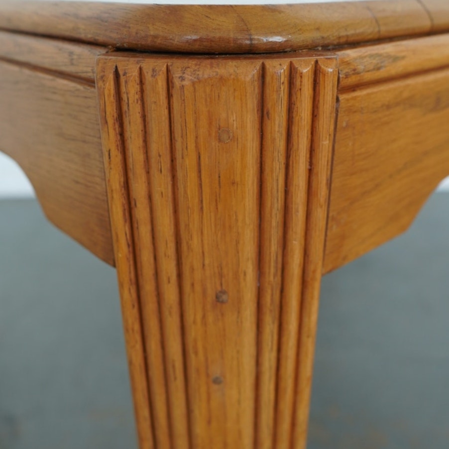 Condition: One leg shows three added pegs for extra stability, and some excess glue is visible from the repair work. There is also a noticeable area of finish loss/patching along the apron/top edge (as shown). Overall, the table remains stable, sturdy, and fully functional.