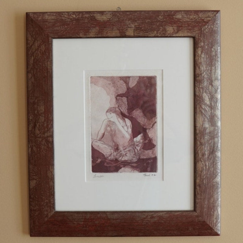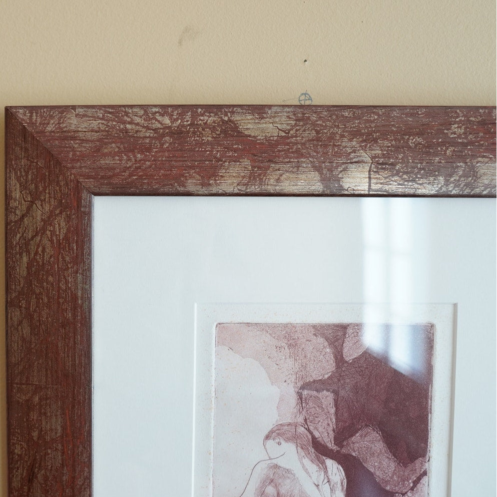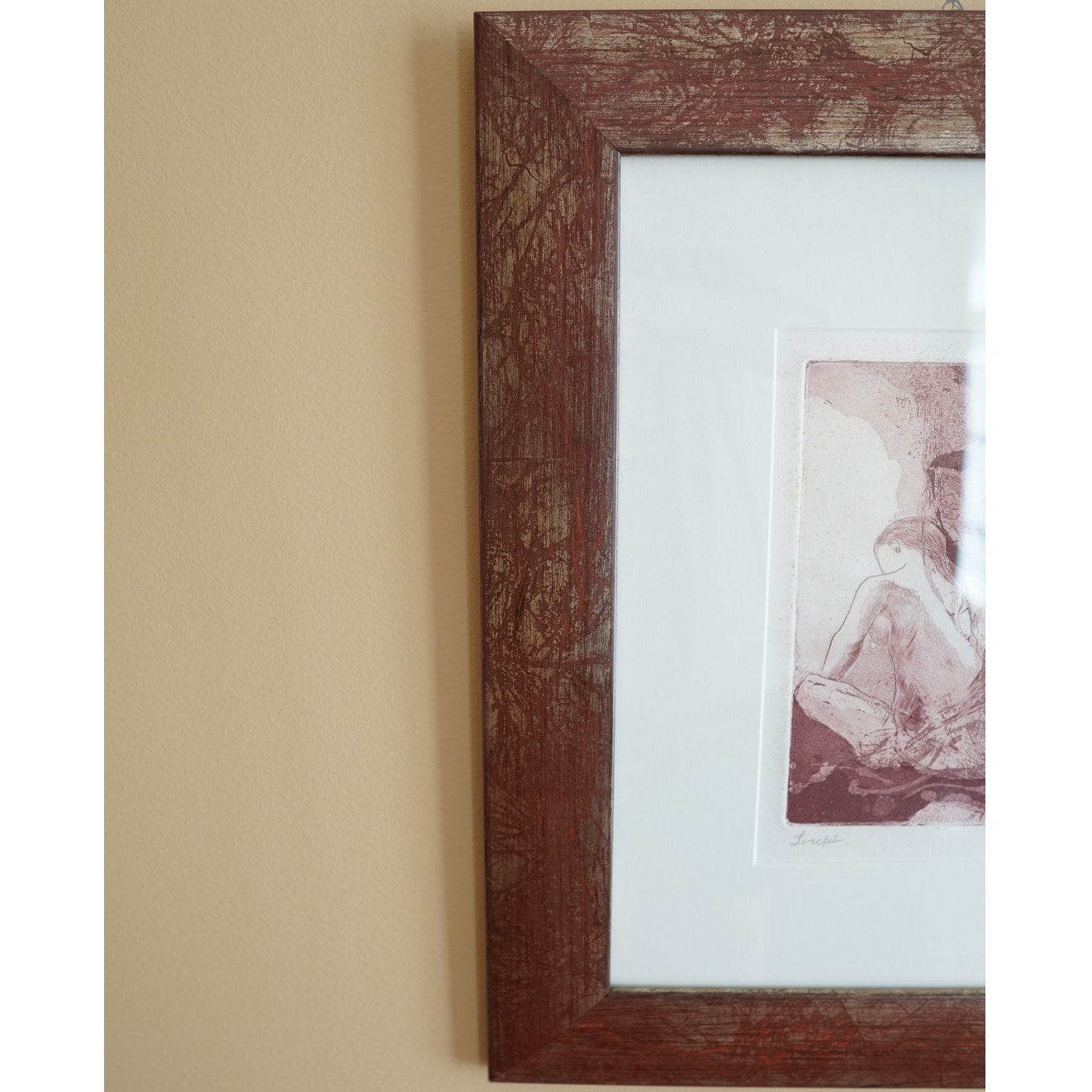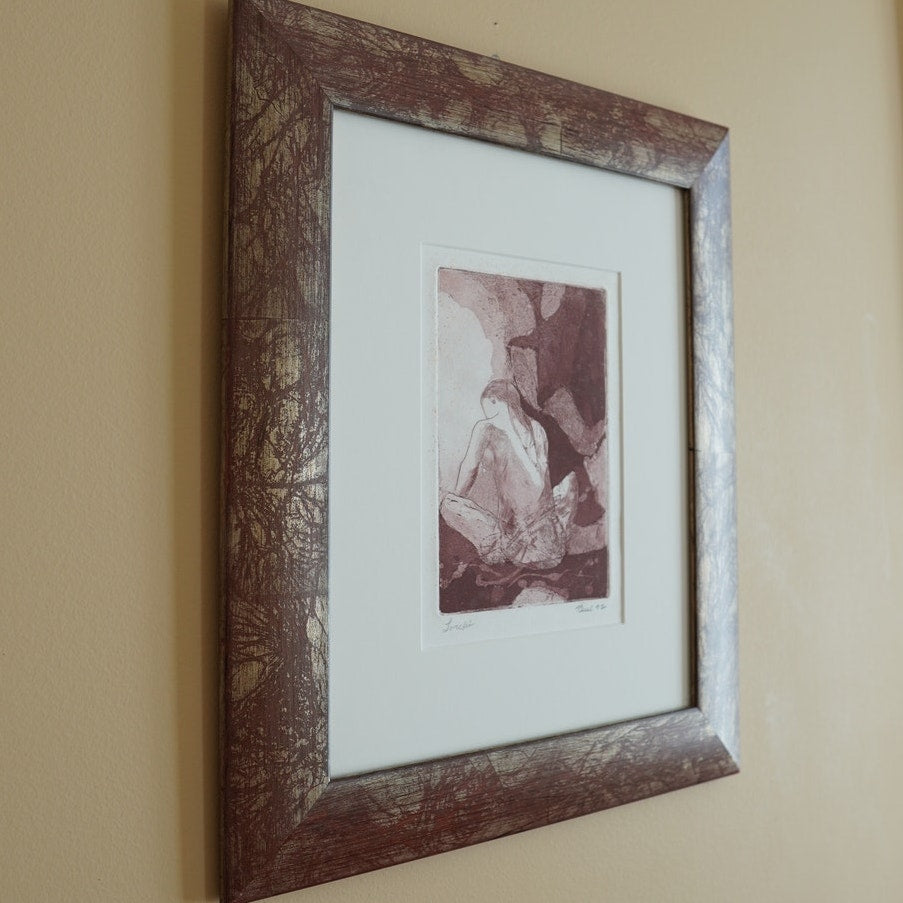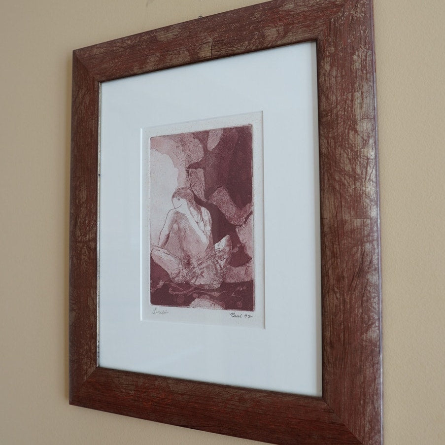 Original signed figurative etching dated 1992, featuring a contemplative seated figure rendered in warm sepia and burgundy tones. The composition blends delicate line work with expressive, abstract background elements, creating a moody and introspective piece with strong emotional presence. The artwork is hand-signed along the lower margin and professionally matted and framed in a substantial rustic wood frame with a white mat, giving it a refined yet organic presentation. The neutral palette and timeless subject make this piece easy to integrate into a variety of interiors, from traditional to modern or eclectic spaces.