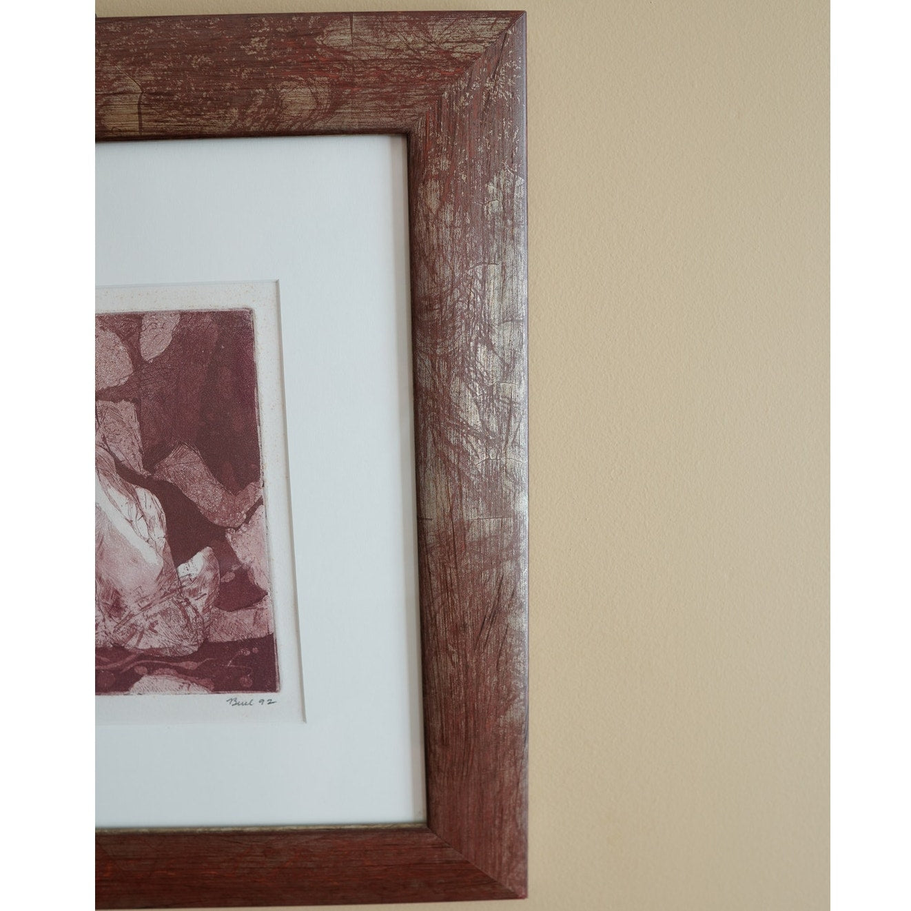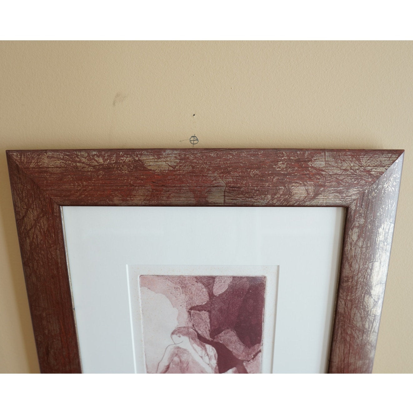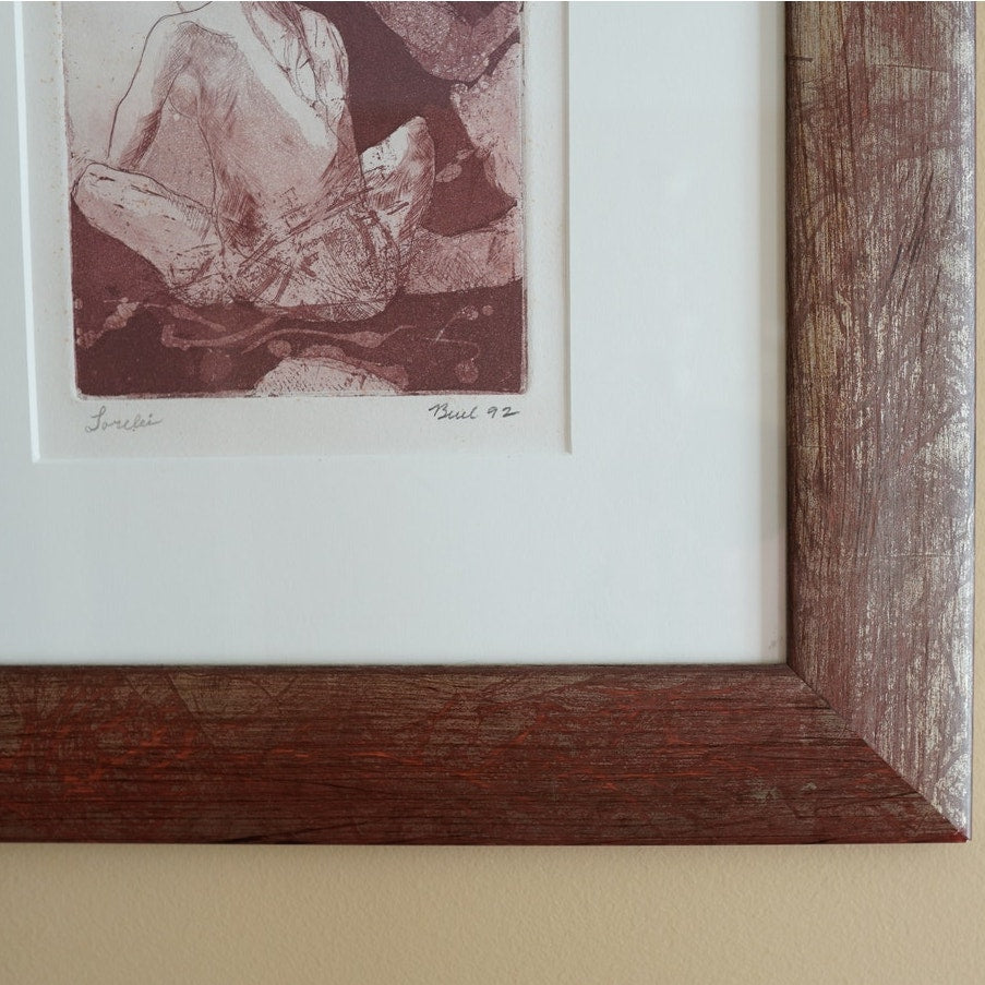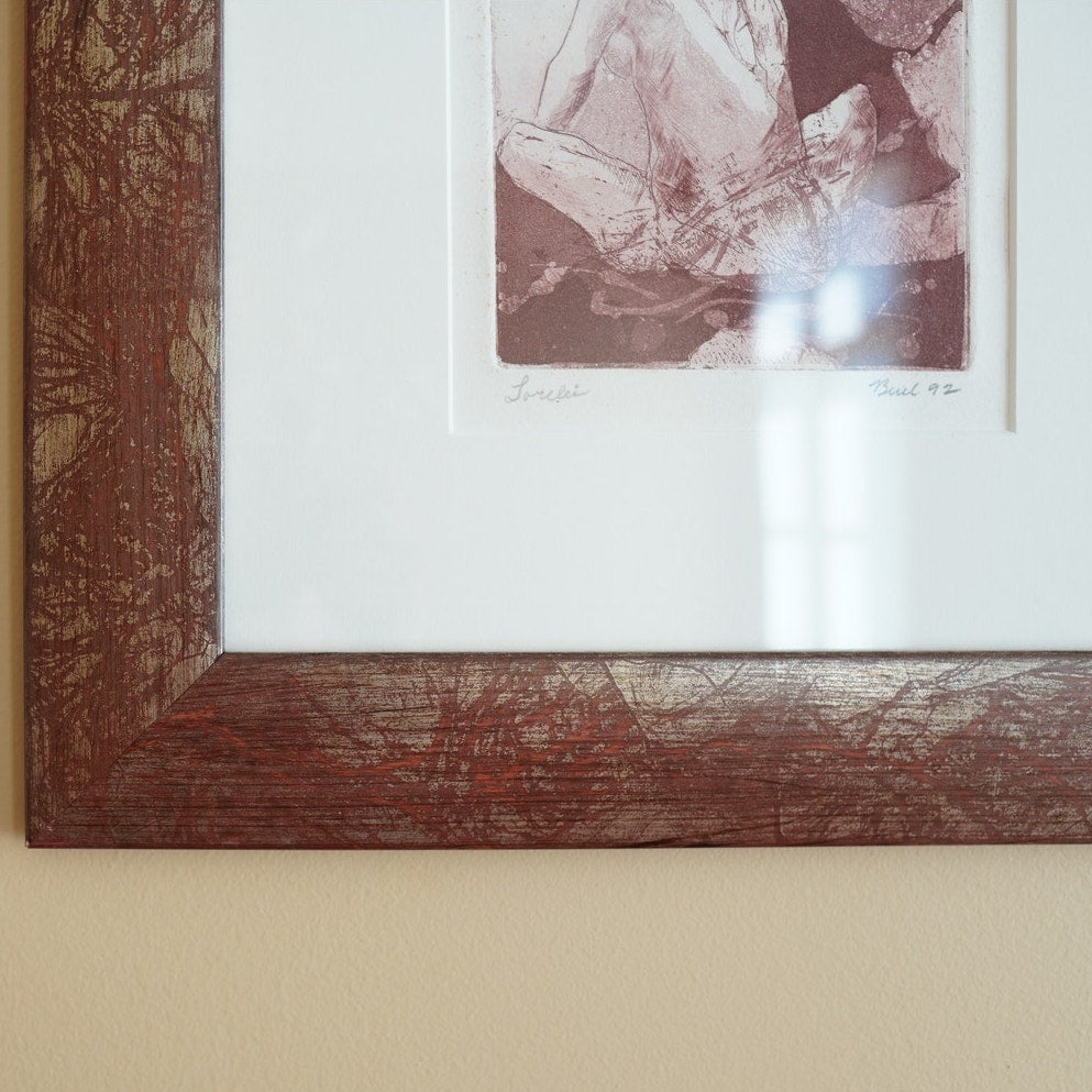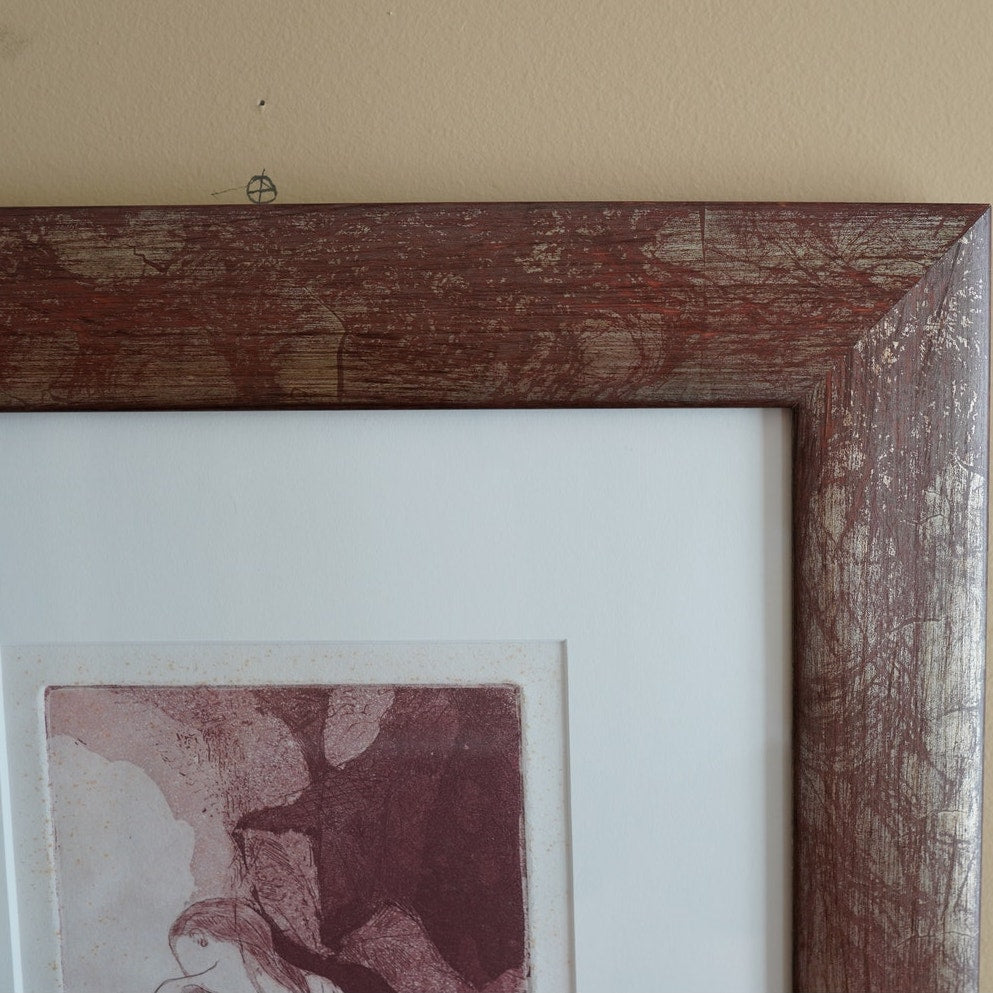 Original signed figurative etching dated 1992, featuring a contemplative seated figure rendered in warm sepia and burgundy tones. The composition blends delicate line work with expressive, abstract background elements, creating a moody and introspective piece with strong emotional presence. The artwork is hand-signed along the lower margin and professionally matted and framed in a substantial rustic wood frame with a white mat, giving it a refined yet organic presentation. The neutral palette and timeless subject make this piece easy to integrate into a variety of interiors, from traditional to modern or eclectic spaces.