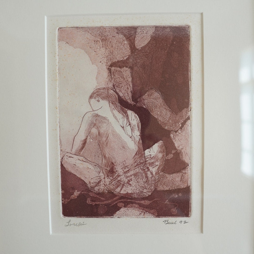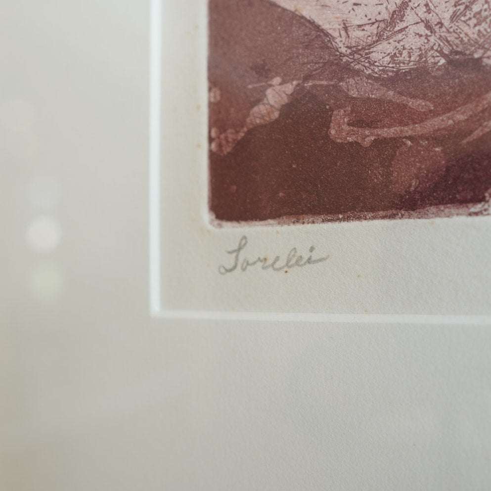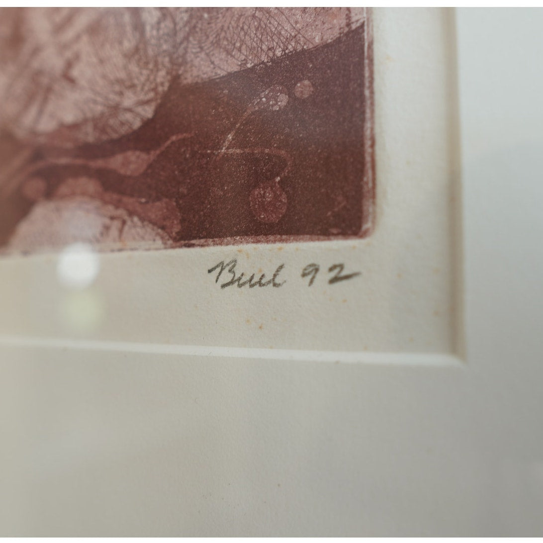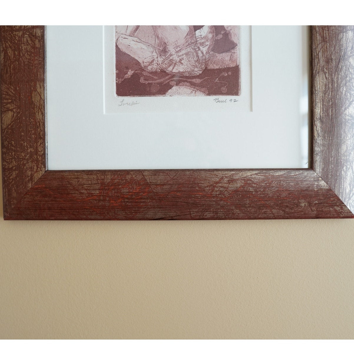 Original signed figurative etching dated 1992, featuring a contemplative seated figure rendered in warm sepia and burgundy tones. The composition blends delicate line work with expressive, abstract background elements, creating a moody and introspective piece with strong emotional presence. The artwork is hand-signed along the lower margin and professionally matted and framed in a substantial rustic wood frame with a white mat, giving it a refined yet organic presentation. The neutral palette and timeless subject make this piece easy to integrate into a variety of interiors, from traditional to modern or eclectic spaces.