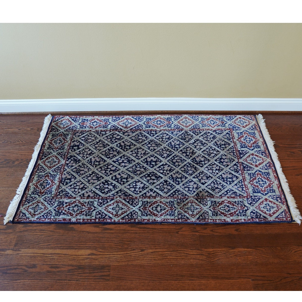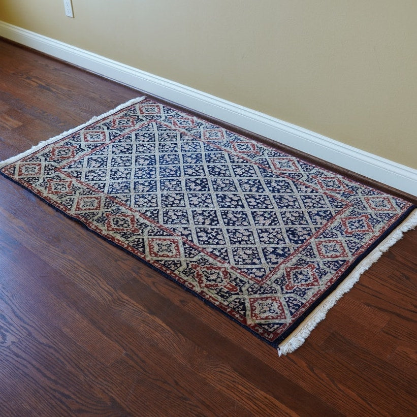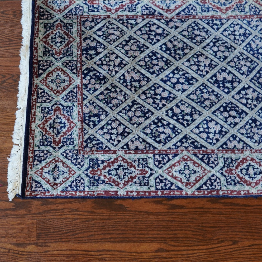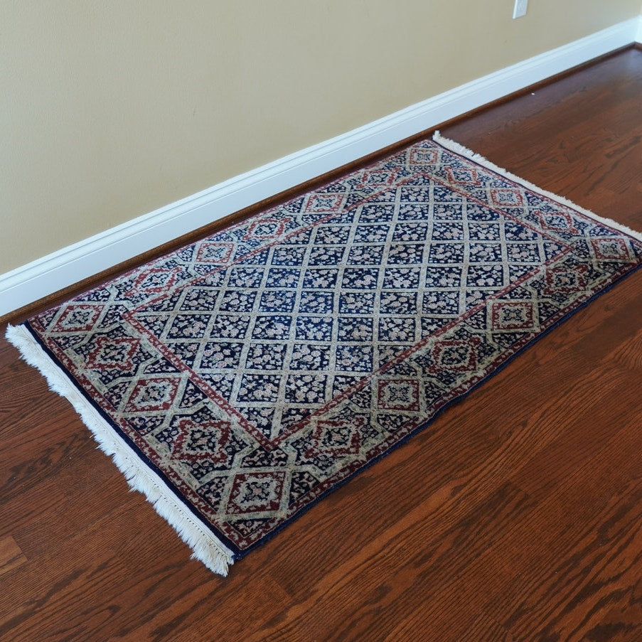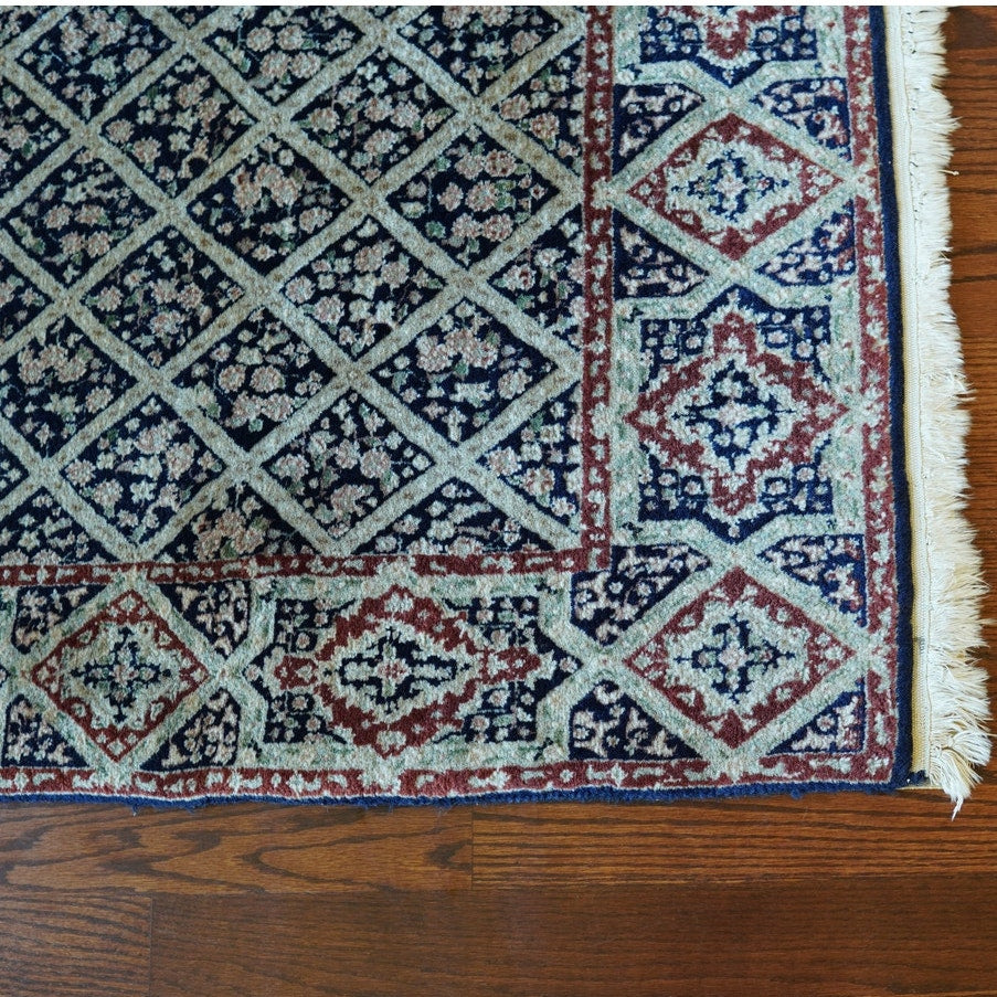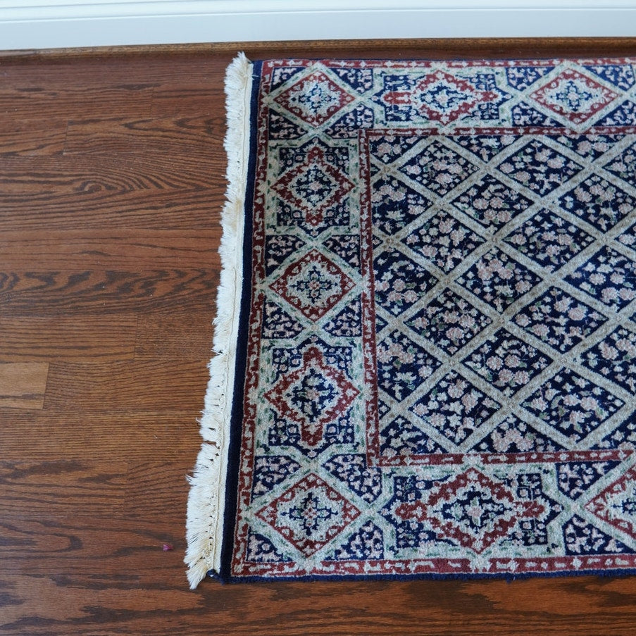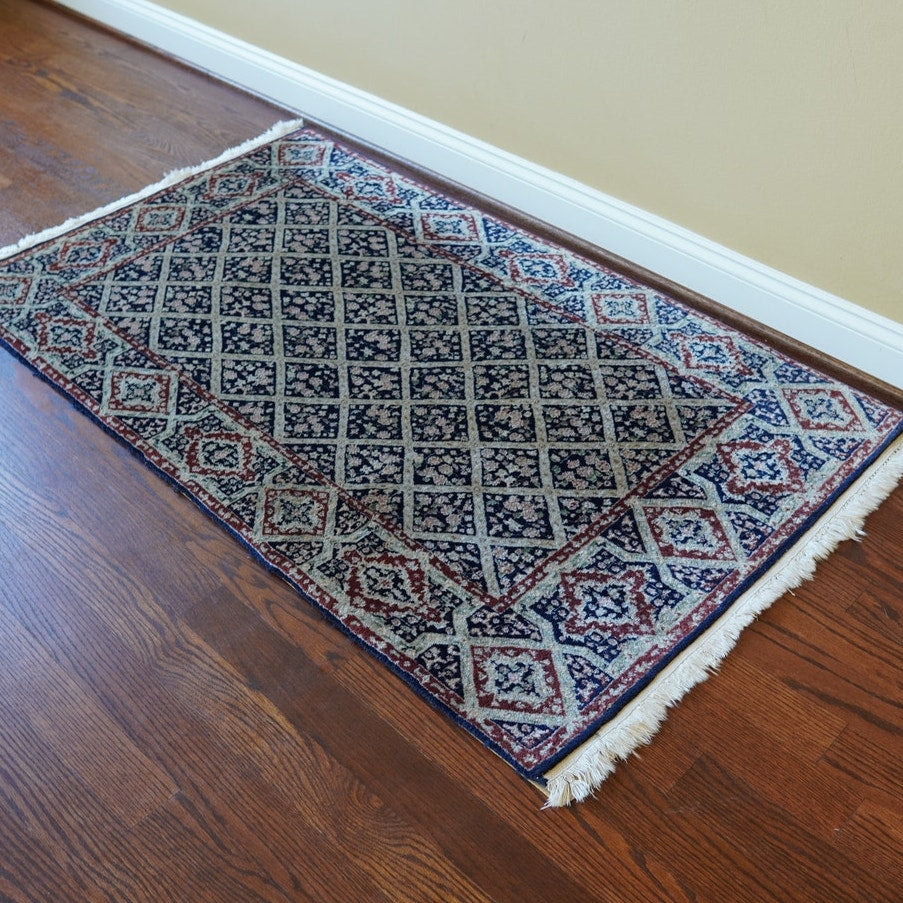 This vintage wool area rug features a classic geometric field anchored by a diamond lattice pattern, framed with a richly detailed border in deep navy, ivory, muted red, and soft sage tones. The balanced scale and traditional motif give it a timeless, Old World feel that works beautifully in entryways, hallways, kitchens, or layered in larger rooms. Woven with a dense wool pile and finished with short fringe at each end, it has that unmistakable warmth and character you only get from traditional rug-making. Made in India, likely dating to the early 1990s based on the original manufacturer tag.