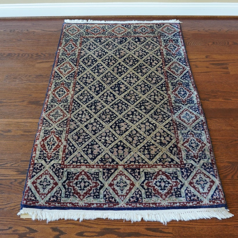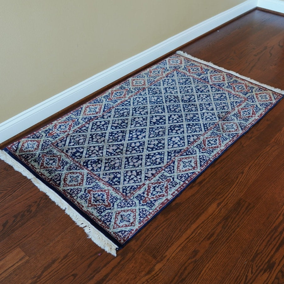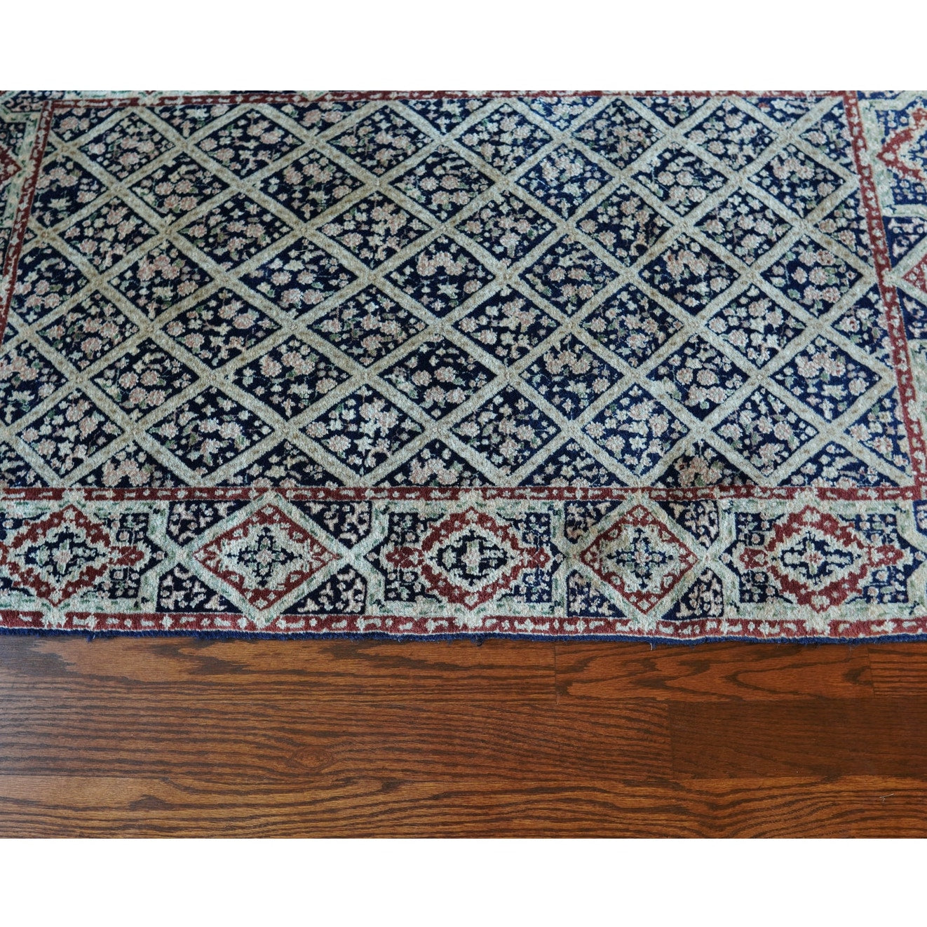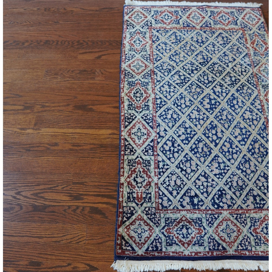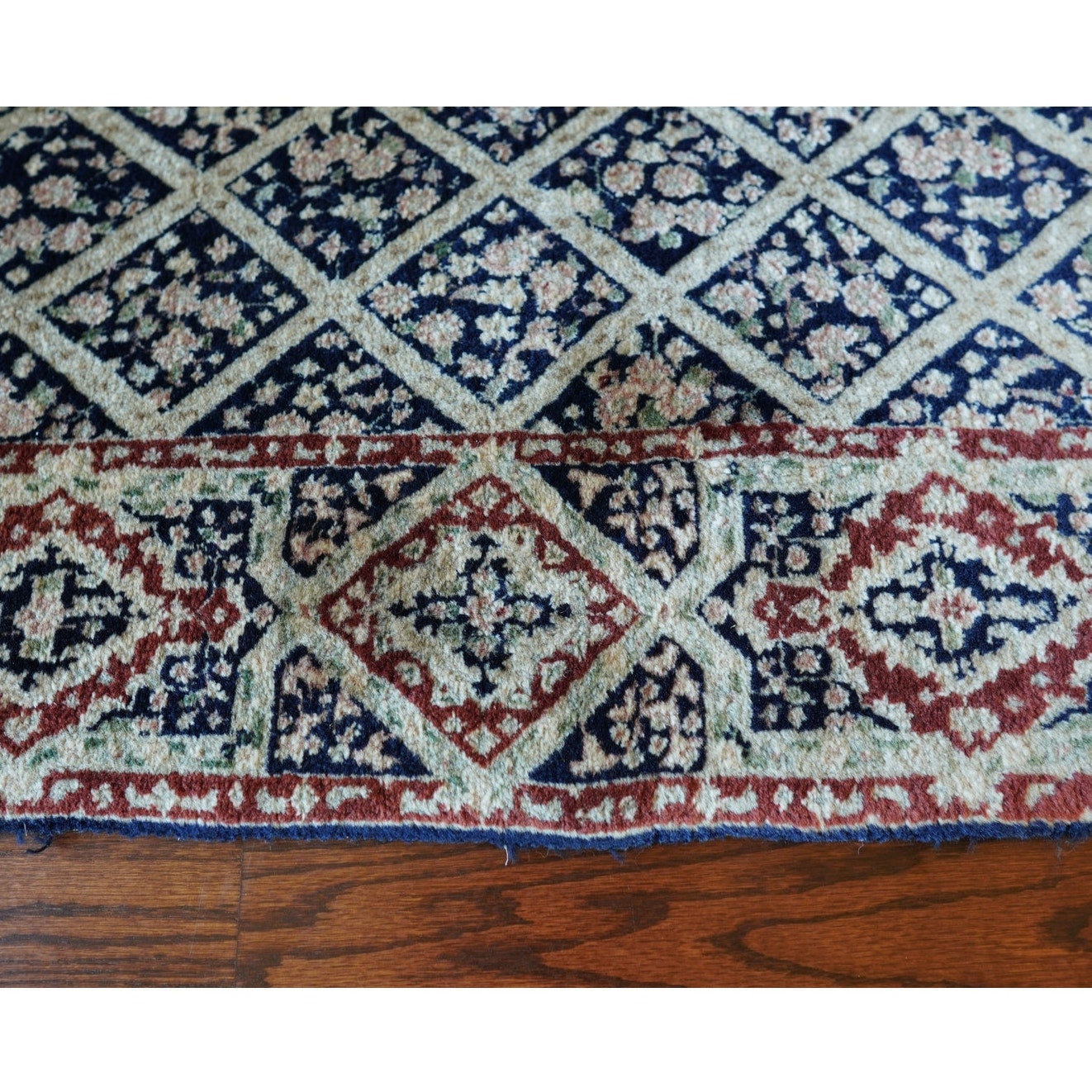 This vintage wool area rug features a classic geometric field anchored by a diamond lattice pattern, framed with a richly detailed border in deep navy, ivory, muted red, and soft sage tones. The balanced scale and traditional motif give it a timeless, Old World feel that works beautifully in entryways, hallways, kitchens, or layered in larger rooms. Woven with a dense wool pile and finished with short fringe at each end, it has that unmistakable warmth and character you only get from traditional rug-making. Made in India, likely dating to the early 1990s based on the original manufacturer tag.