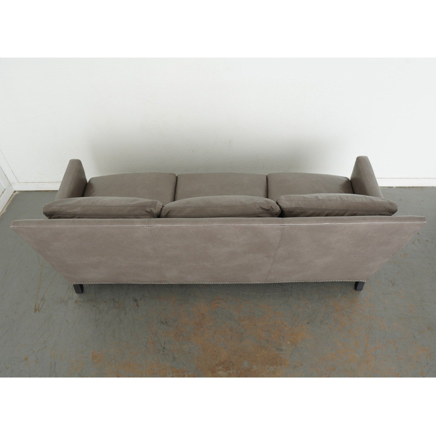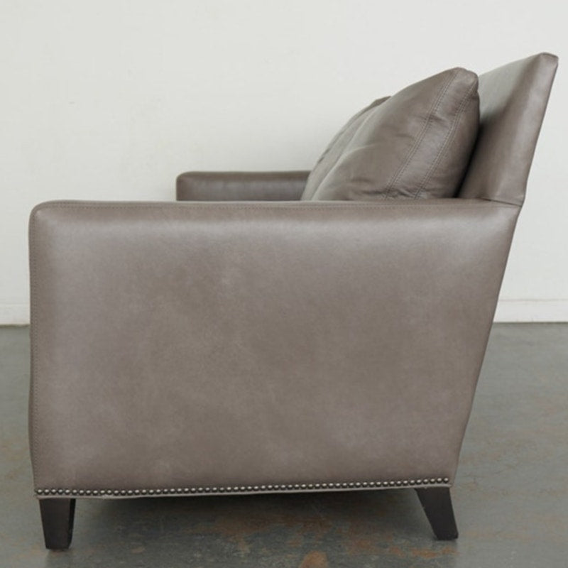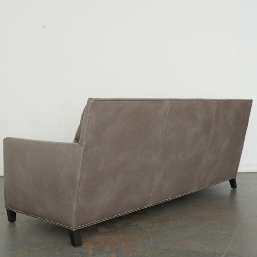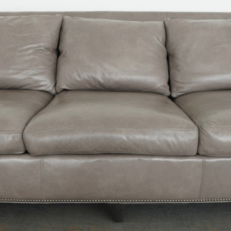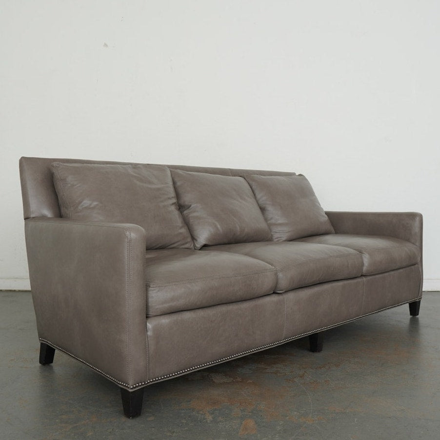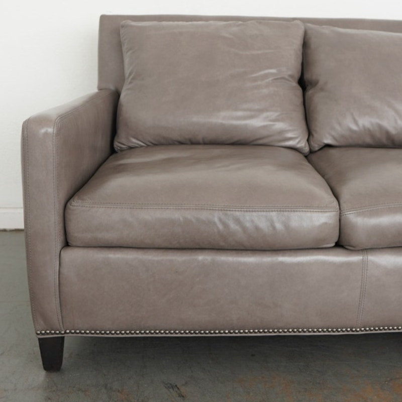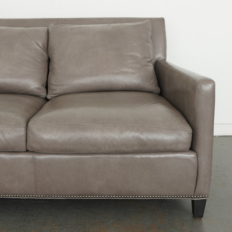 This Lee Industries sofa showcases a clean, tailored silhouette with a timeless, understated look that works effortlessly in a range of interiors. Upholstered in a soft gray leather, the design features broad track arms, three generously sized seat cushions, and a structured back that balances comfort with a refined profile. Subtle nailhead trim along the base adds a quiet decorative detail, while tapered wood legs ground the piece with a classic finish. Made in the USA by Lee Industries, a brand known for its quality craftsmanship and attention to detail, this sofa is a versatile, well-built piece designed for everyday living without sacrificing style.