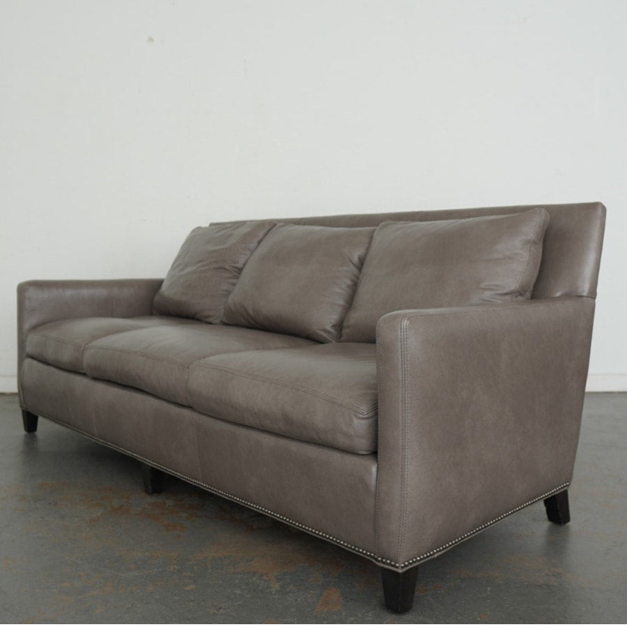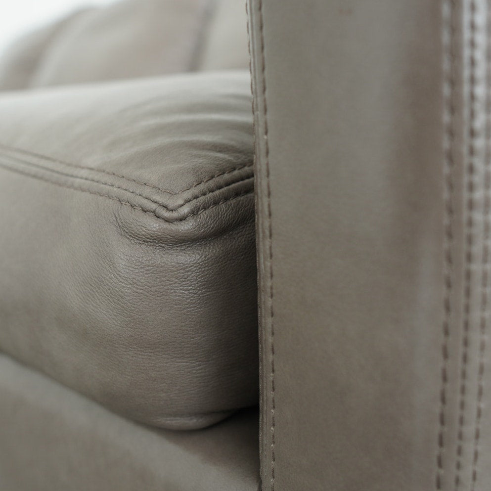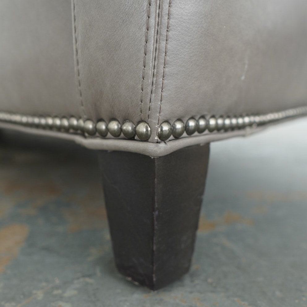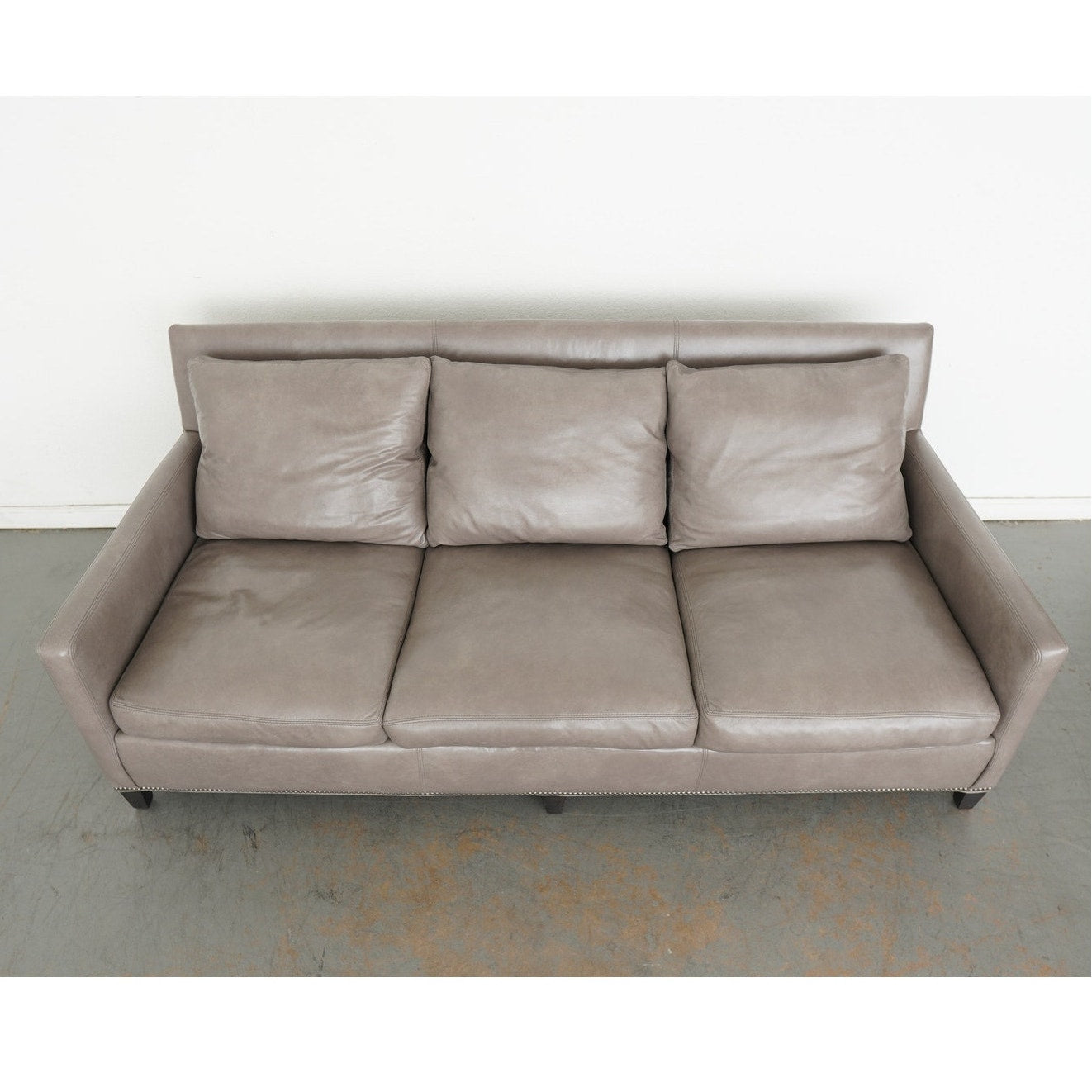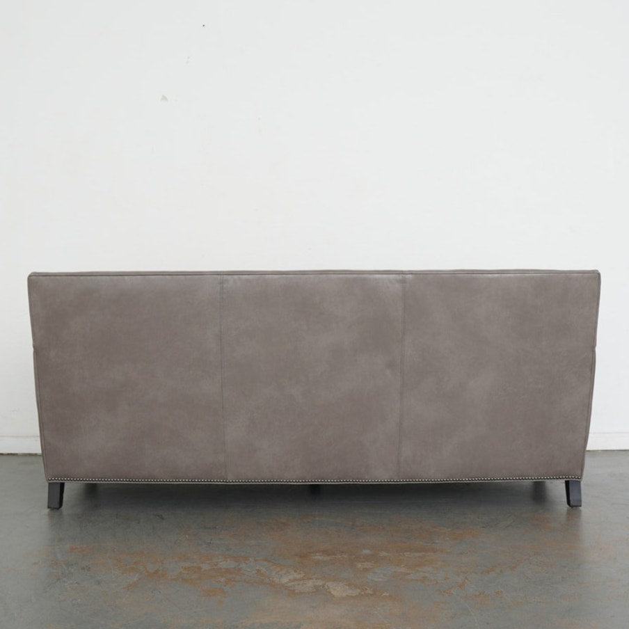 This Lee Industries sofa showcases a clean, tailored silhouette with a timeless, understated look that works effortlessly in a range of interiors. Upholstered in a soft gray leather, the design features broad track arms, three generously sized seat cushions, and a structured back that balances comfort with a refined profile. Subtle nailhead trim along the base adds a quiet decorative detail, while tapered wood legs ground the piece with a classic finish. Made in the USA by Lee Industries, a brand known for its quality craftsmanship and attention to detail, this sofa is a versatile, well-built piece designed for everyday living without sacrificing style.