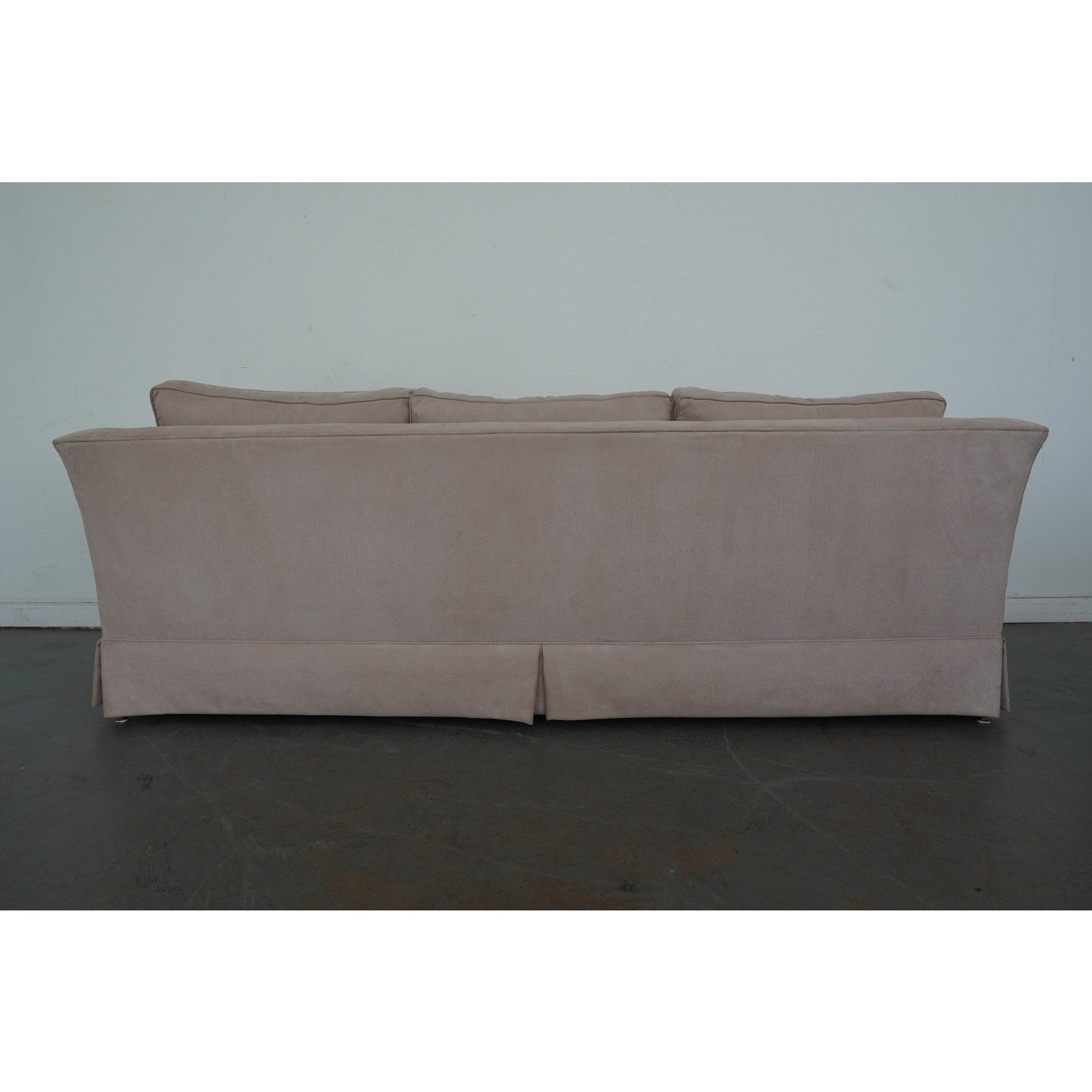 A classic three-seat sofa by Drexel Heritage, crafted in North Carolina and dating from the late 1970s to 1980s. This traditional piece features rolled arms, a tailored skirt, and loose seat and back cushions with matching side bolsters. It has been reupholstered in a very light tan suede fabric, applied in the same tailored manner as the original, preserving the sofa’s authentic silhouette. Built with Drexel Heritage’s signature quality and sturdy hardwood frame, it offers both comfort and enduring style.